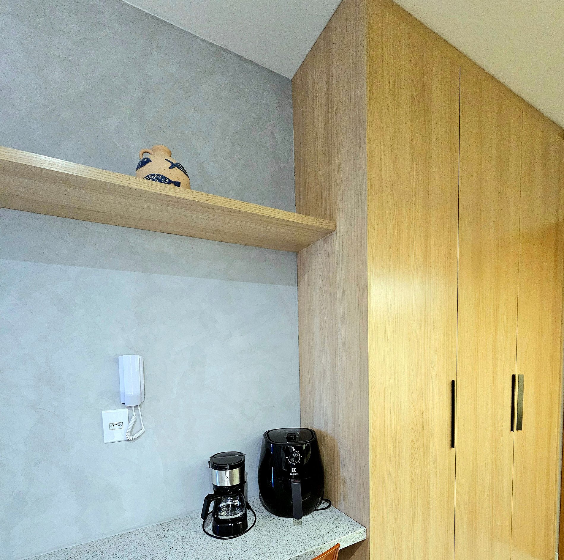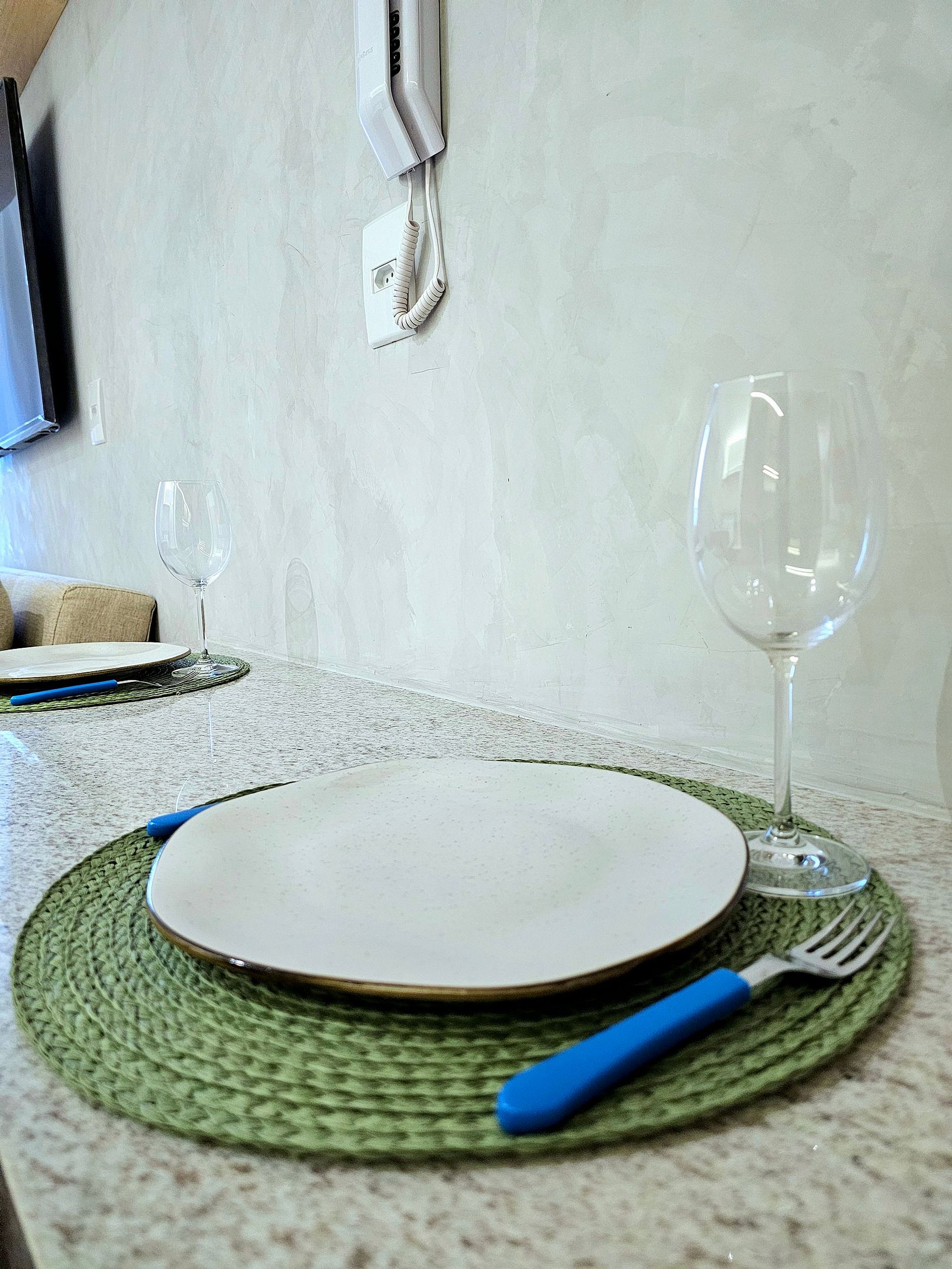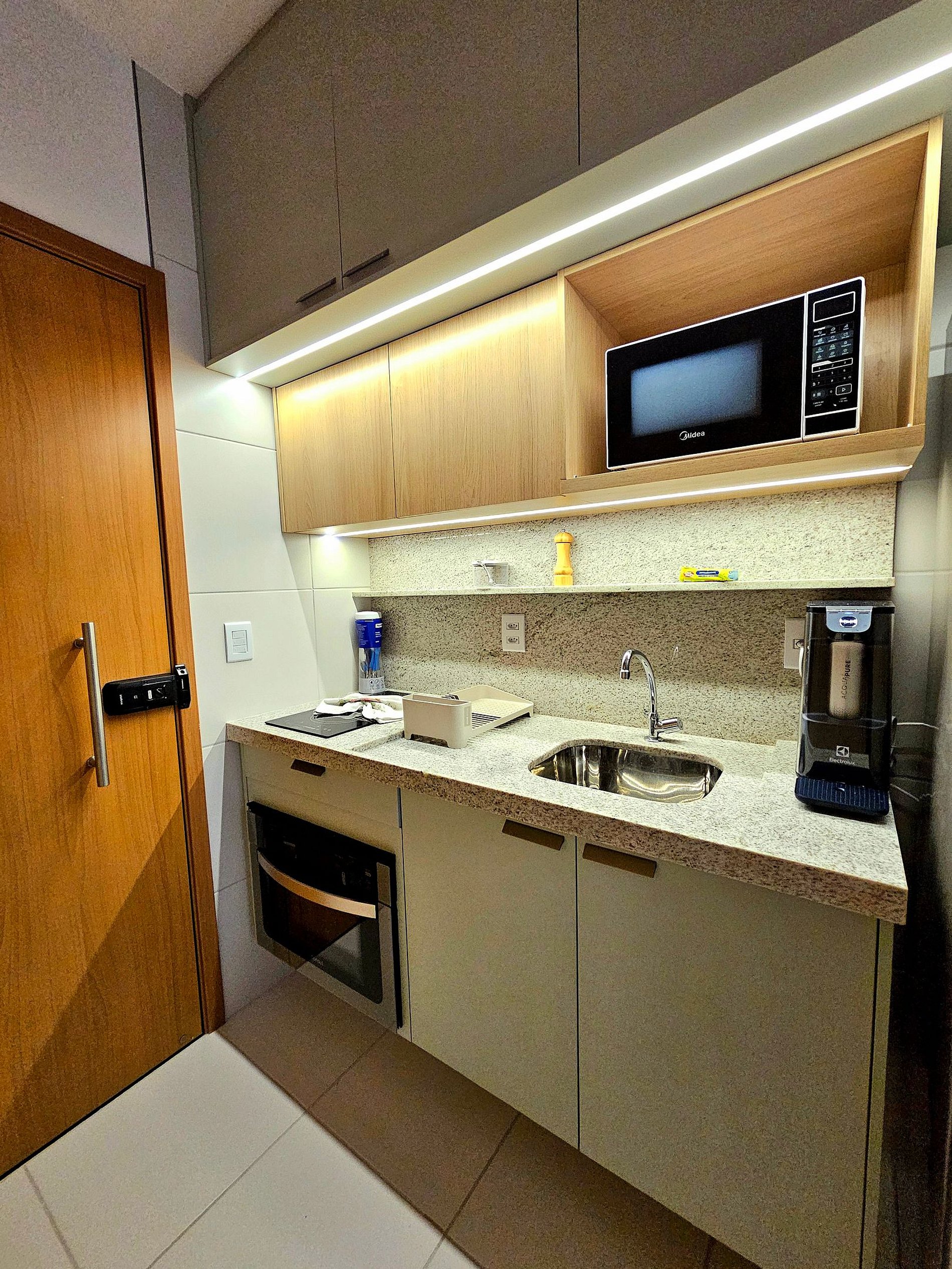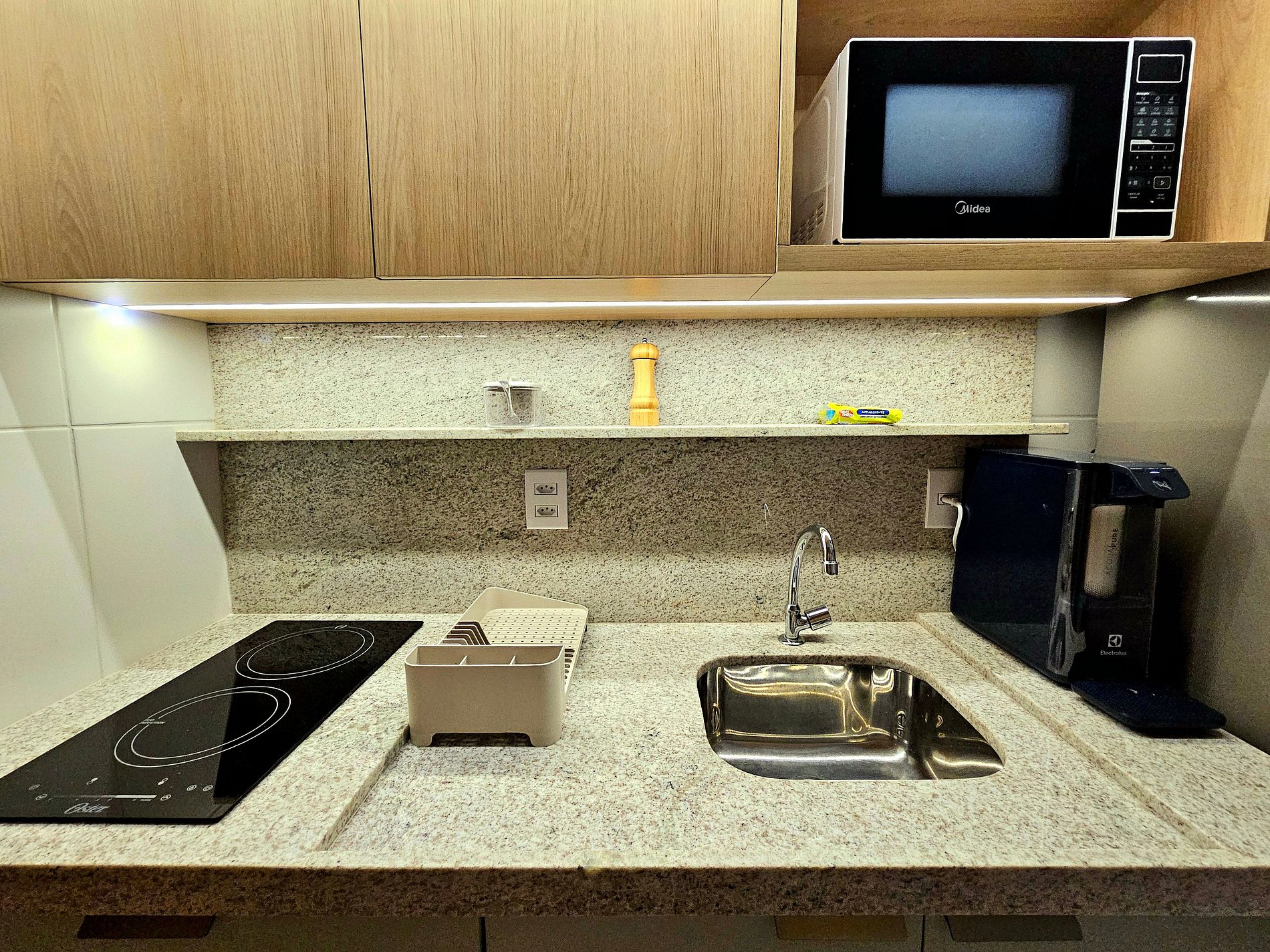 Possui cozinha completa e bem equipada, com os principais eletrodomésticos (Geladeira, cooktop, airfryer, cafeteira, sanduicheira, liquidificador...), além de ser bem completa em utensílios.