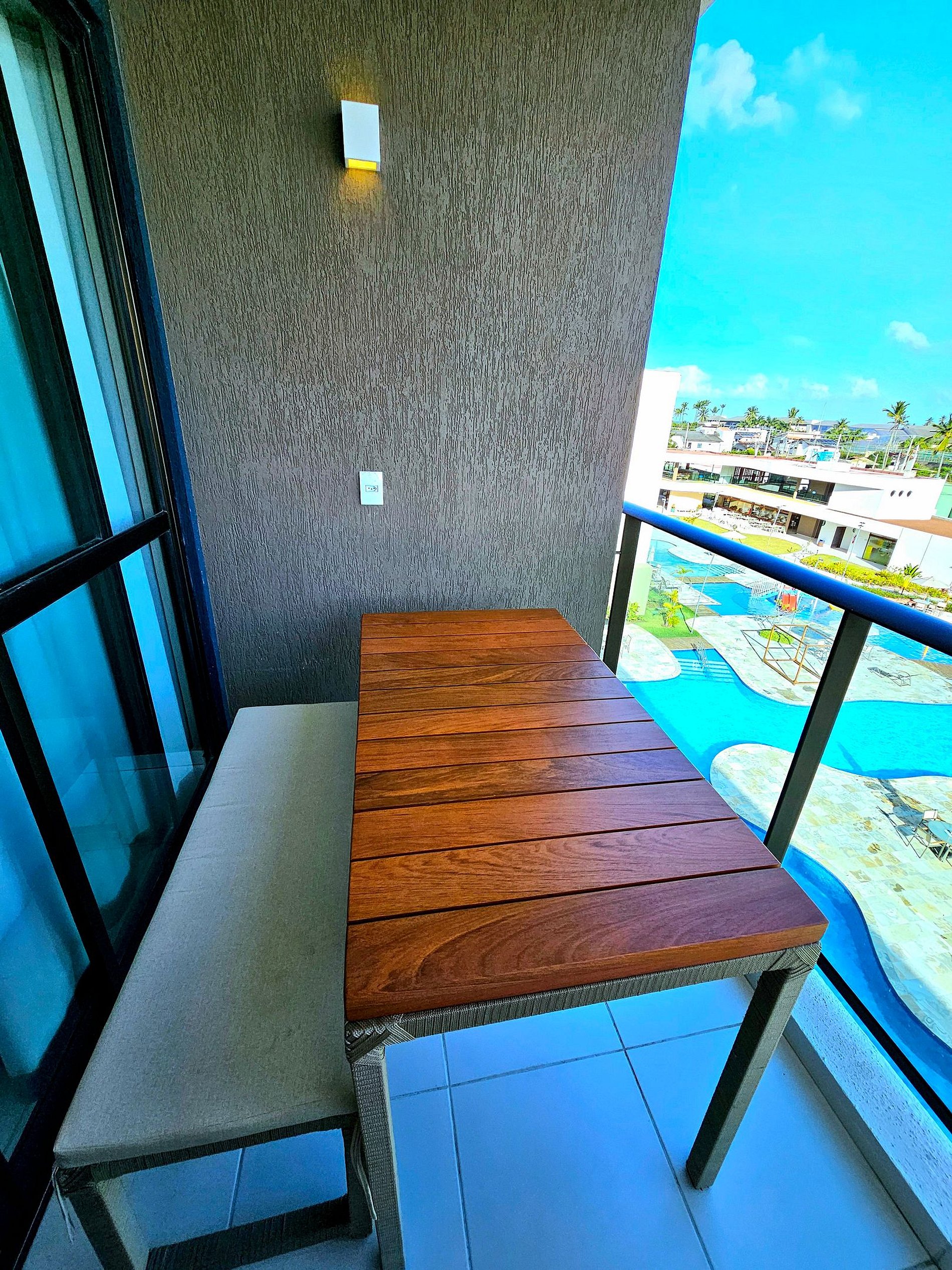 Pra finalizar temos uma varanda com mesa, um banco e uma excelente vista da piscina principal do condomínio.