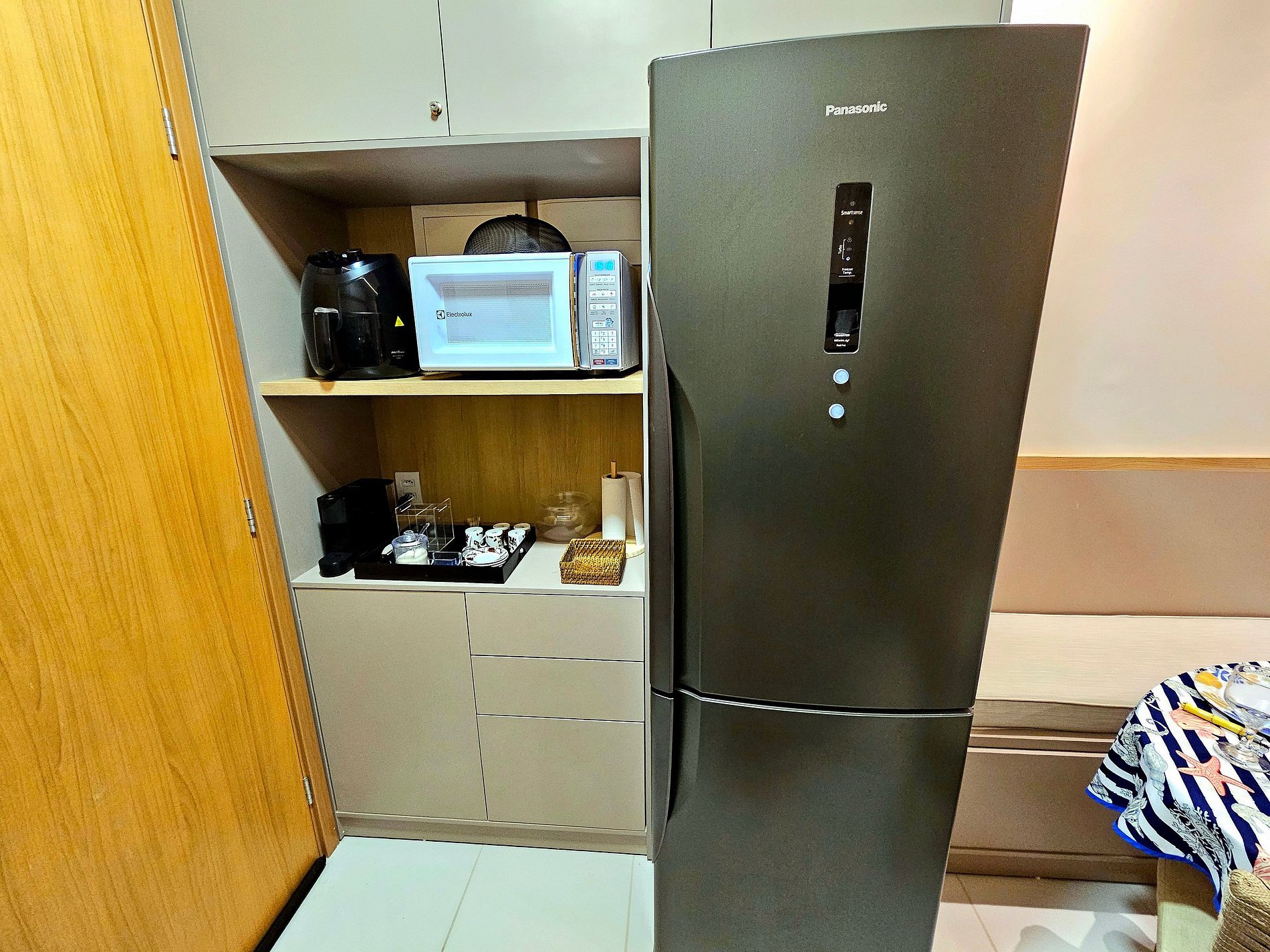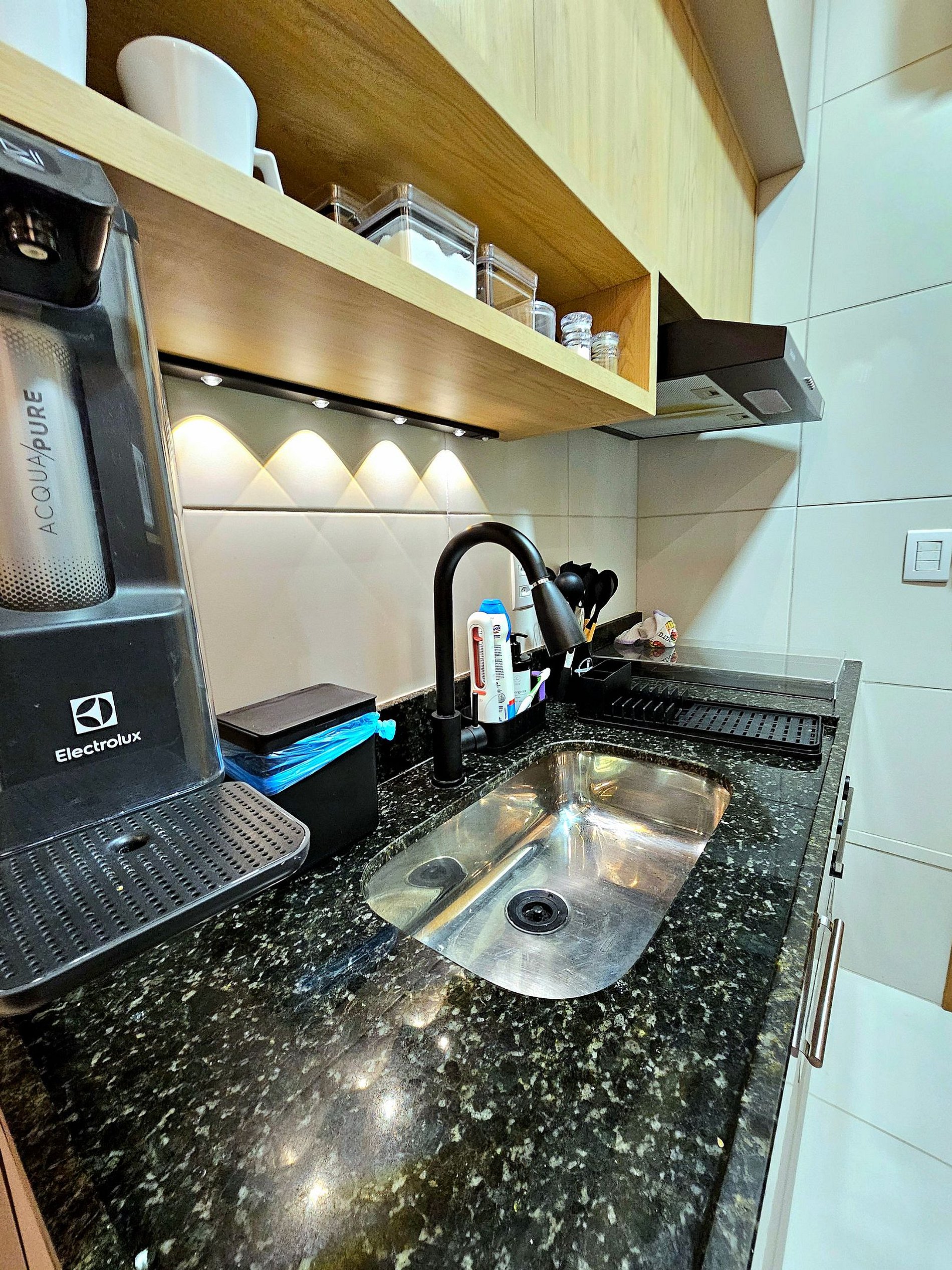 Possui cozinha completa e bem equipada, com os principais eletrodomésticos (Geladeira, cooktop, airfryer, cafeteira, sanduicheira, liquidificador...), além de ser bem completa em utensílios.