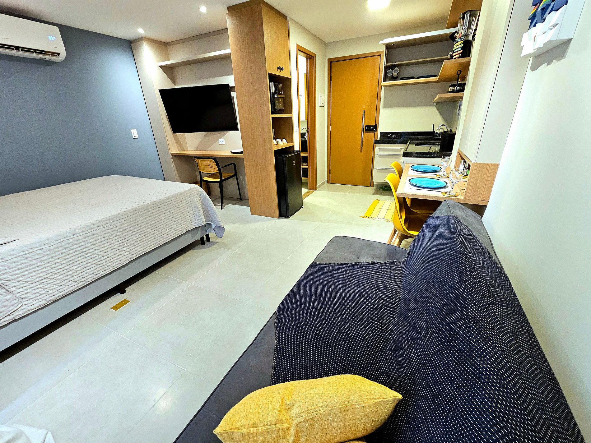 Esse Studio Deslumbrante foi finamente decorado, com muito carinho e bom gosto para proporcionar muito conforto e a sensação de bem-estar aos nossos hóspedes, oferece uma Cozinha completamente equipada com os principais eletrodomésticos: Airfryer, sanduicheira, liquidificador, cafeteira, frigobar, etc.