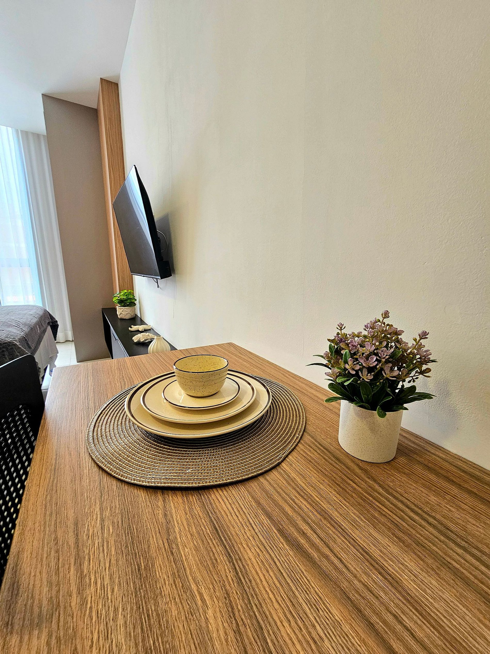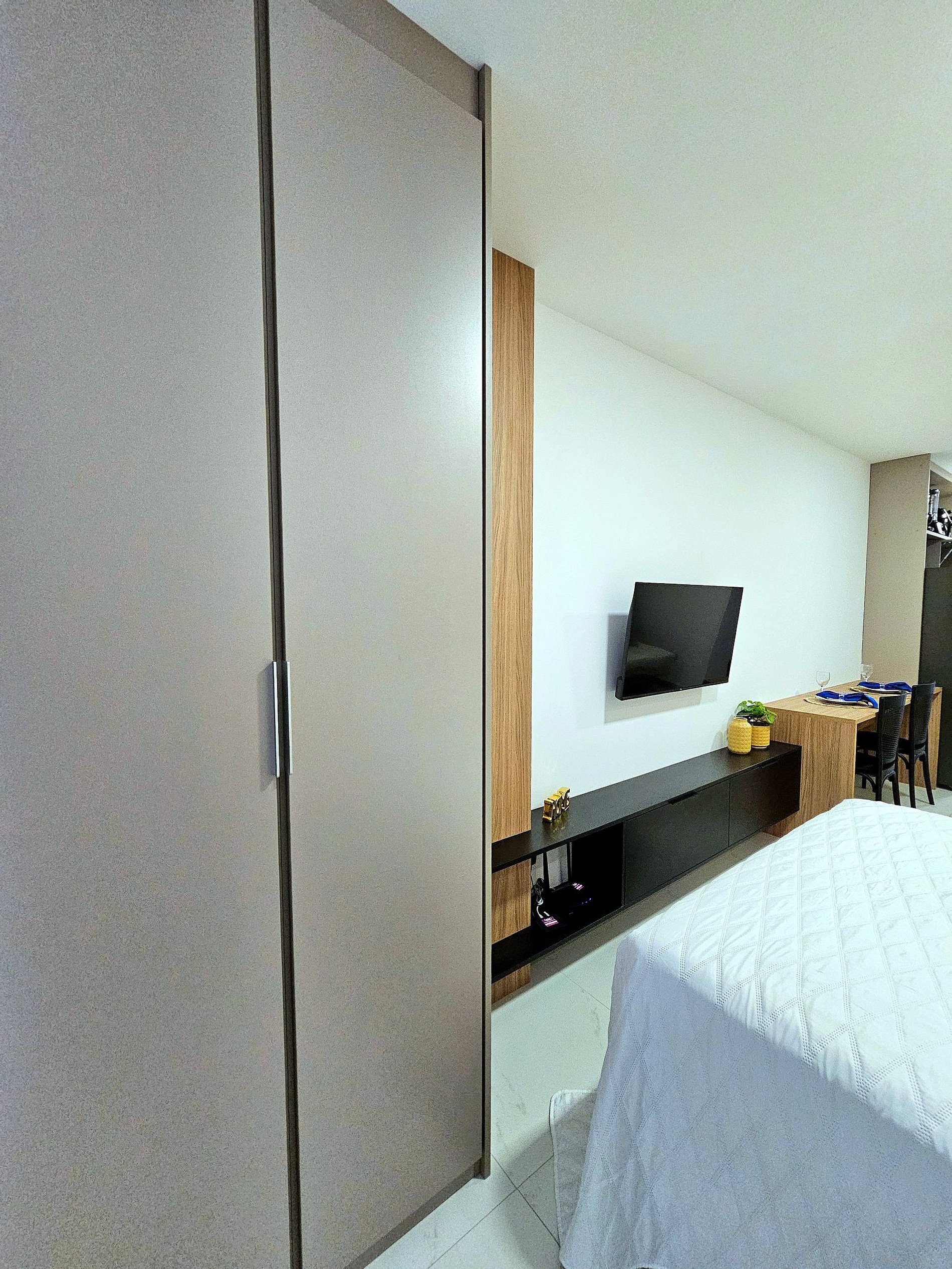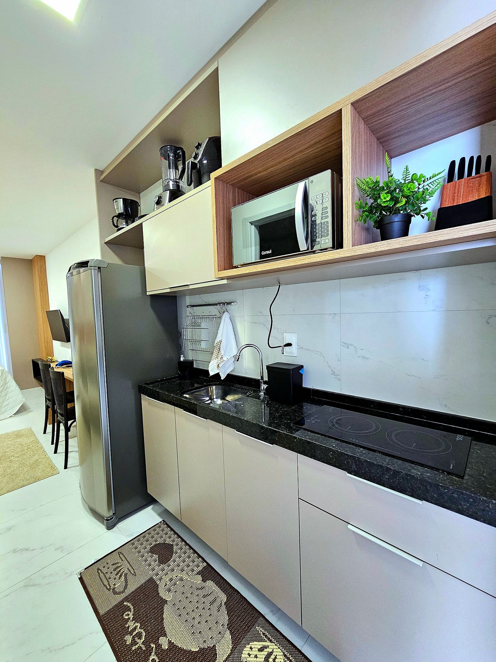 A decoração do apartamento é moderna e de muito bom gosto, com cores suaves e toques contemporâneos que criam um ambiente relaxante e acolhedor. A sala de estar é ampla e iluminada, equipada com uma TV de tela plana para que você possa desfrutar de seus programas favoritos. A cozinha é totalmente equipada com eletrodomésticos de alta qualidade, incluindo geladeira, fogão, micro-ondas, cafeteira, liquidificador, sanduicheira, airfryer, além de todos os utensílios necessários para preparar refeições deliciosas. Seja um café da manhã simples ou um jantar completo, você terá tudo à mão. O apartamento também conta com ar-condicionado, proporcionando um clima agradável durante toda a sua estadia, independentemente do tempo lá fora. As roupas de cama e toalhas são de alta qualidade, assegurando que sua experiência seja confortável e sem preocupações.