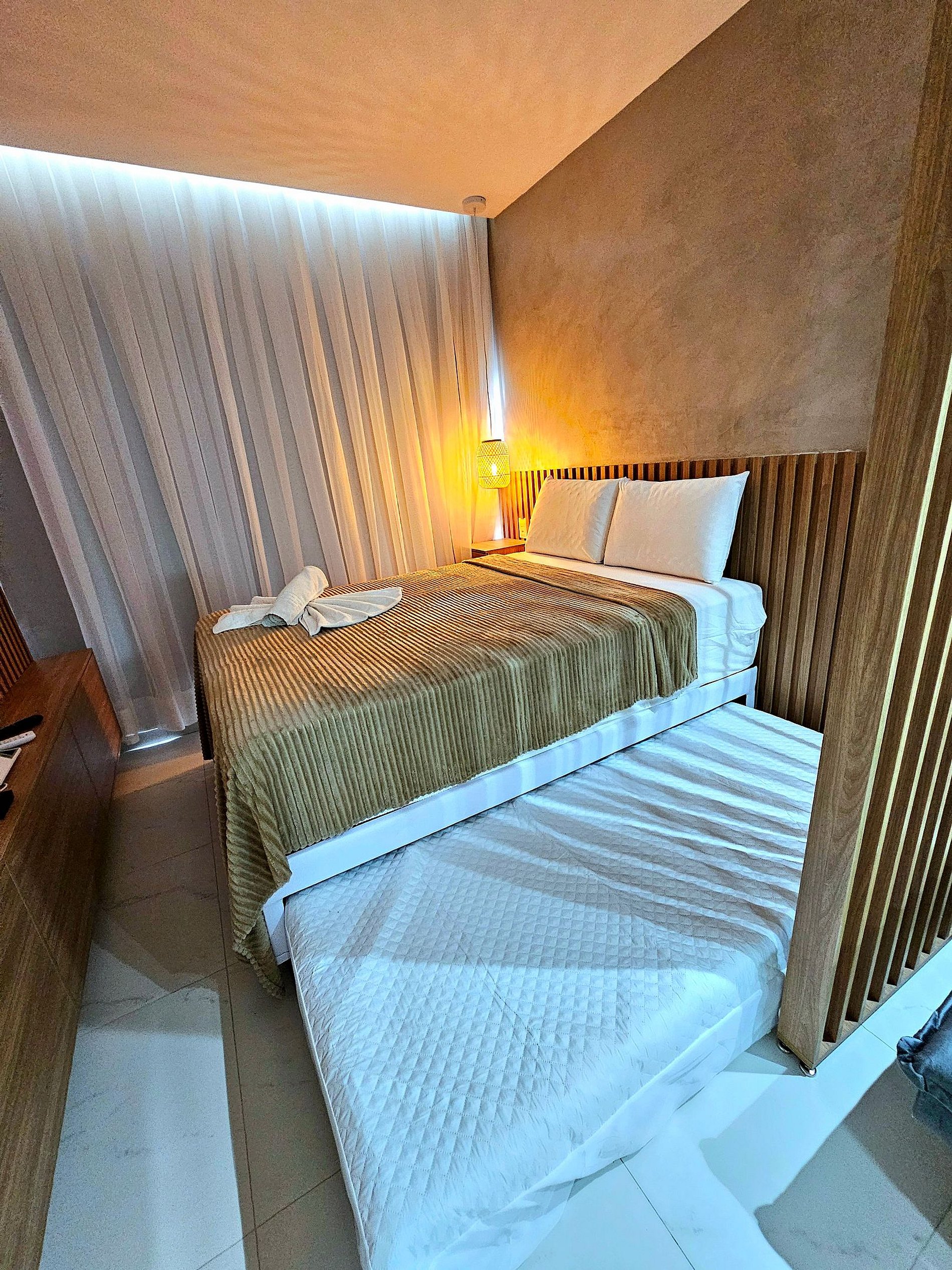 * Acomoda até 5 Pessoas:O apartamento comporta até 5 pessoas com total conforto. Ele dispõe de uma cama de casal espaçosa e confortável, uma cama auxiliar para acomodar mais um hóspede e um sofá-cama, perfeito para dois hóspedes adicionais. O ambiente é ideal para famílias ou pequenos grupos de amigos que desejam compartilhar momentos juntos, sem abrir mão de conforto.