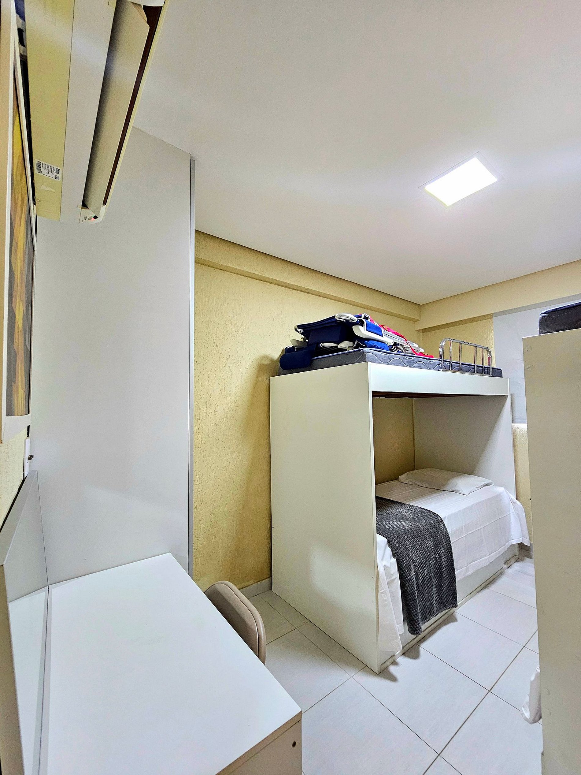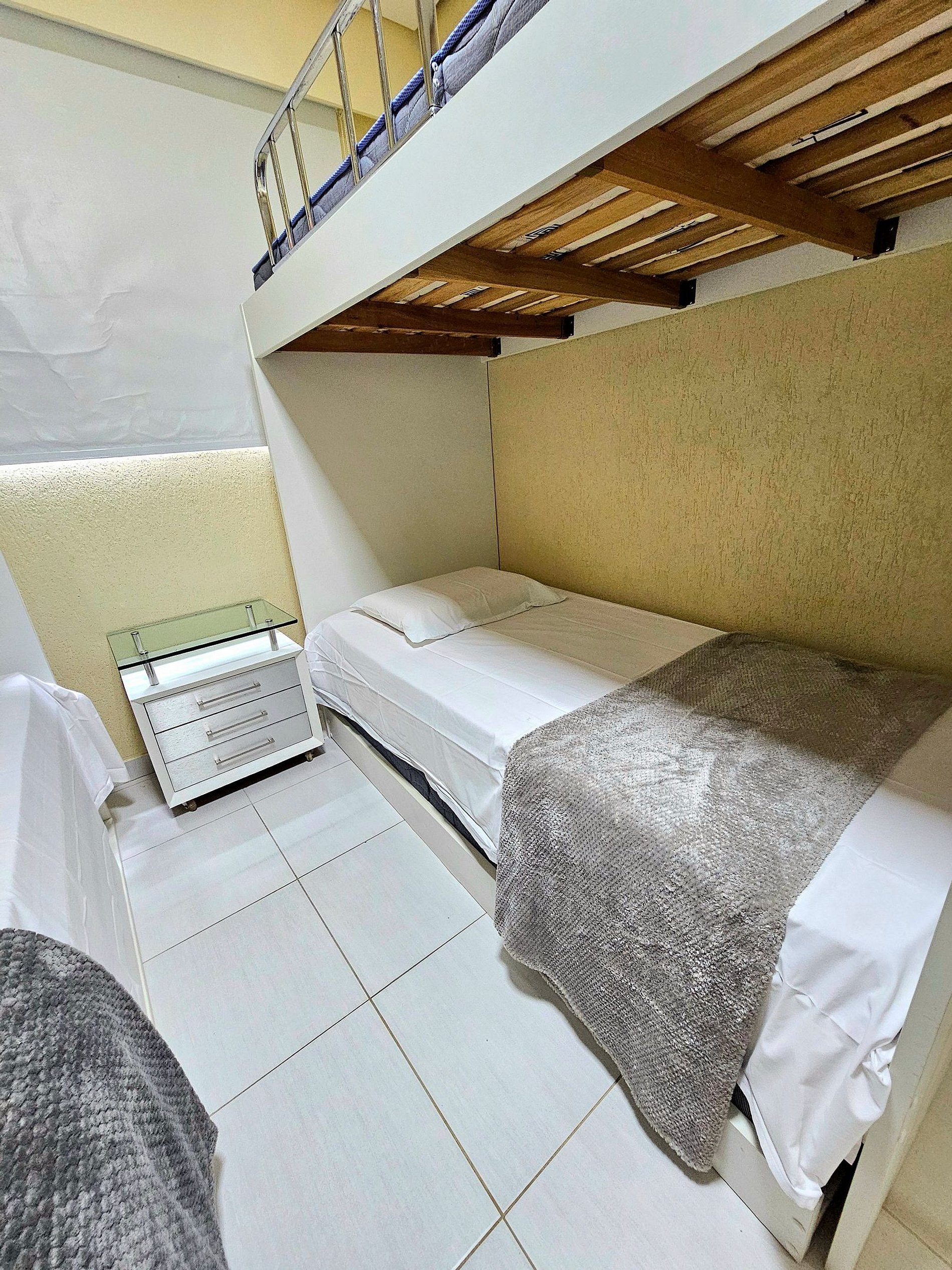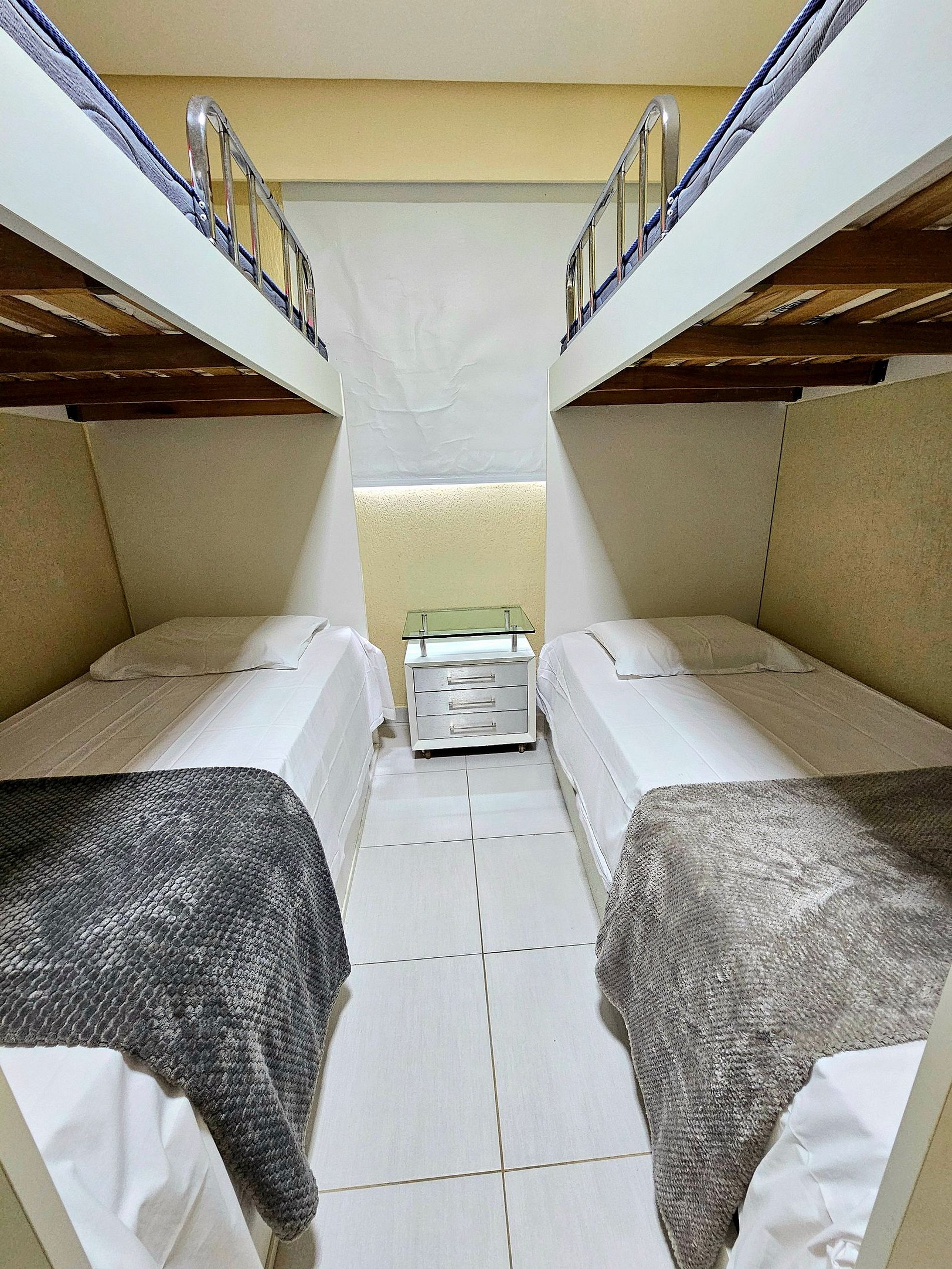 O segundo quarto conta com duas camas de solteiro e 1 cama auxiliar, ideal para acomodar crianças ou amigos