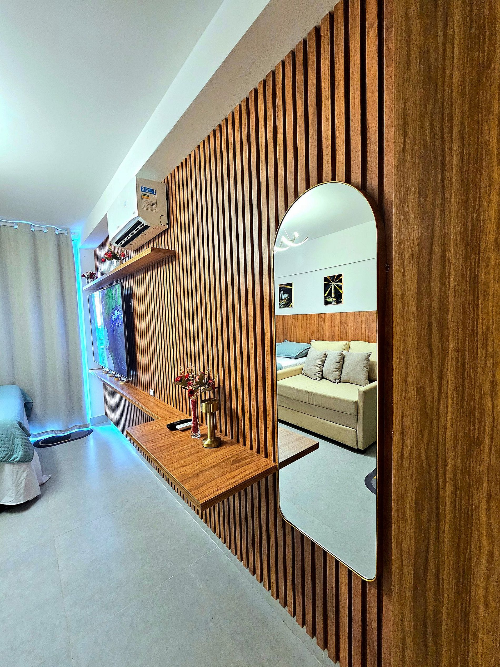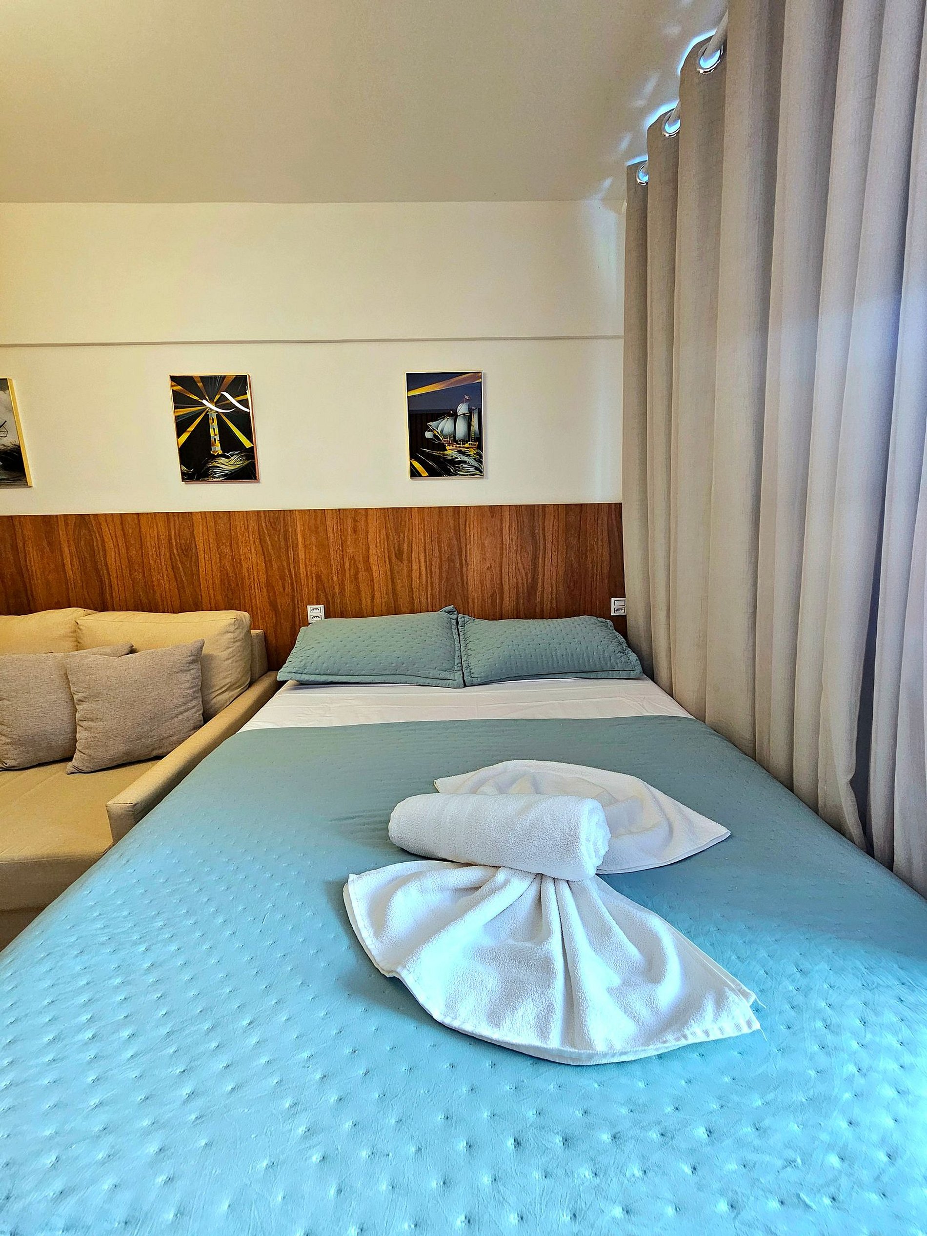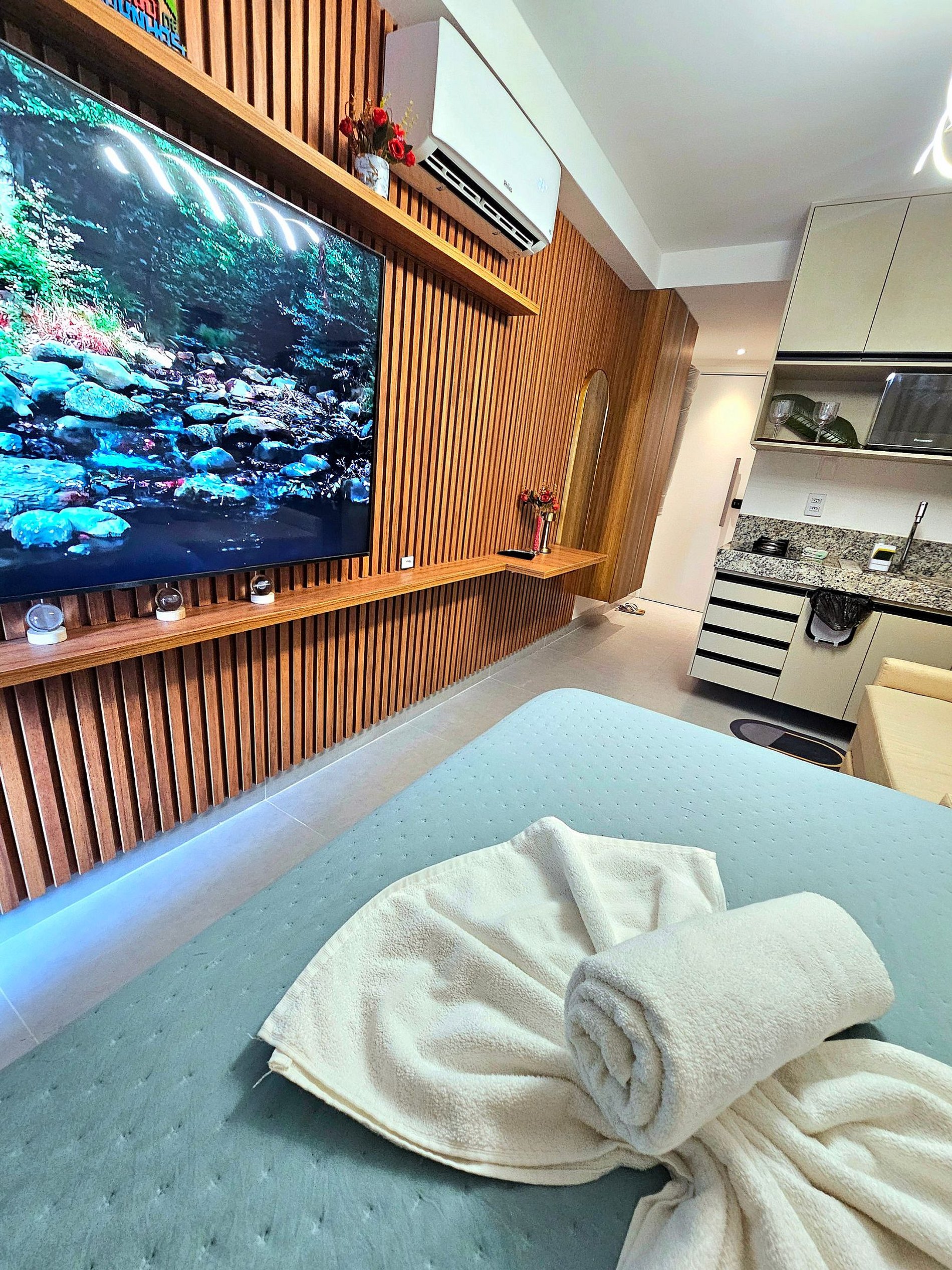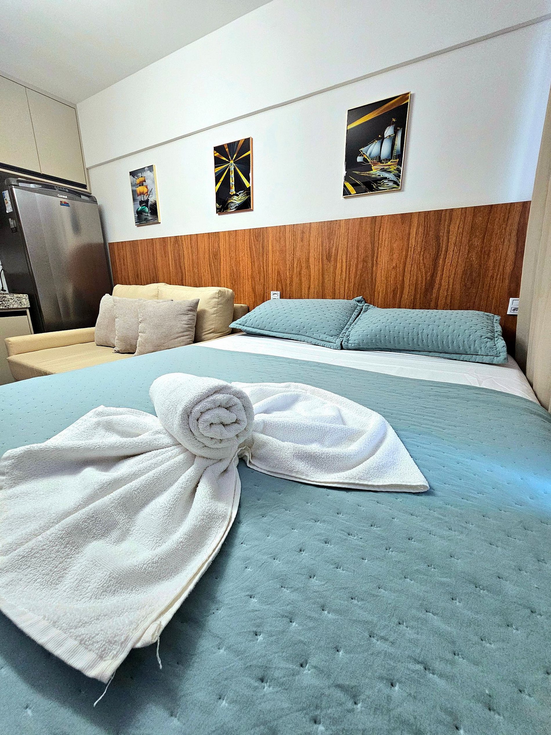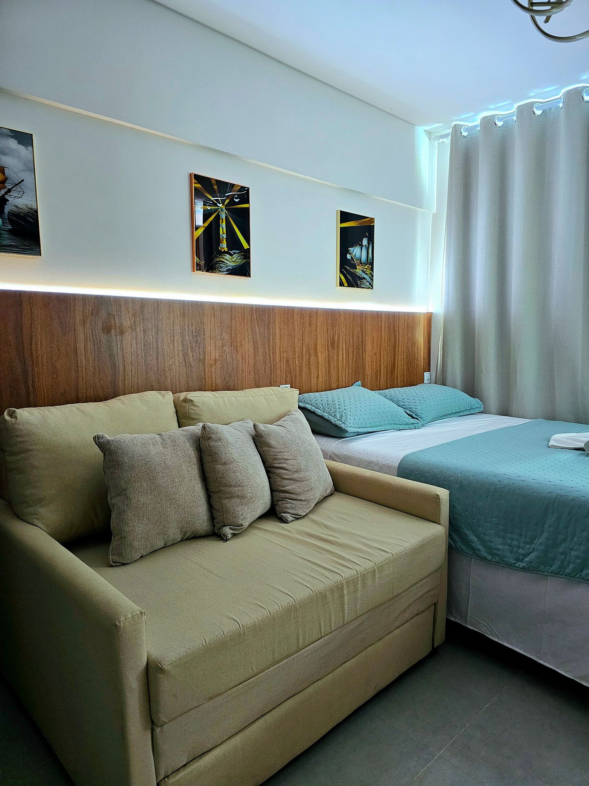 O studio acomoda confortavelmente até três hóspedes, dispondo de uma cama de casal e Excelente sofá-cama, Possui uma iluminação moderna para proporcionar bastante conforto e utilizar em diferentes momentos (quando quiser uma iluminação maior para um preparo de uma refeição por exemplo, ou uma iluminação mais baixa para um momento de descanso)