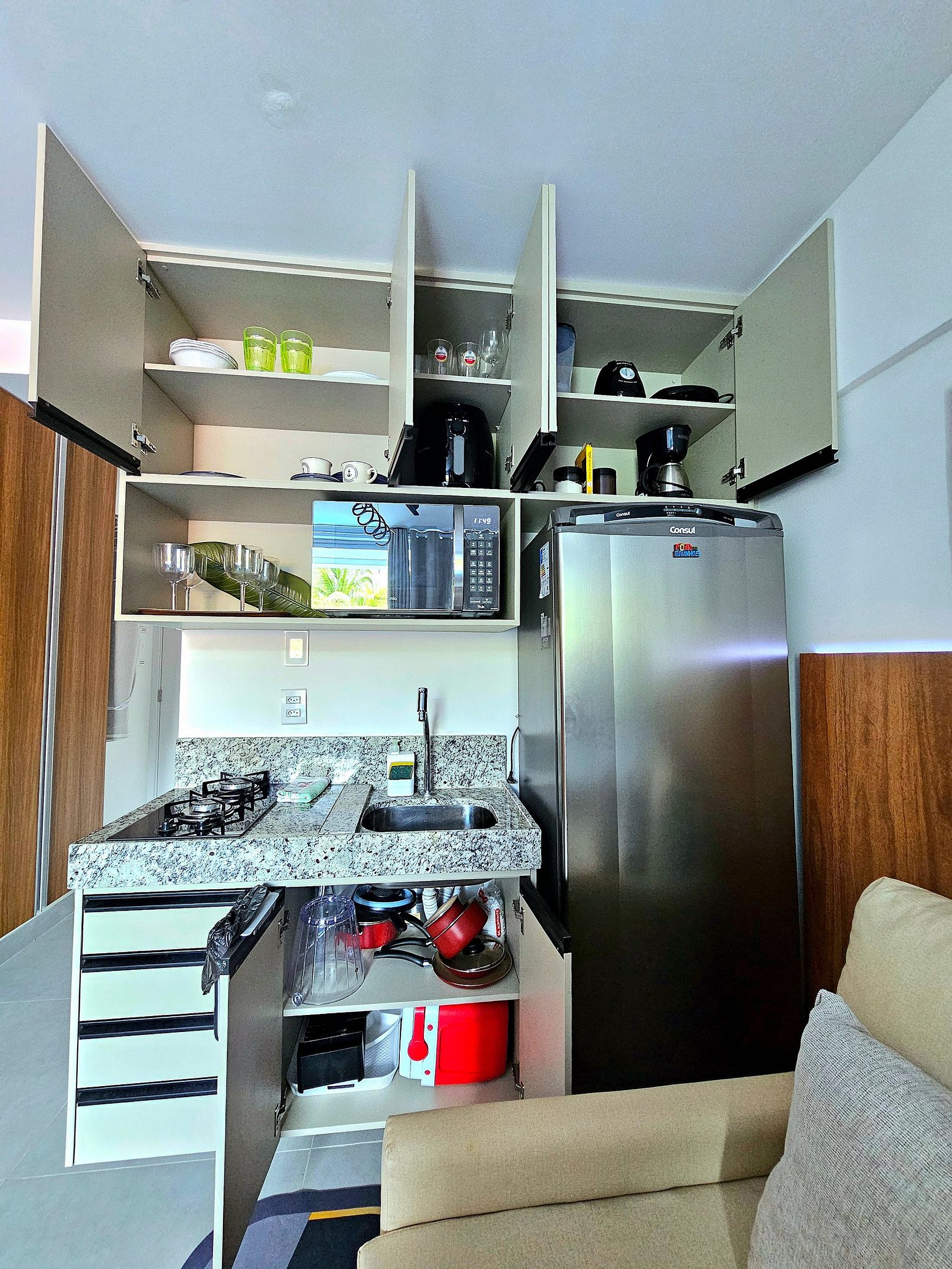 Cozinha Equipada Prepare suas refeições com facilidade na cozinha bem equipada, que inclui os principais eletrodomésticos (Microondas, airfryer, sanduicheira, liquidificador, cafeteira) modernos. Seja para um café da manhã rápido antes de explorar a cidade ou para um jantar especial, você encontrará tudo o que precisa para cozinhar com praticidade e eficiência.