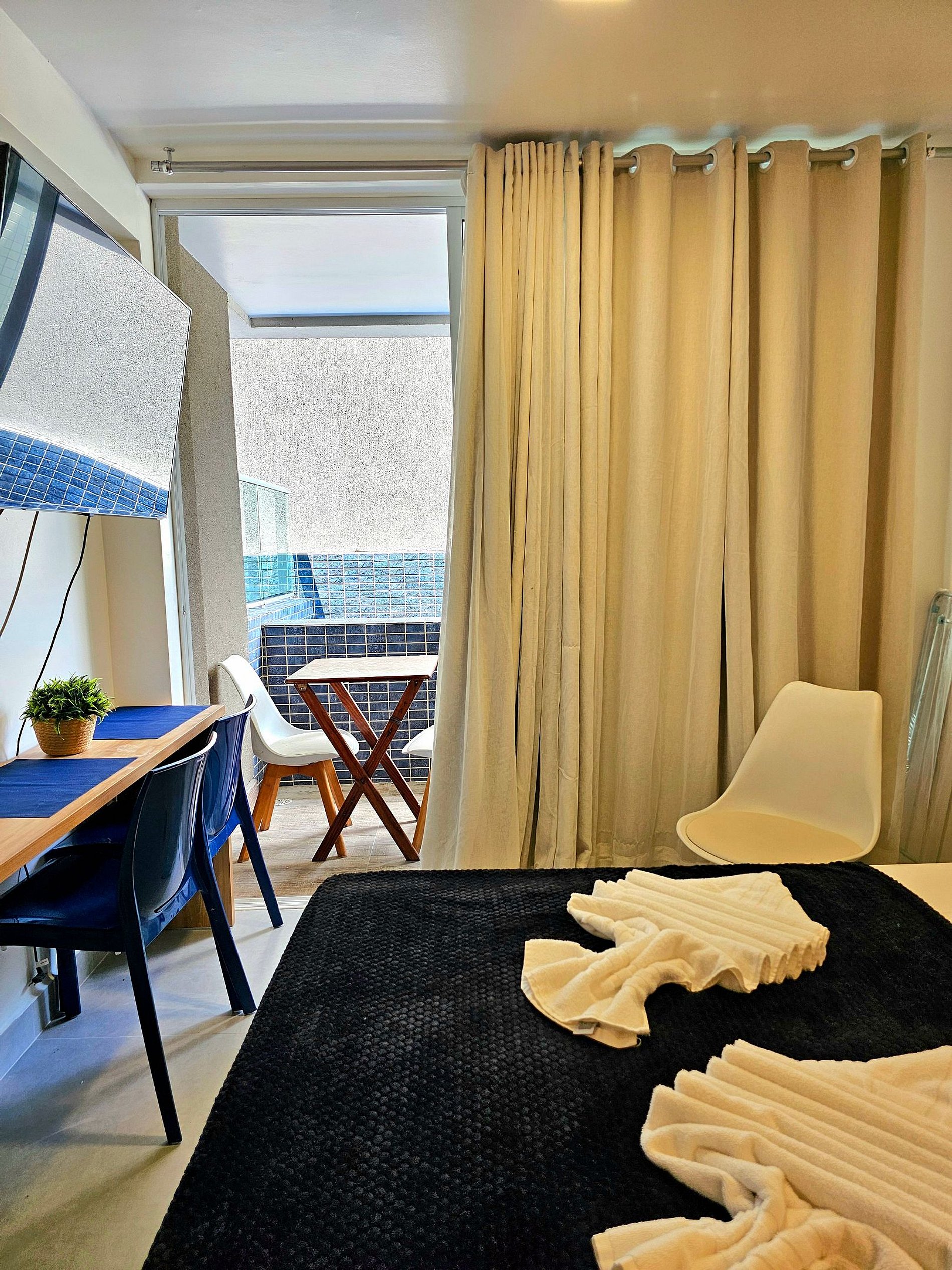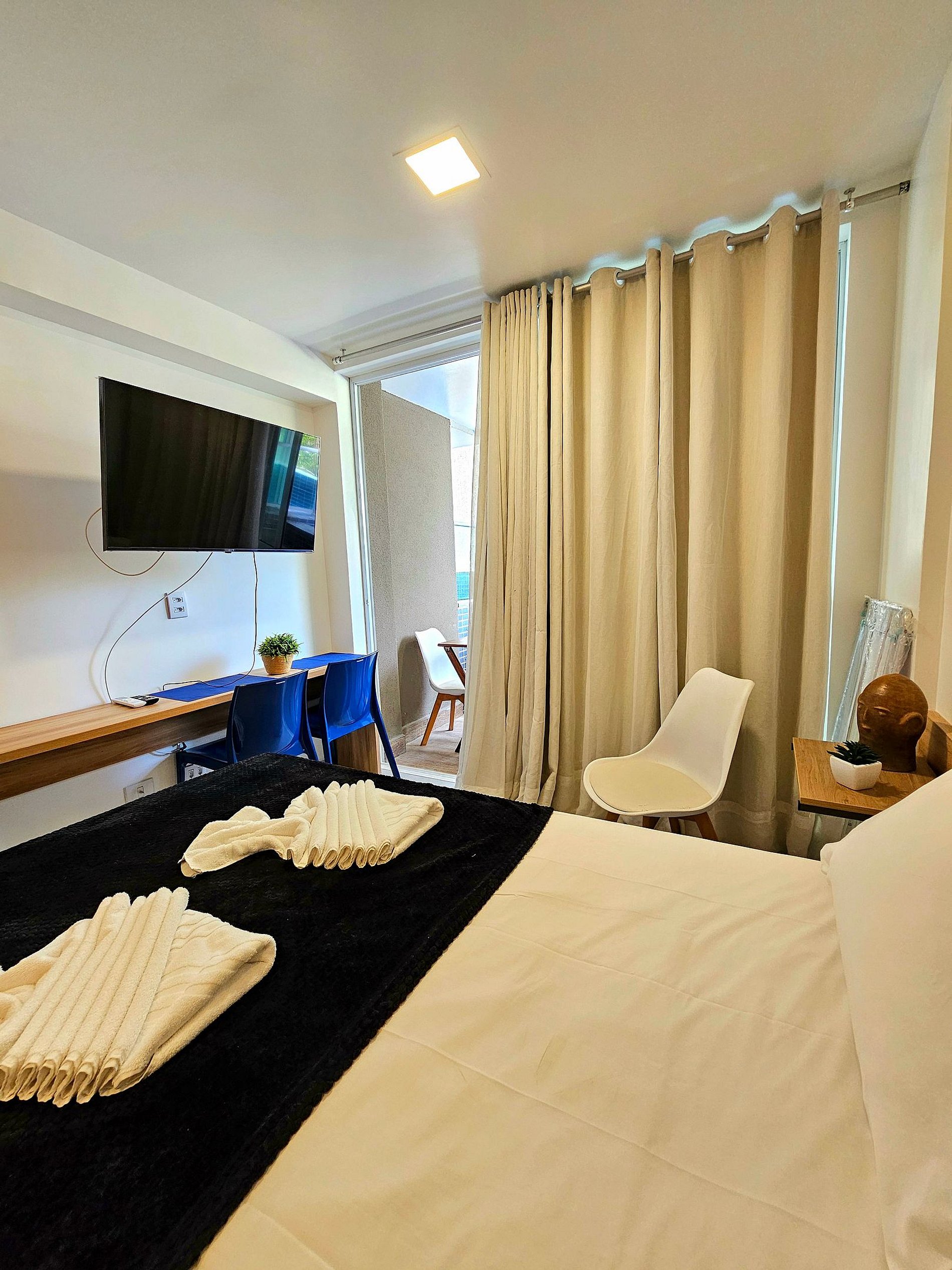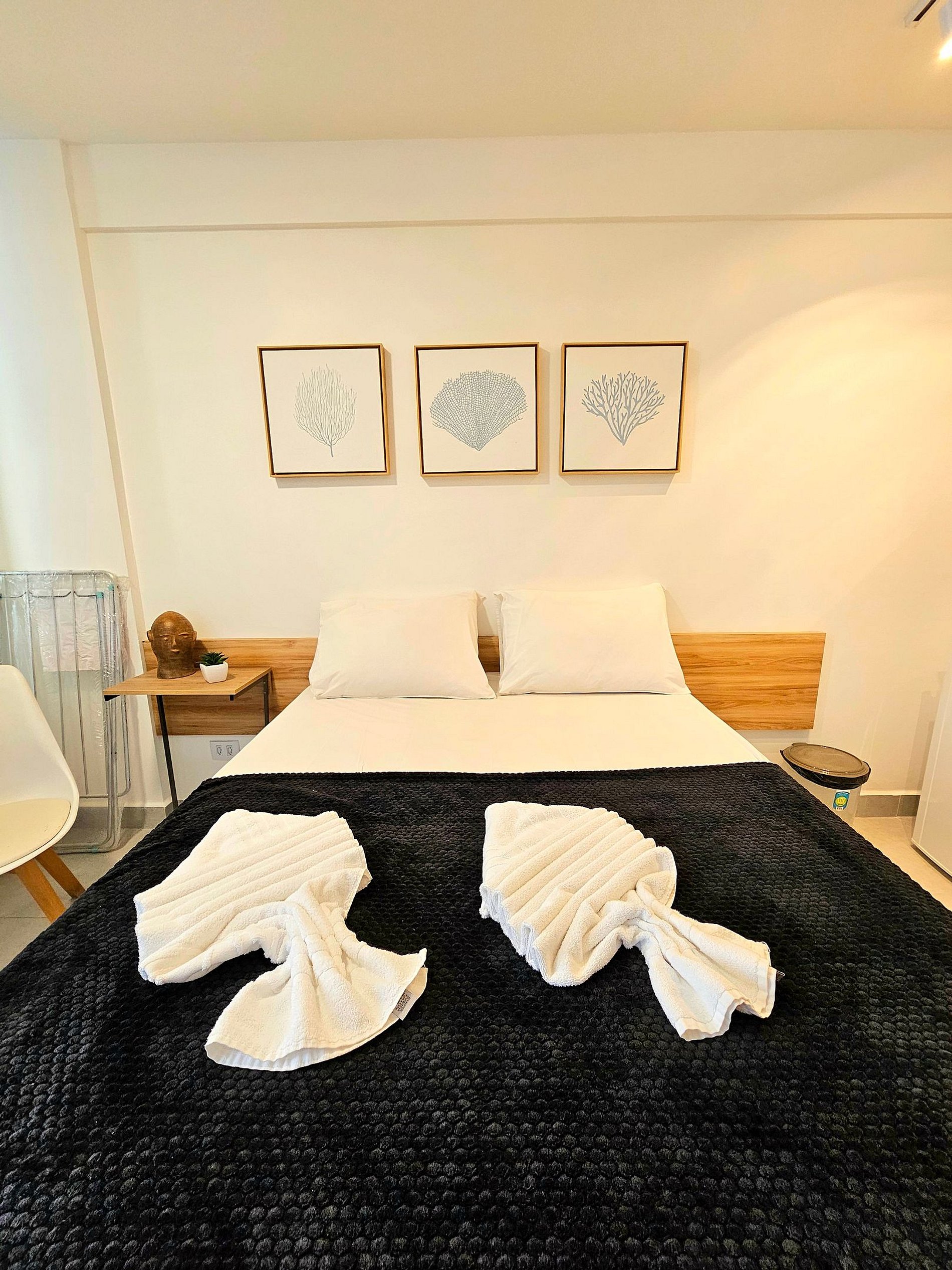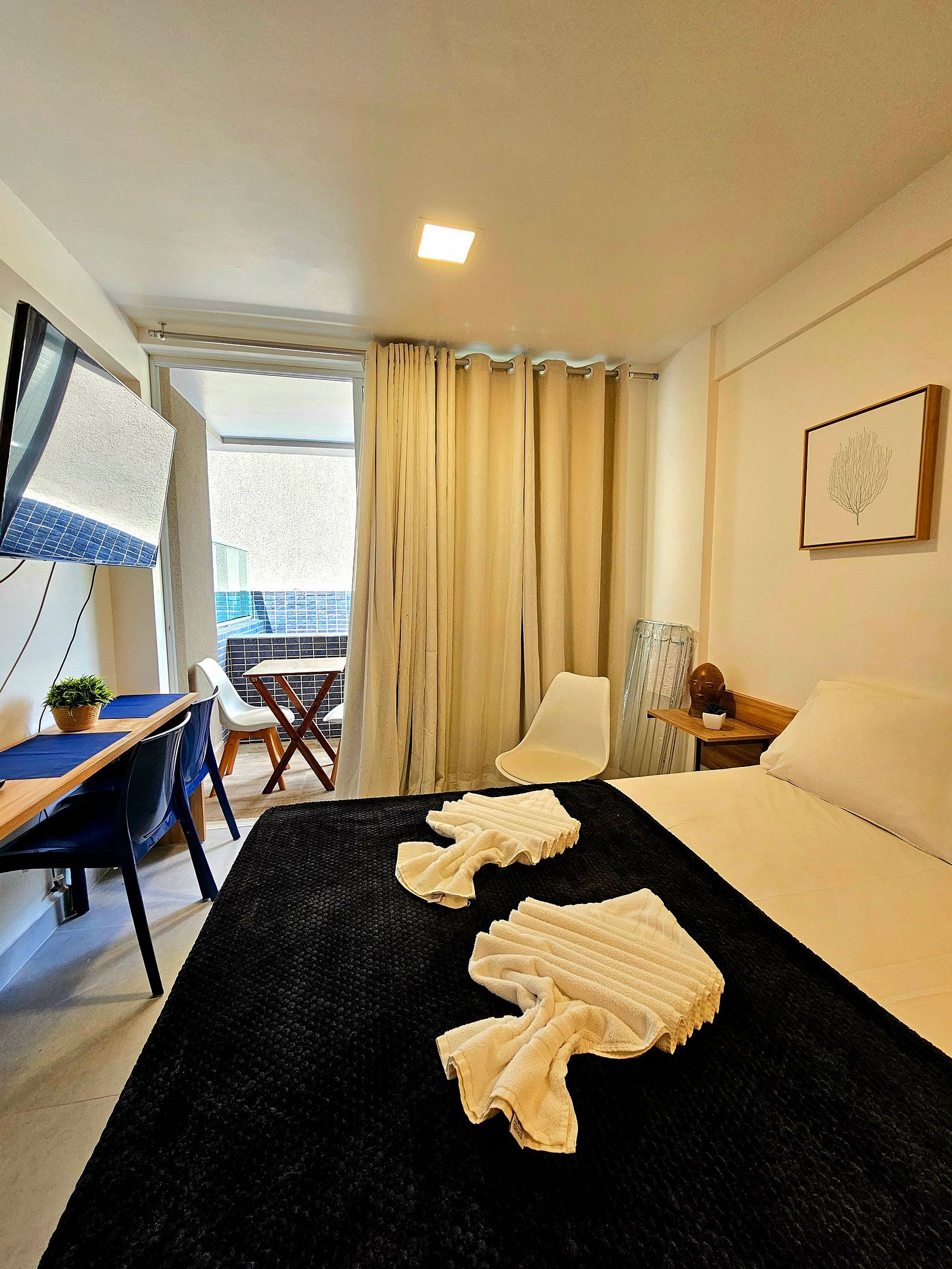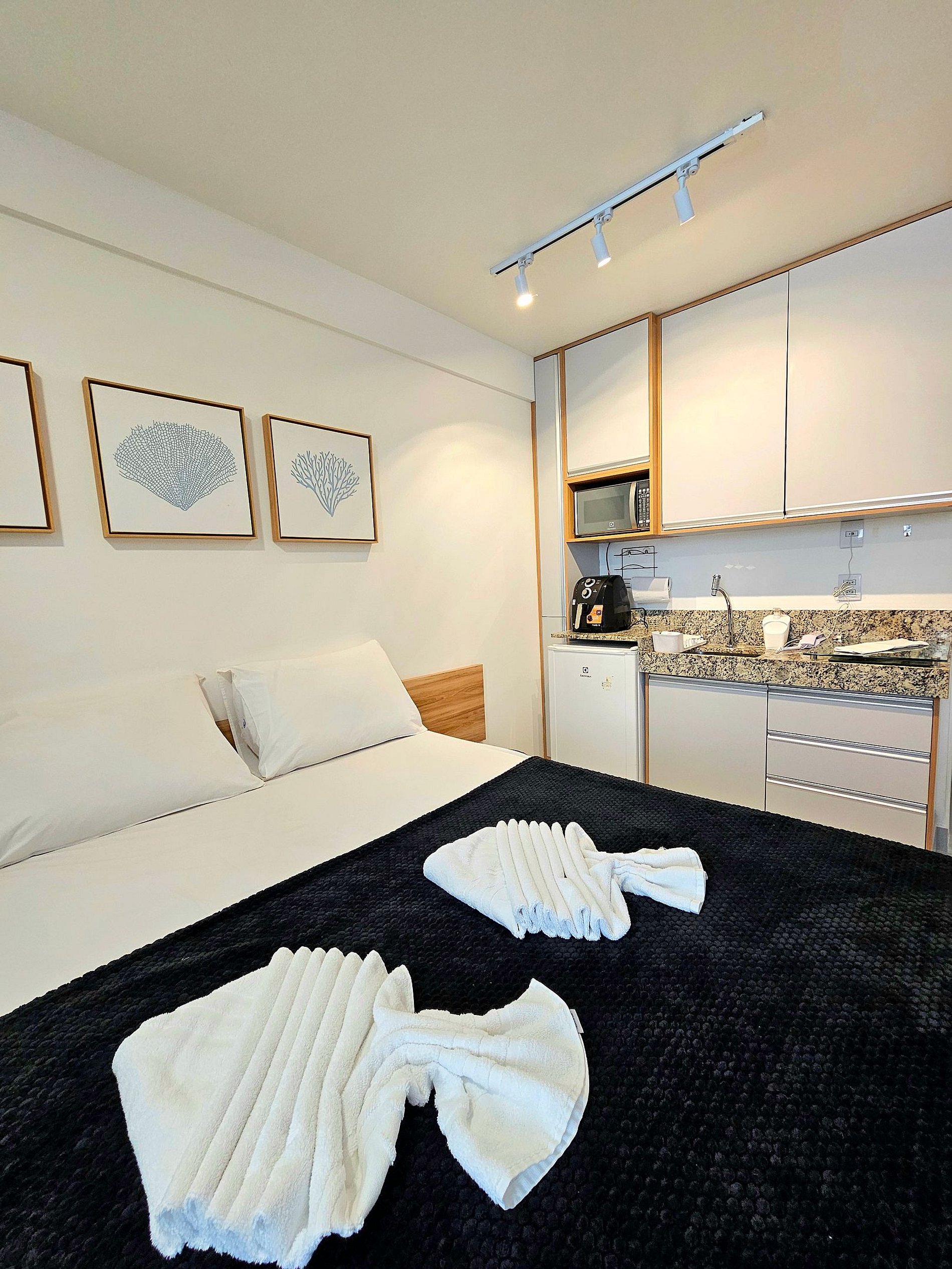 Conforto e Praticidade O studio acomoda confortavelmente até três hóspedes, dispondo de uma cama de casal e uma cama auxiliar. Cada elemento foi pensado para proporcionar o máximo de conforto e uma boa noite de sono.
