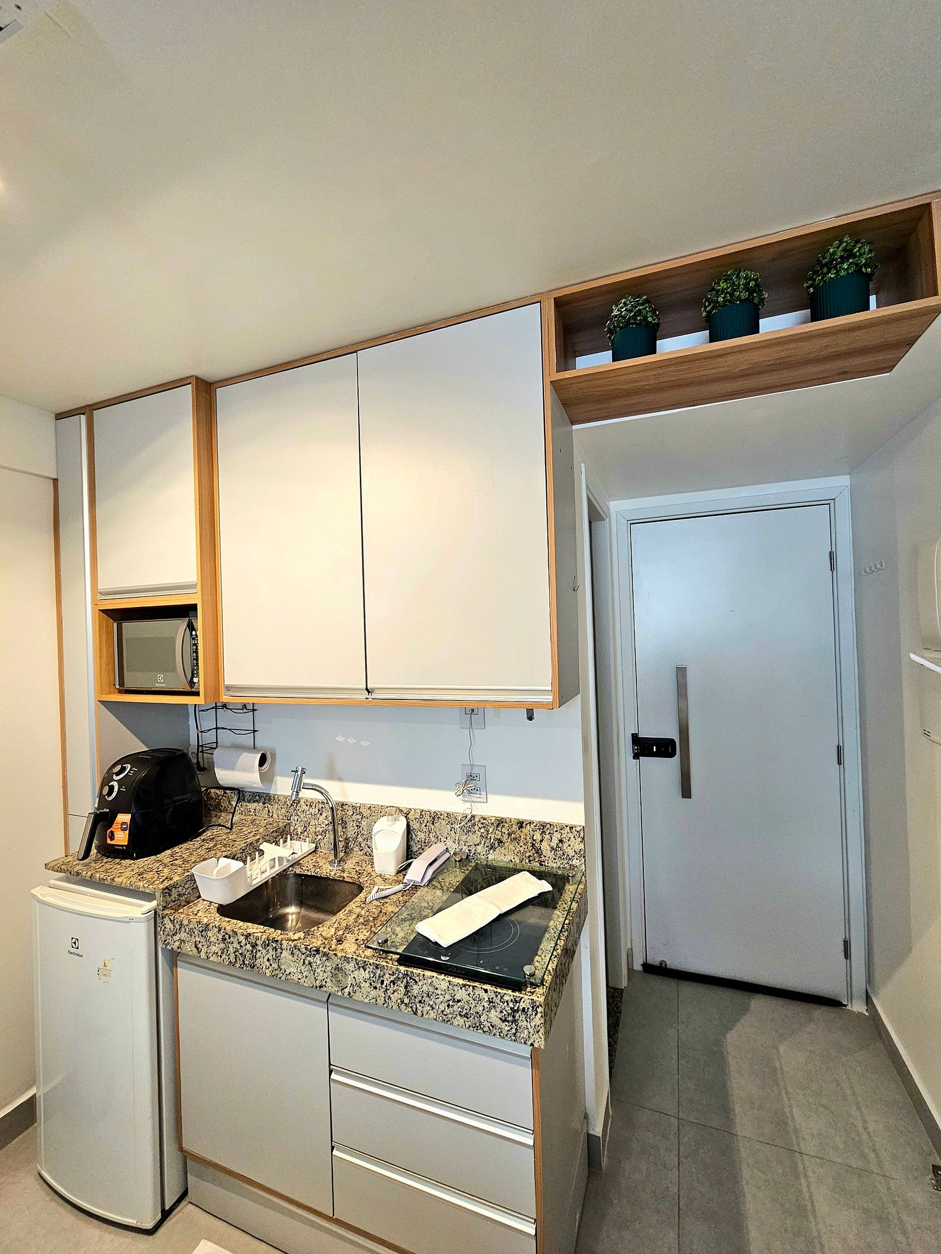 Cozinha Equipada Prepare suas refeições com facilidade na cozinha bem equipada, que inclui os principais eletrodomésticos modernos (Sanduicheiro, airfryer, liquidificador, cafeteira, microondas). Seja para um café da manhã rápido antes de explorar a cidade ou para um jantar especial, você encontrará tudo o que precisa para cozinhar com praticidade e eficiência.