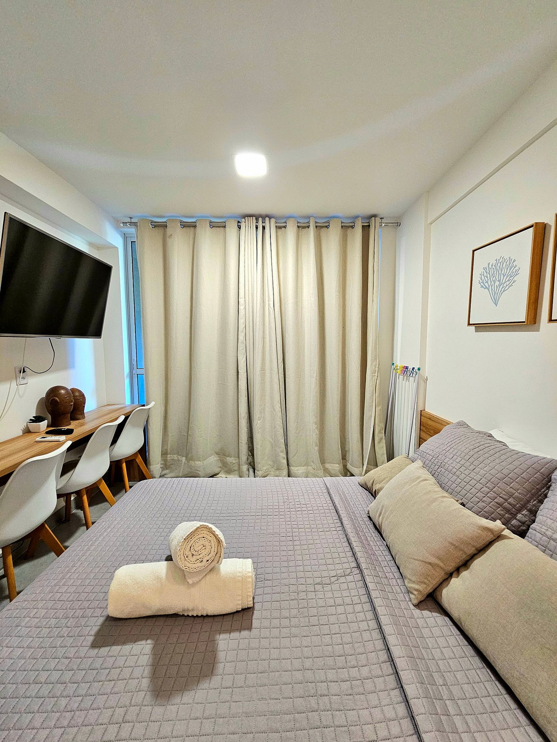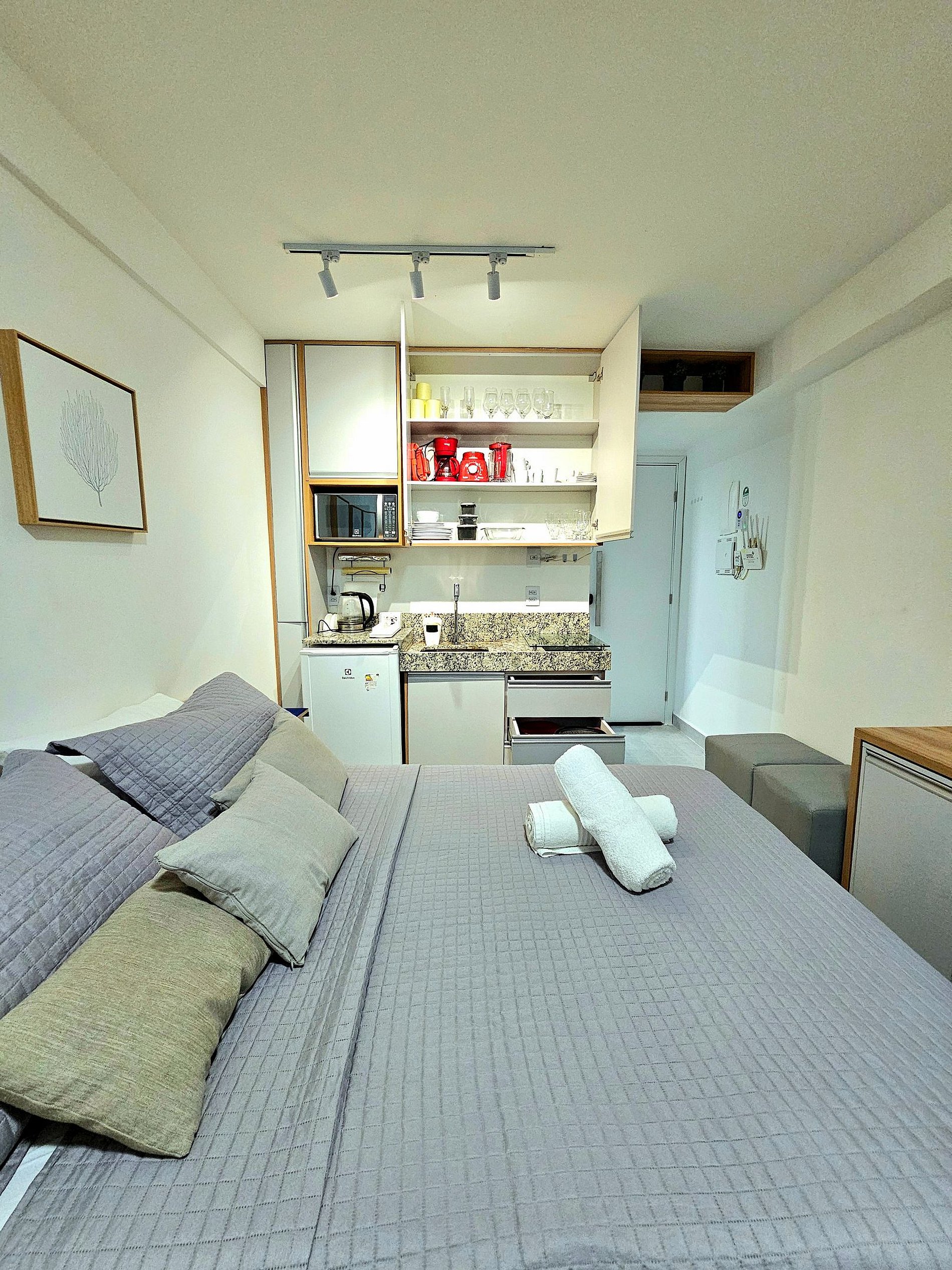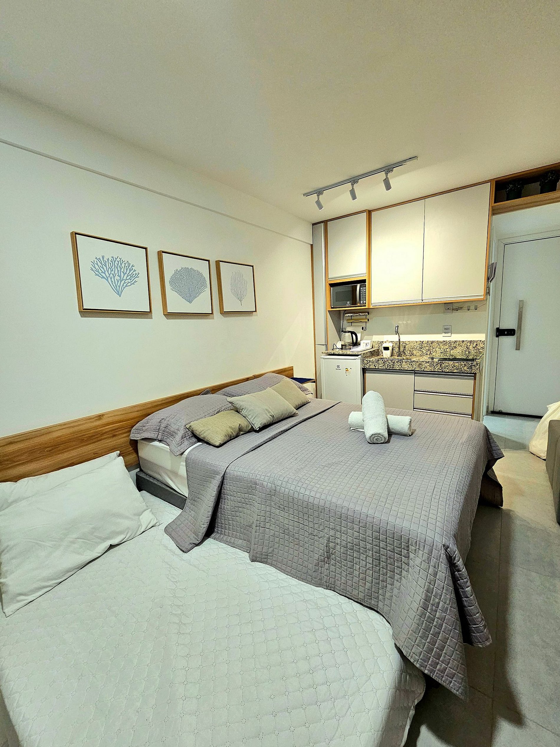 Conforto e Praticidade O studio acomoda confortavelmente até três hóspedes, dispondo de uma cama de casal e uma cama auxiliar. Cada elemento foi pensado para proporcionar o máximo de conforto e uma boa noite de sono.
