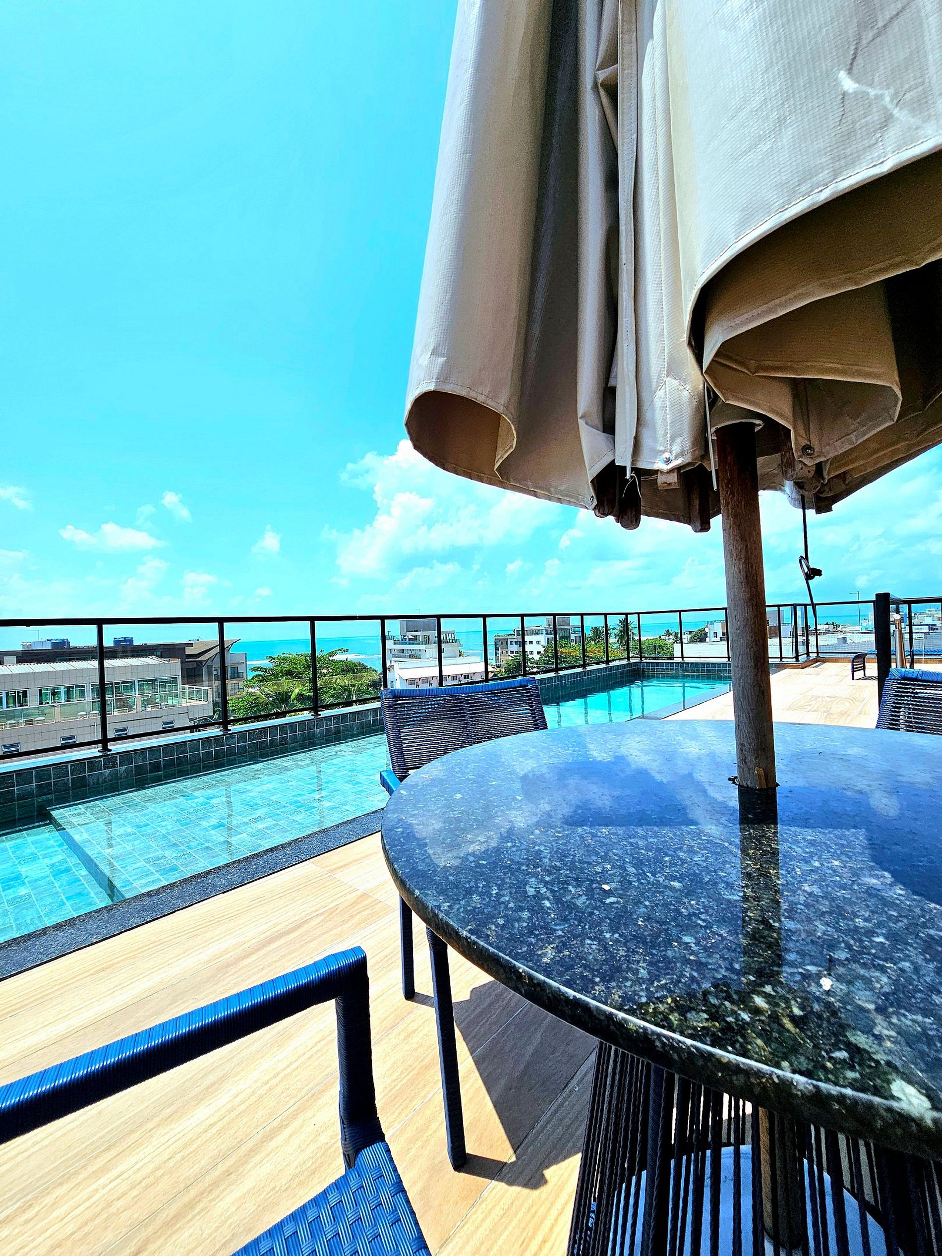 O Rooftop do Porto Kai é uma verdadeira joia, com uma piscina grande rodeada por um deck com espreguiçadeiras, mesas e cadeiras, além de uma área gourmet equipada para eventos ou relaxamento. É o local ideal para socializar, celebrar ocasiões especiais ou simplesmente desfrutar da brisa marinha com vista panorâmica.