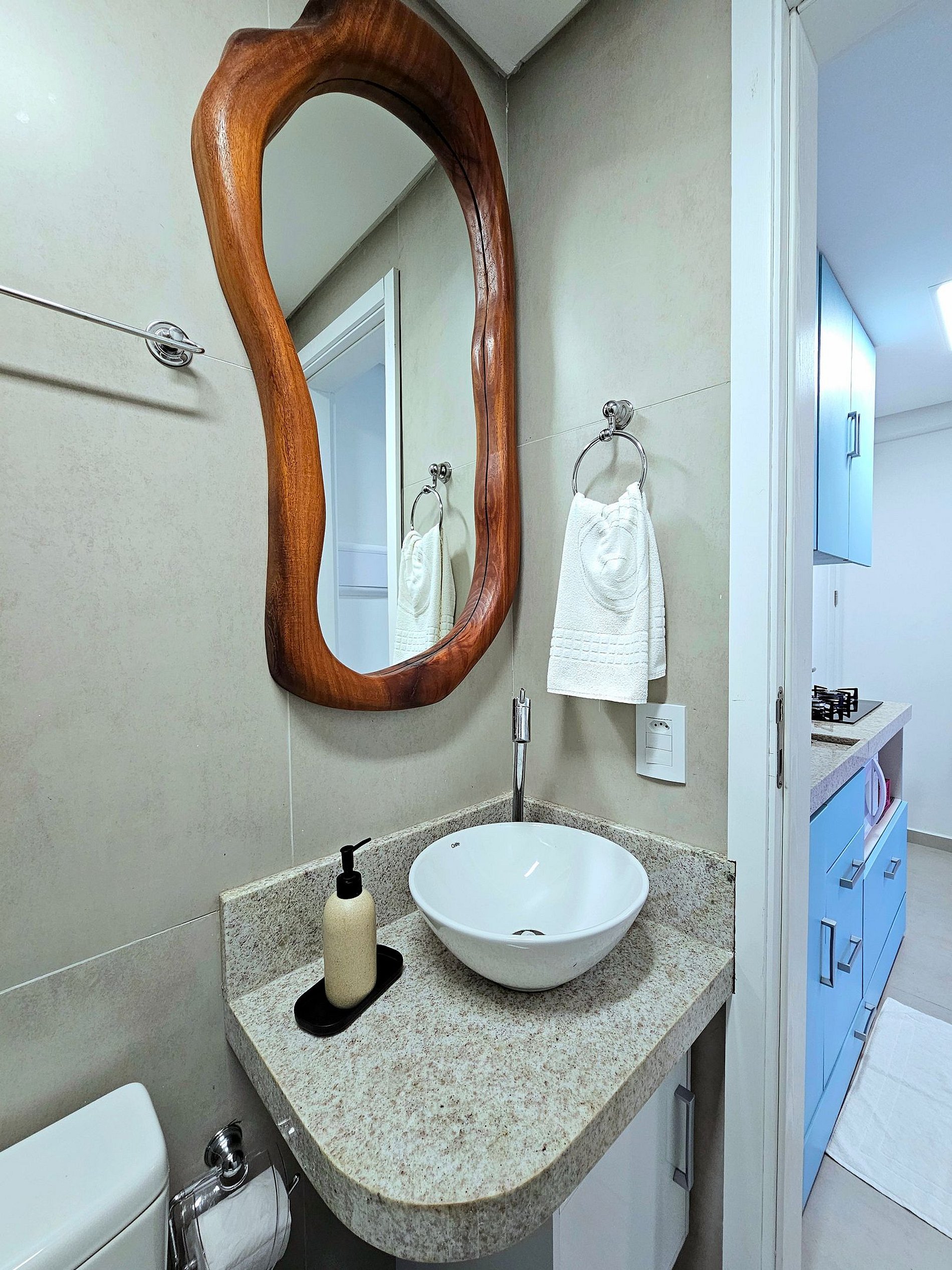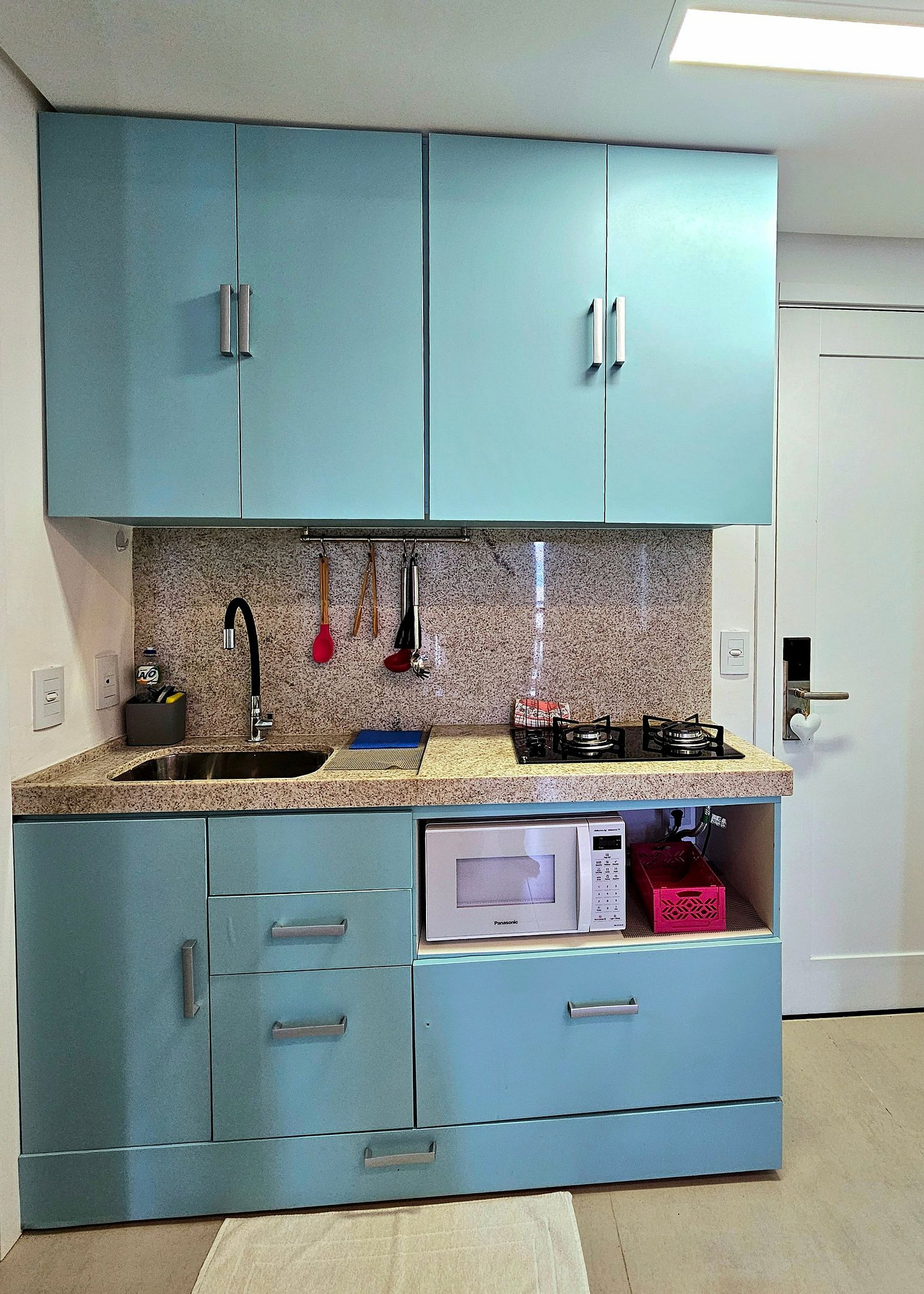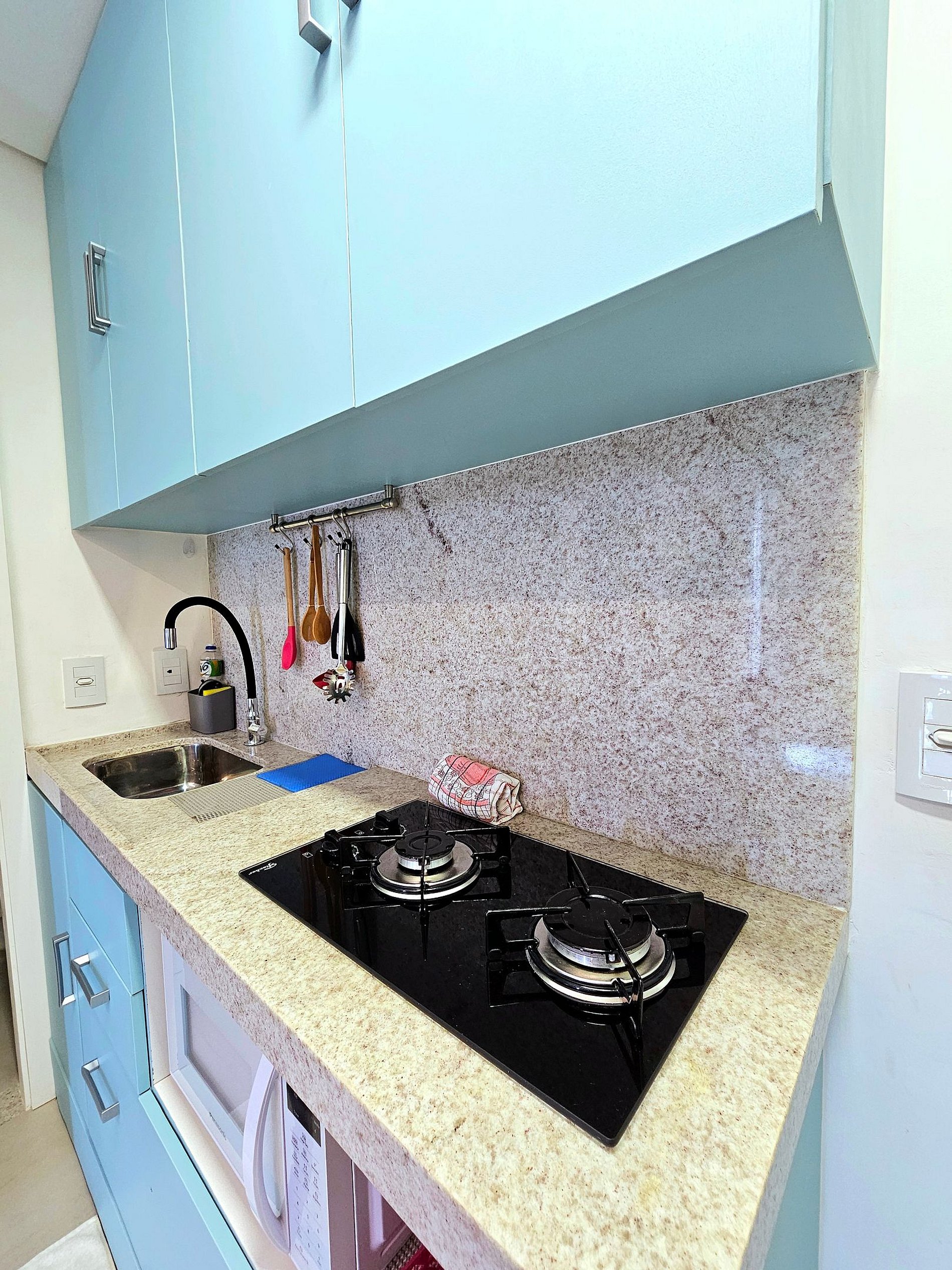- **Cozinha Equipada**: Prepare suas refeições com facilidade em uma cozinha moderna, equipada com liquidificador, sanduicheira, cafeteira italiana, etc. Utensílios completos e forninho estão à disposição para garantir uma experiência culinária excelente.