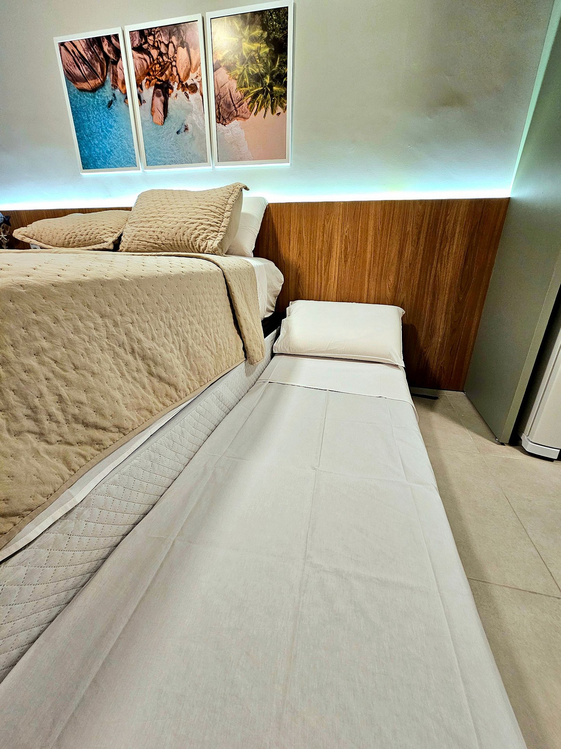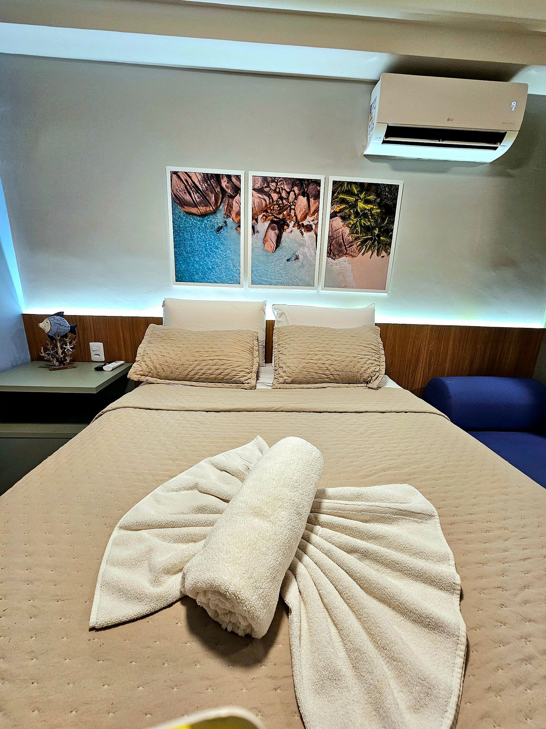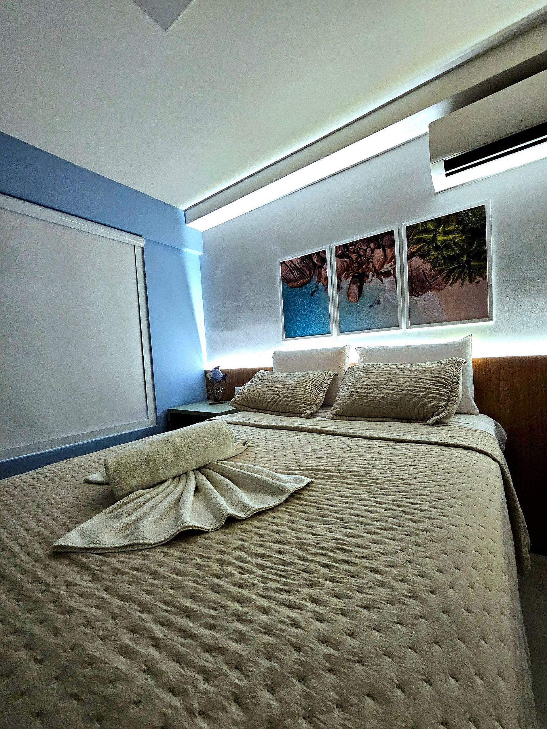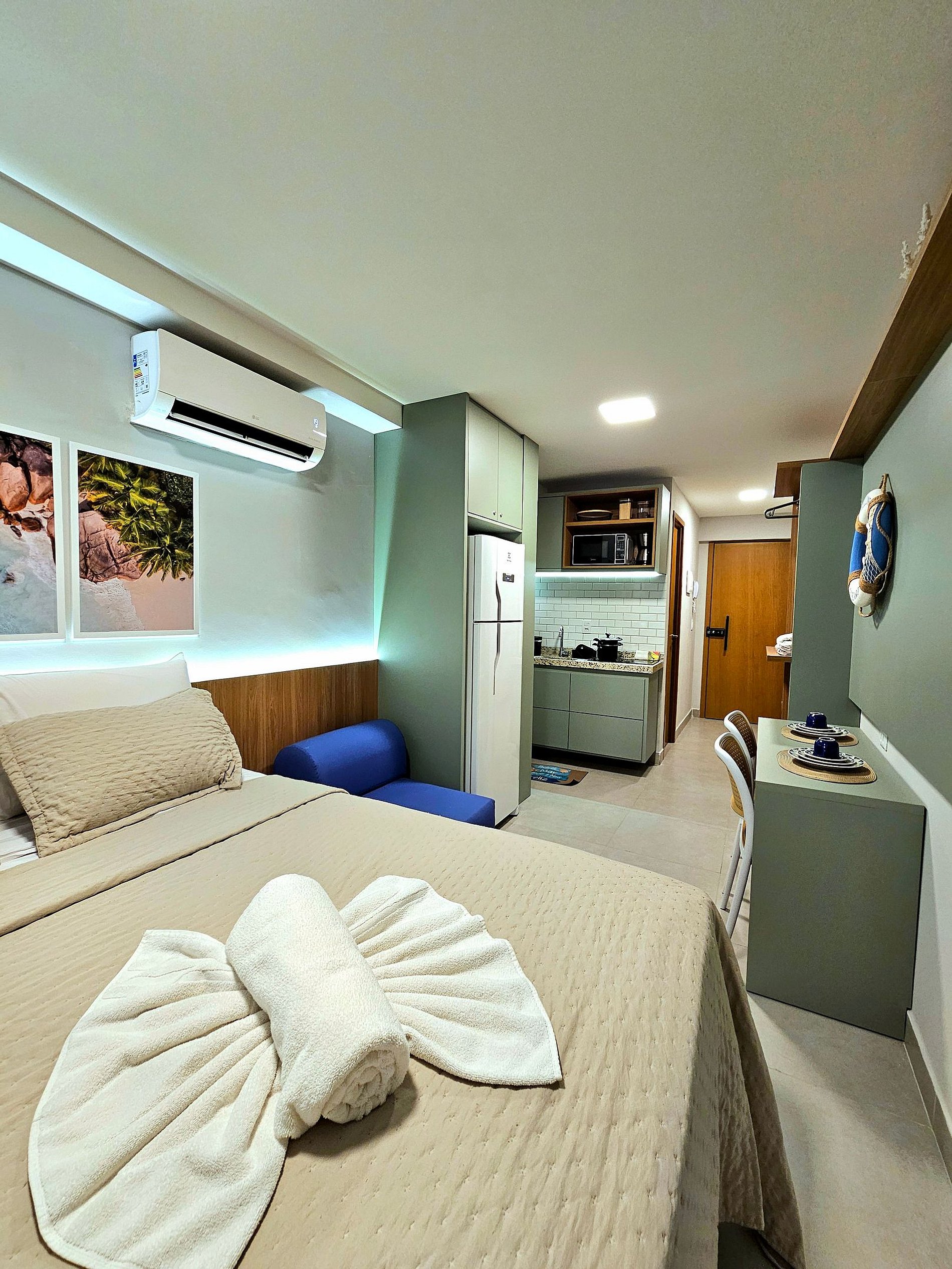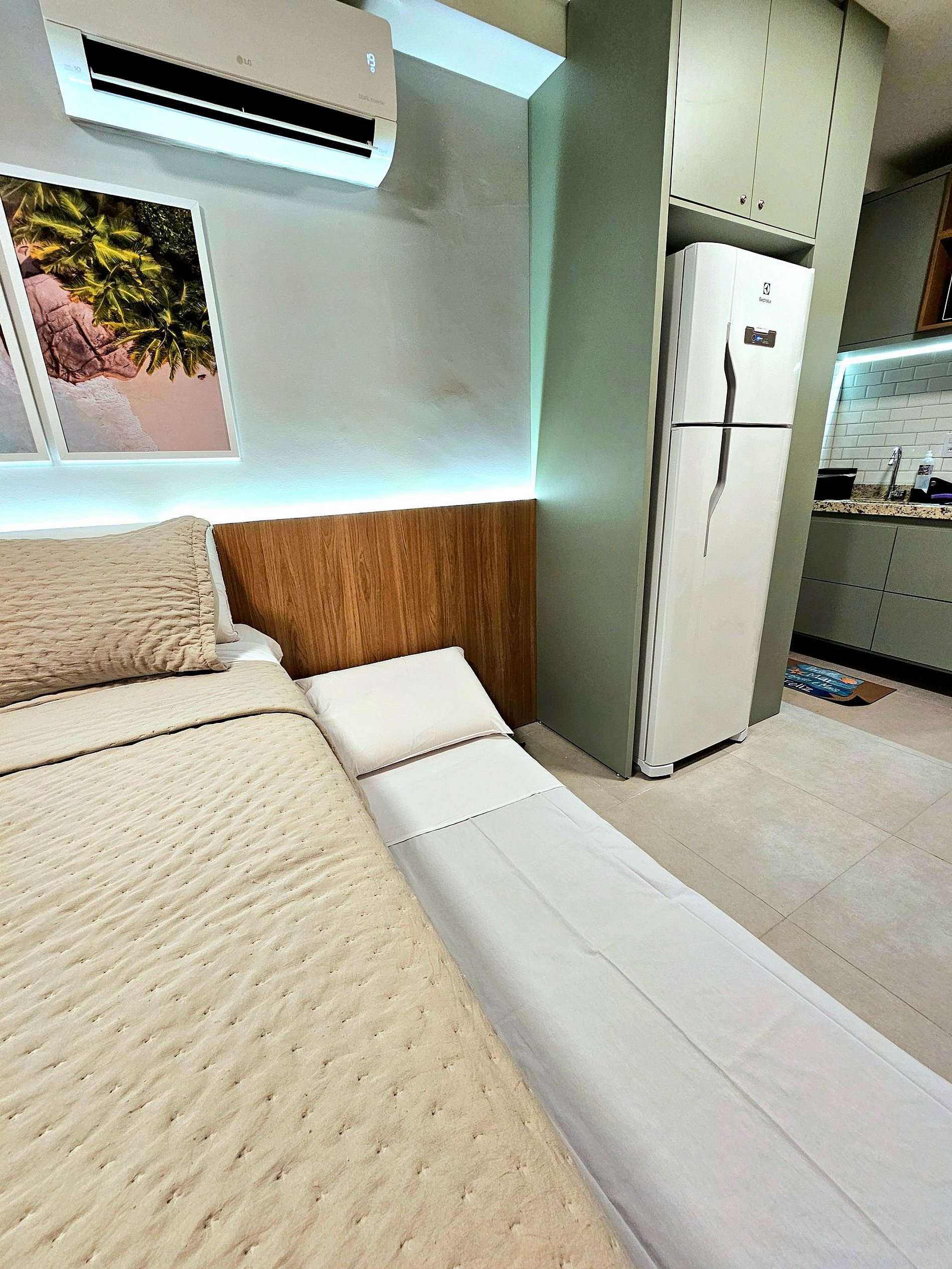 Decoração Moderna e detalhes únicos: A decoração do apartamento segue um estilo moderno e elegante, com detalhes em cores neutras e Leds na cabeceira da cama e na cozinha que criam uma atmosfera aconchegante e sofisticada. As luzes estrategicamente posicionadas proporcionam um ambiente acolhedor, ideal tanto para momentos de relaxamento quanto para criar um clima especial durante suas noites no Cupe Exclusive.