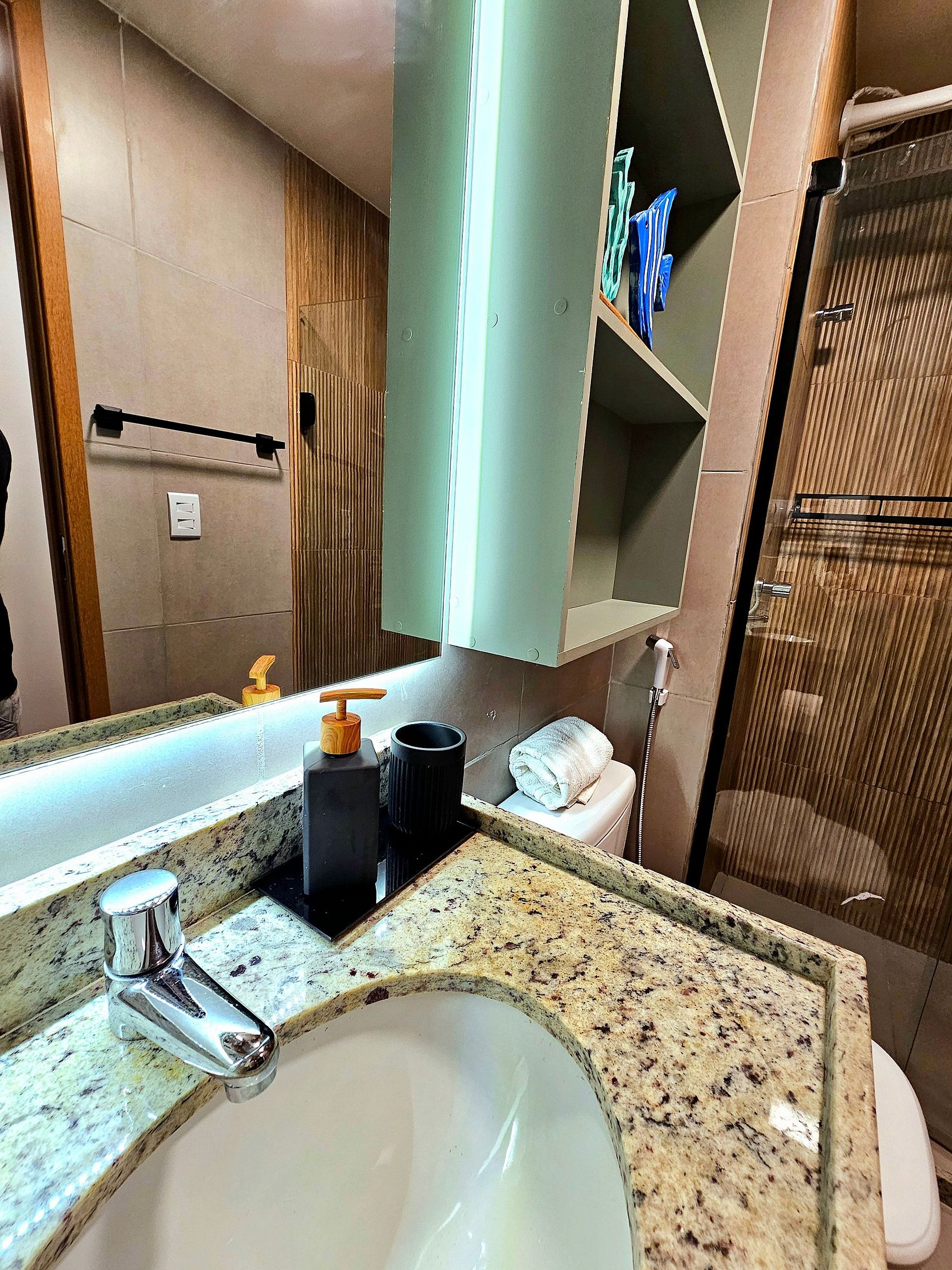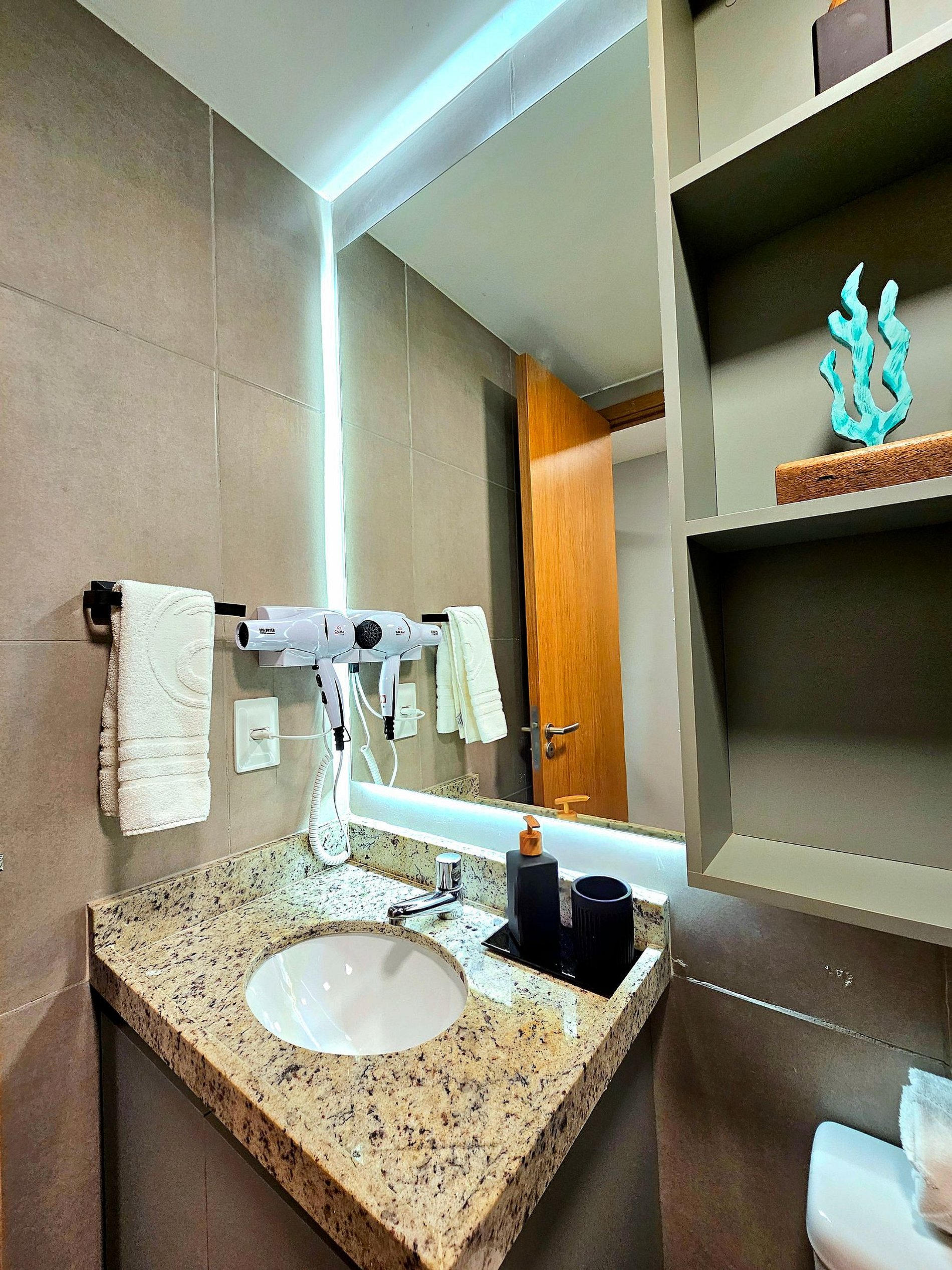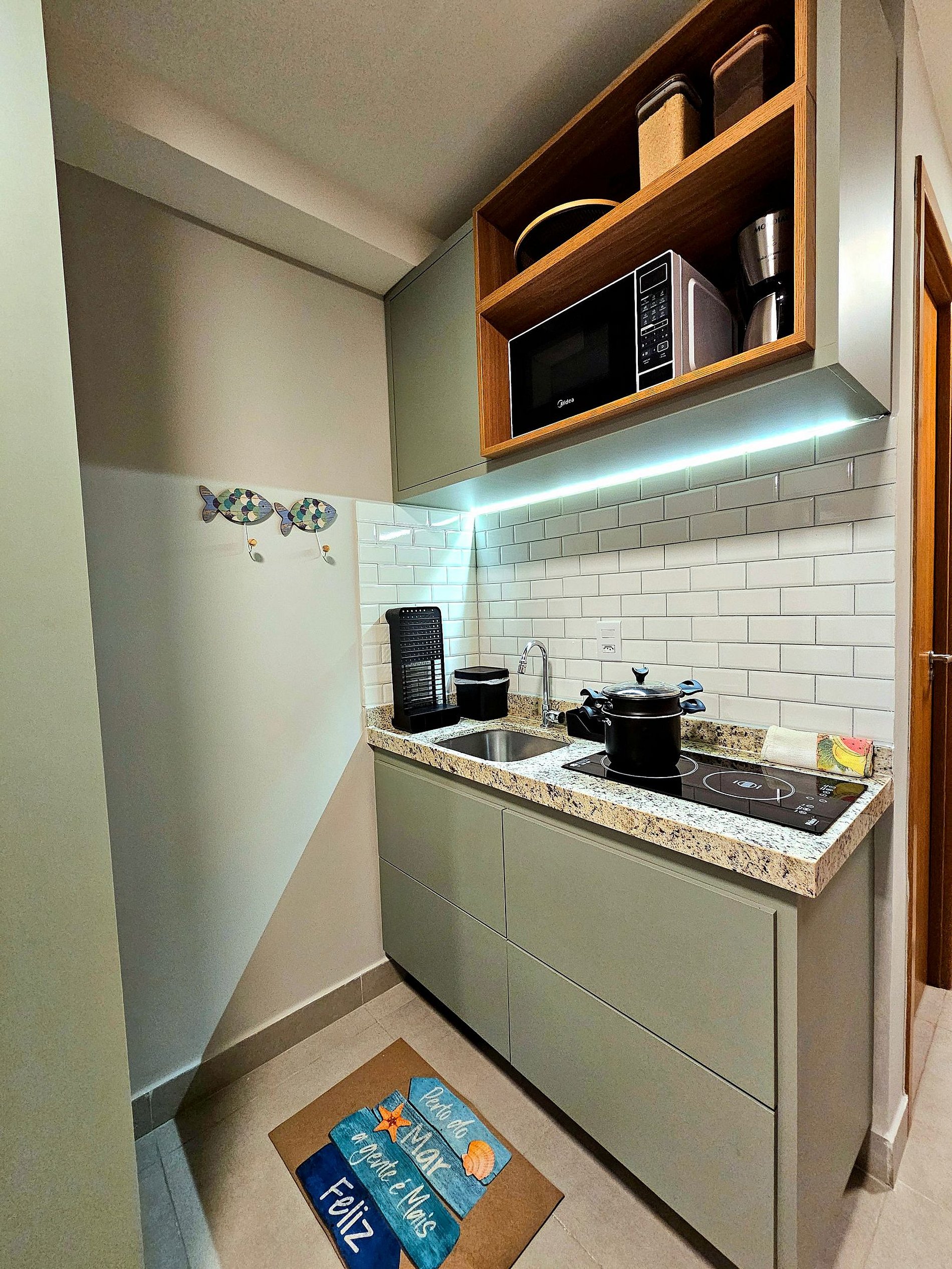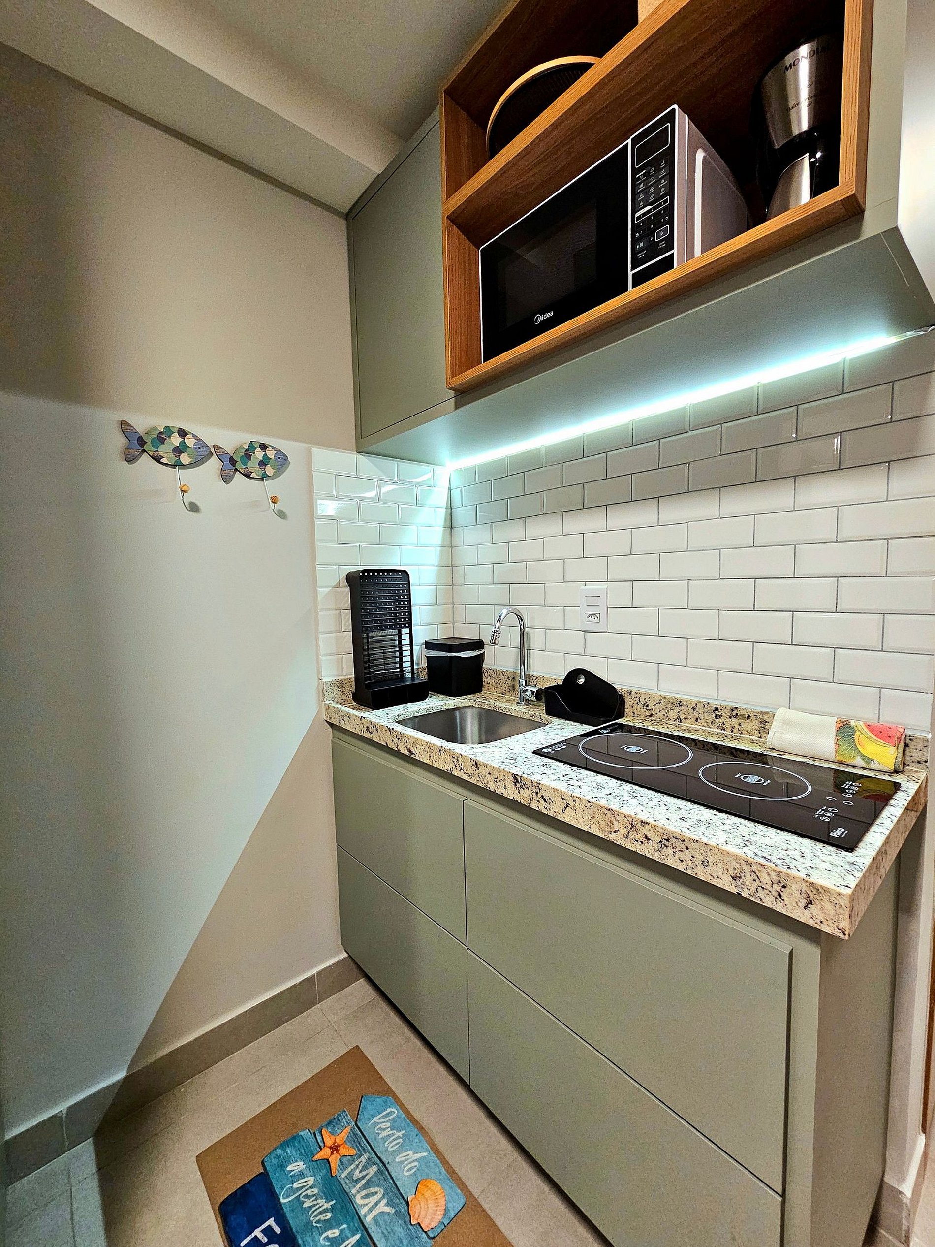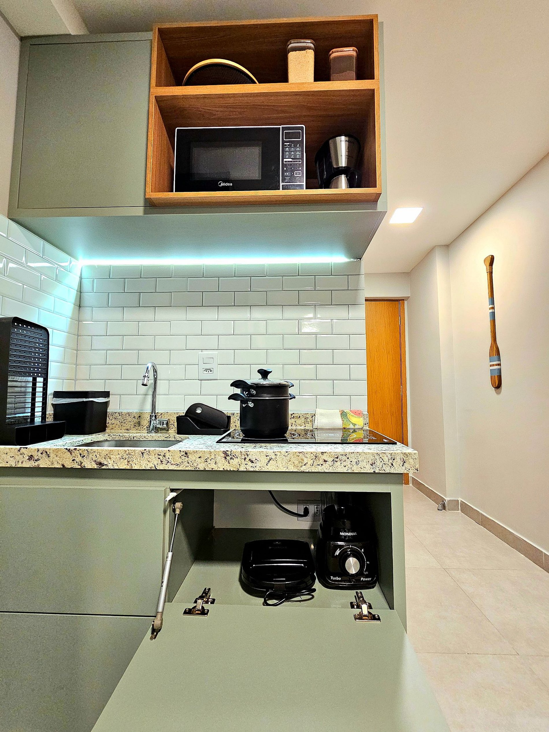 Decoração Moderna e detalhes únicos: A decoração do apartamento segue um estilo moderno e elegante, com detalhes em cores neutras e Leds na cabeceira da cama e na cozinha que criam uma atmosfera aconchegante e sofisticada. As luzes estrategicamente posicionadas proporcionam um ambiente acolhedor, ideal tanto para momentos de relaxamento quanto para criar um clima especial durante suas noites no Cupe Exclusive.