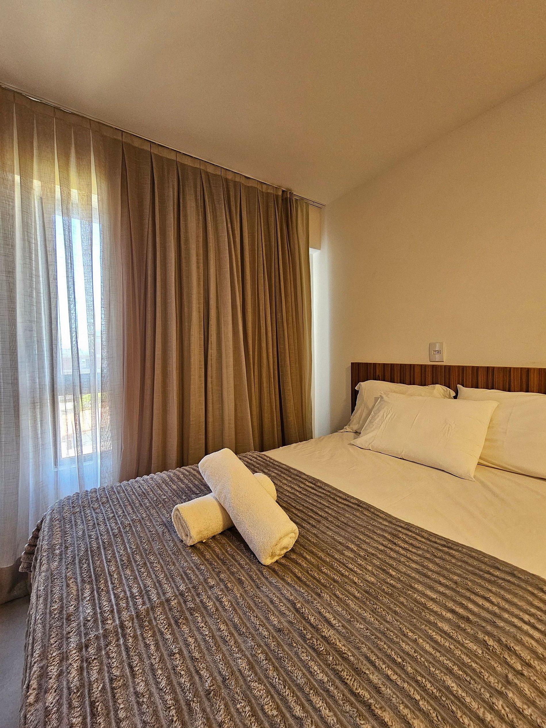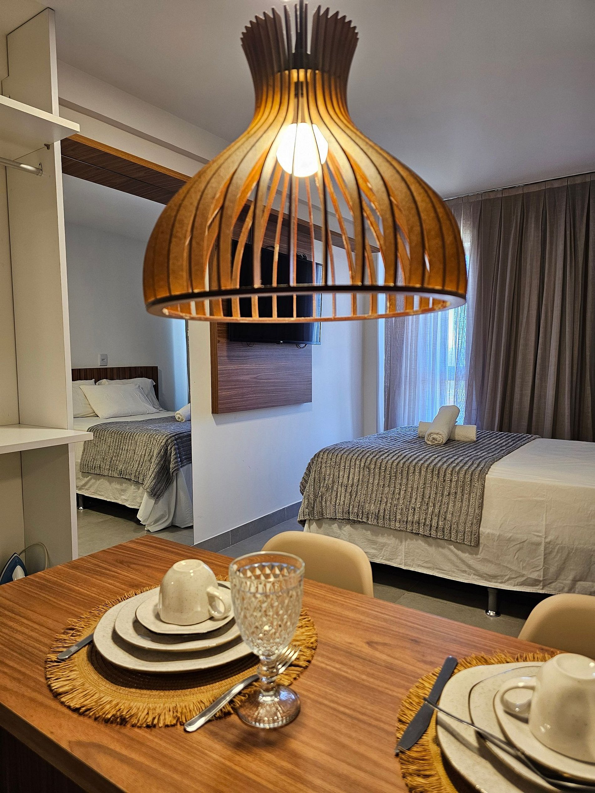 Decoração Moderna e Iluminação Planejada: A decoração do apartamento segue um estilo moderno e elegante, com detalhes em cores neutras e iluminação indireta que criam uma atmosfera aconchegante e sofisticada. As luzes estrategicamente posicionadas proporcionam um ambiente acolhedor, ideal tanto para momentos de relaxamento quanto para criar um clima especial durante suas noites no Cupe Exclusive.