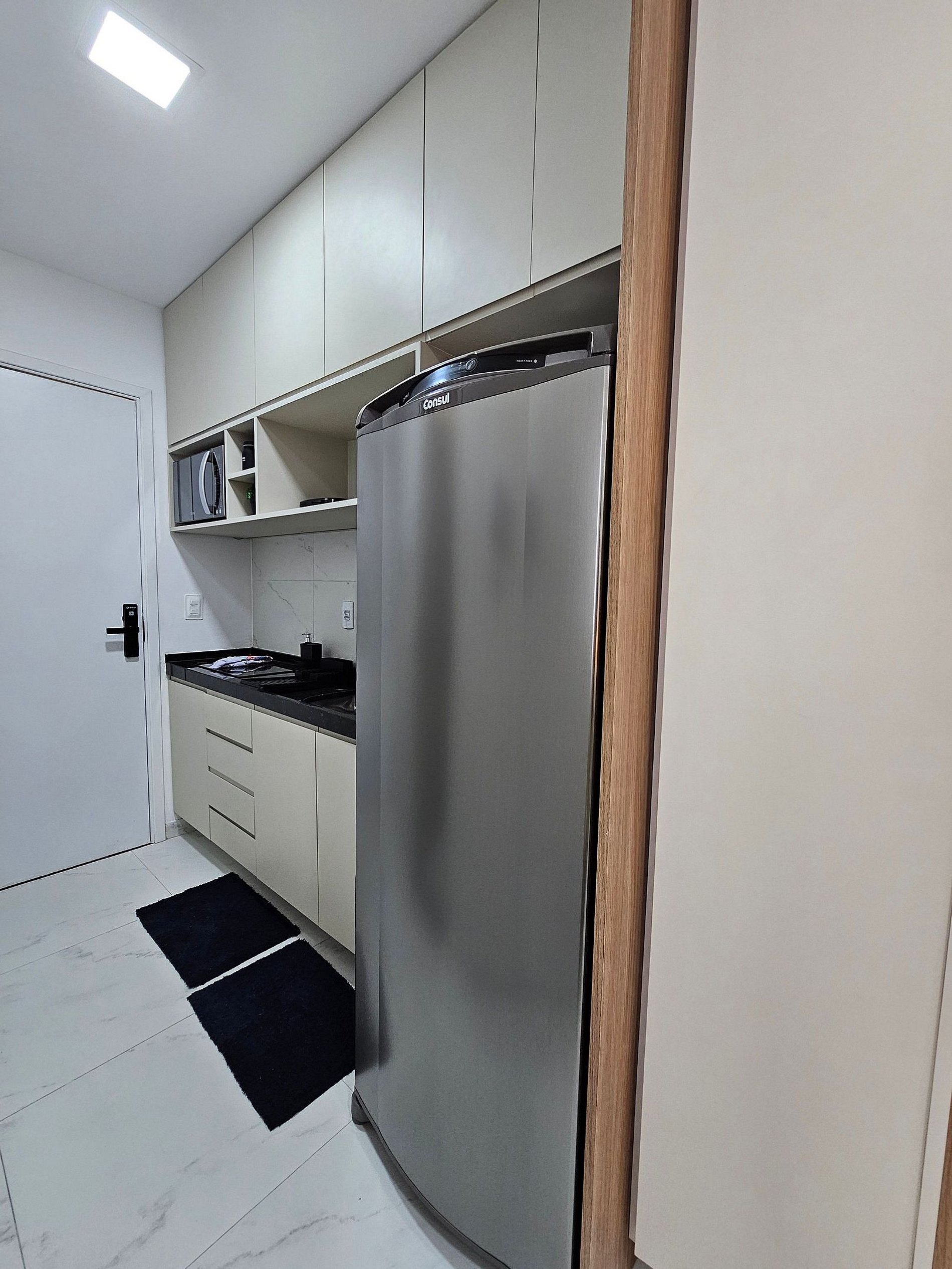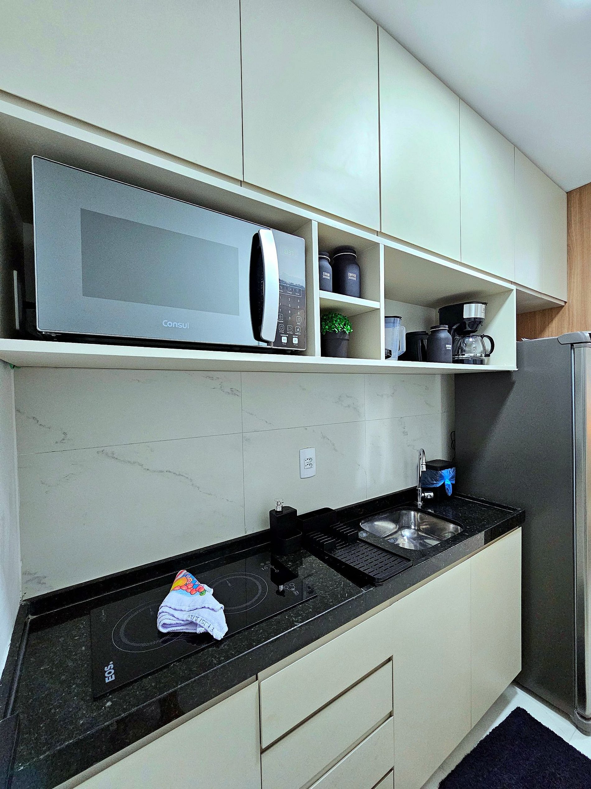 A cozinha é totalmente equipada com eletrodomésticos de alta qualidade, incluindo cooktop, geladeira, micro-ondas, airfryer, sanduicheira, liquidificador, cafeteira e todos os utensílios (panelas, copos, taças, pratos e talheres) para realizar sua refeição.