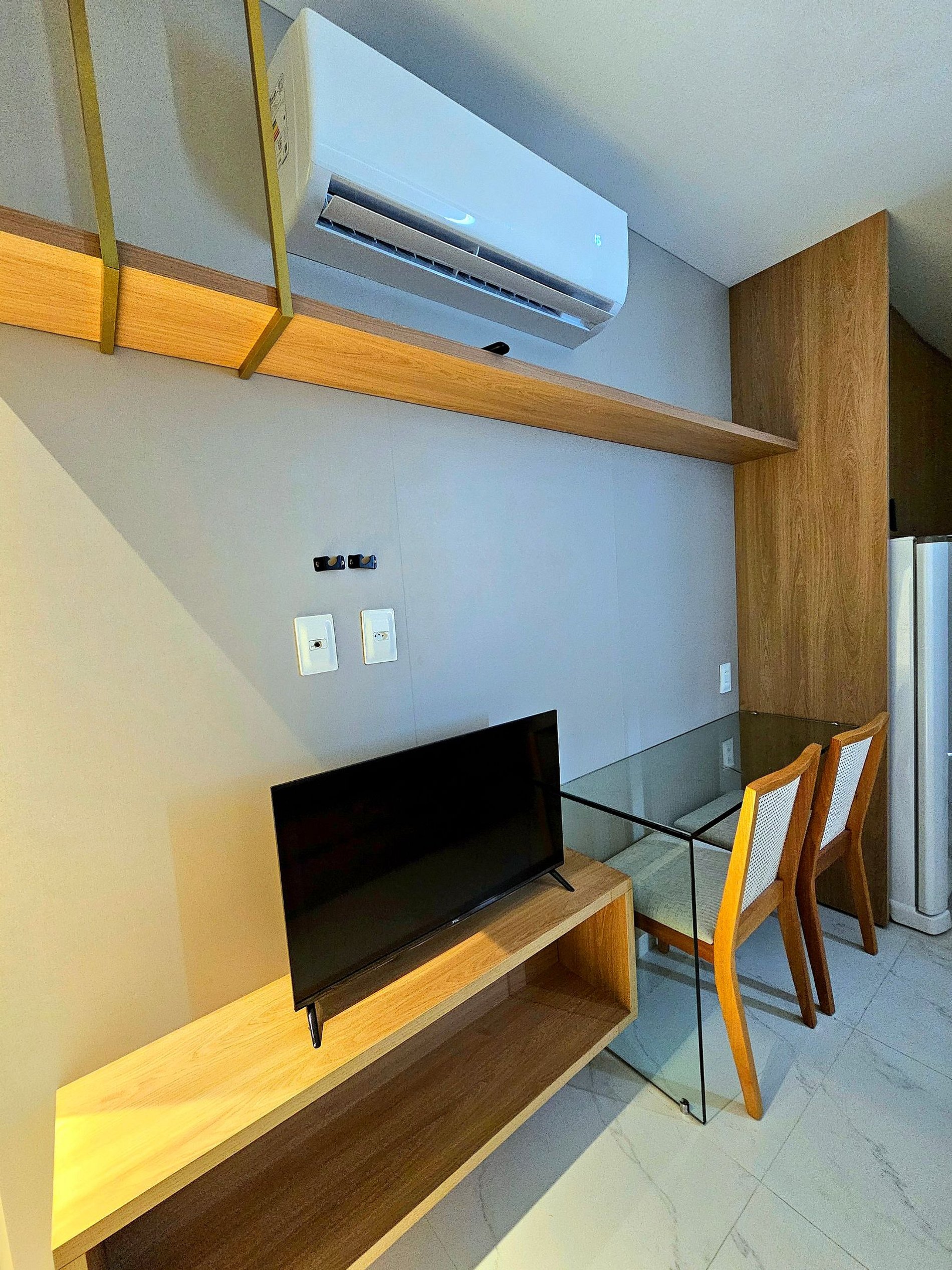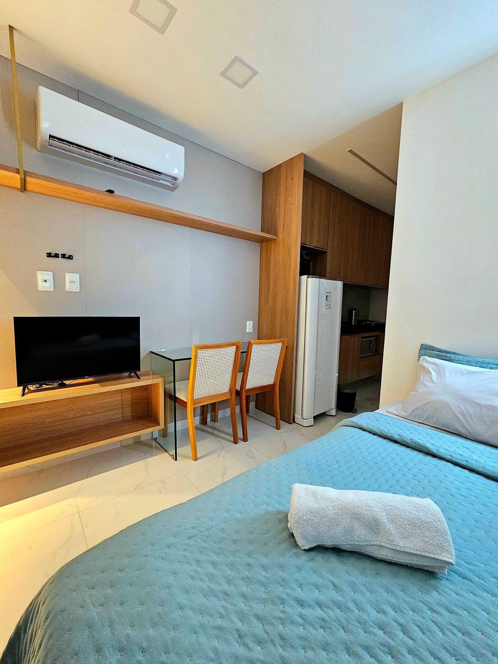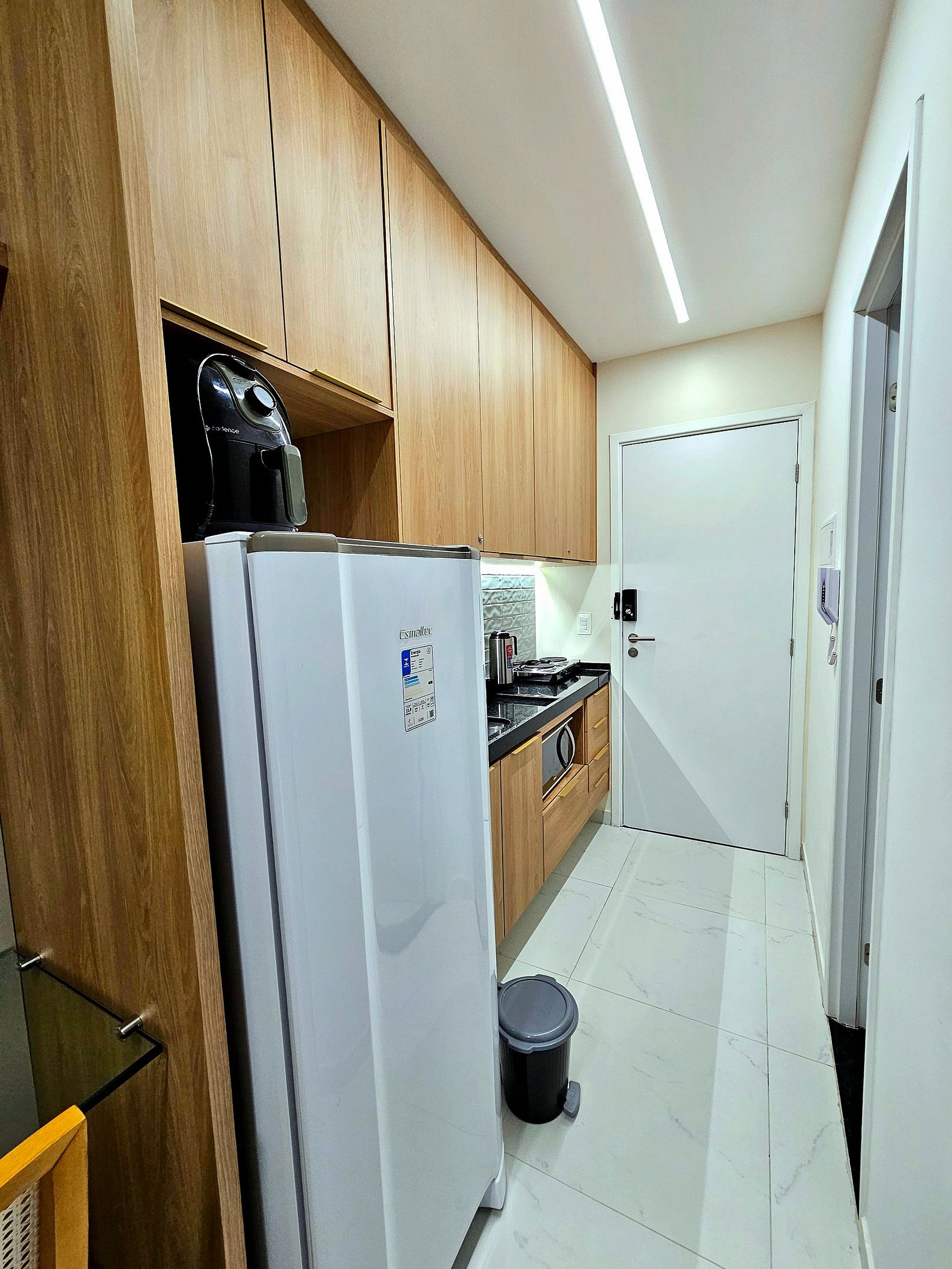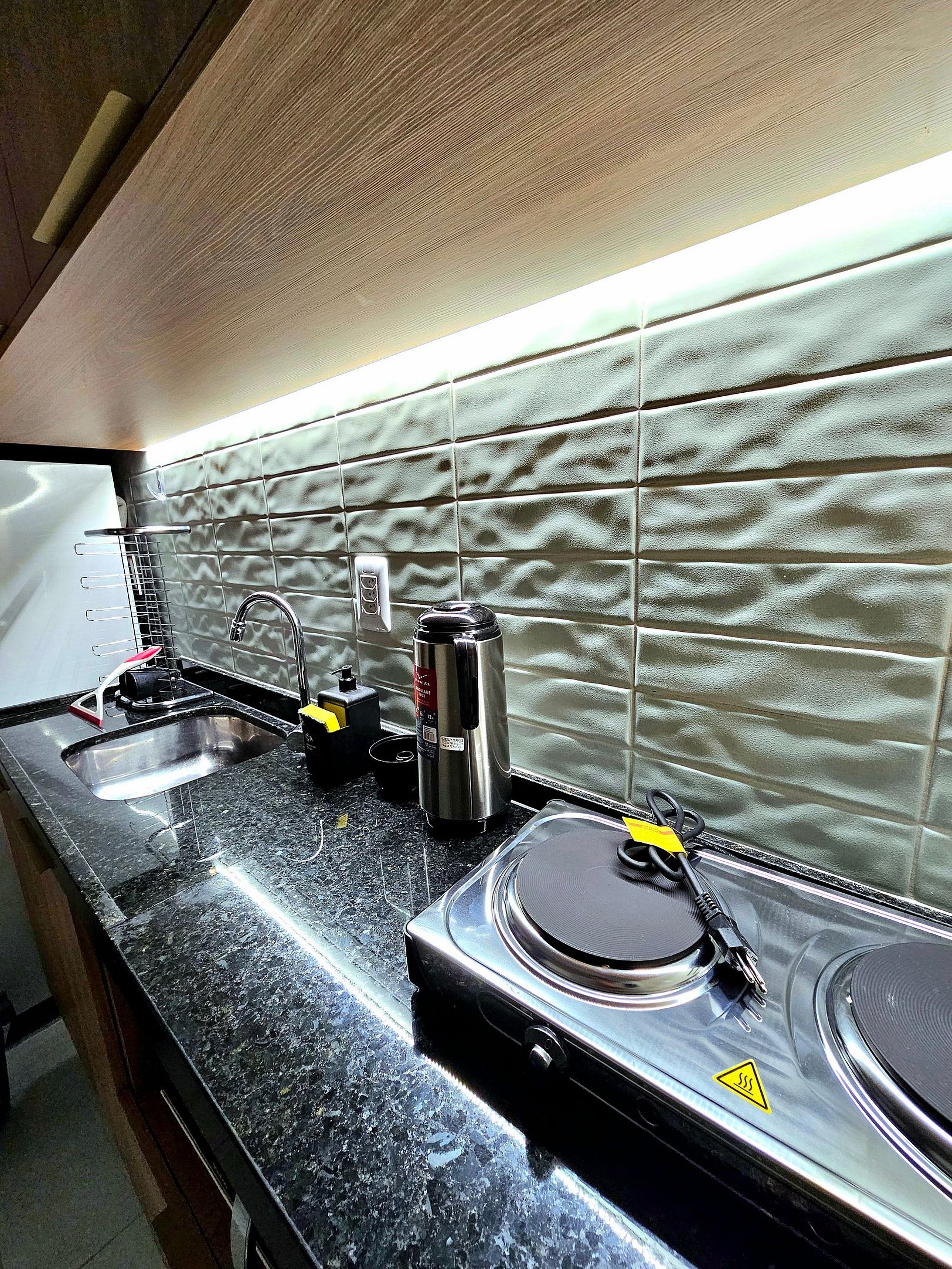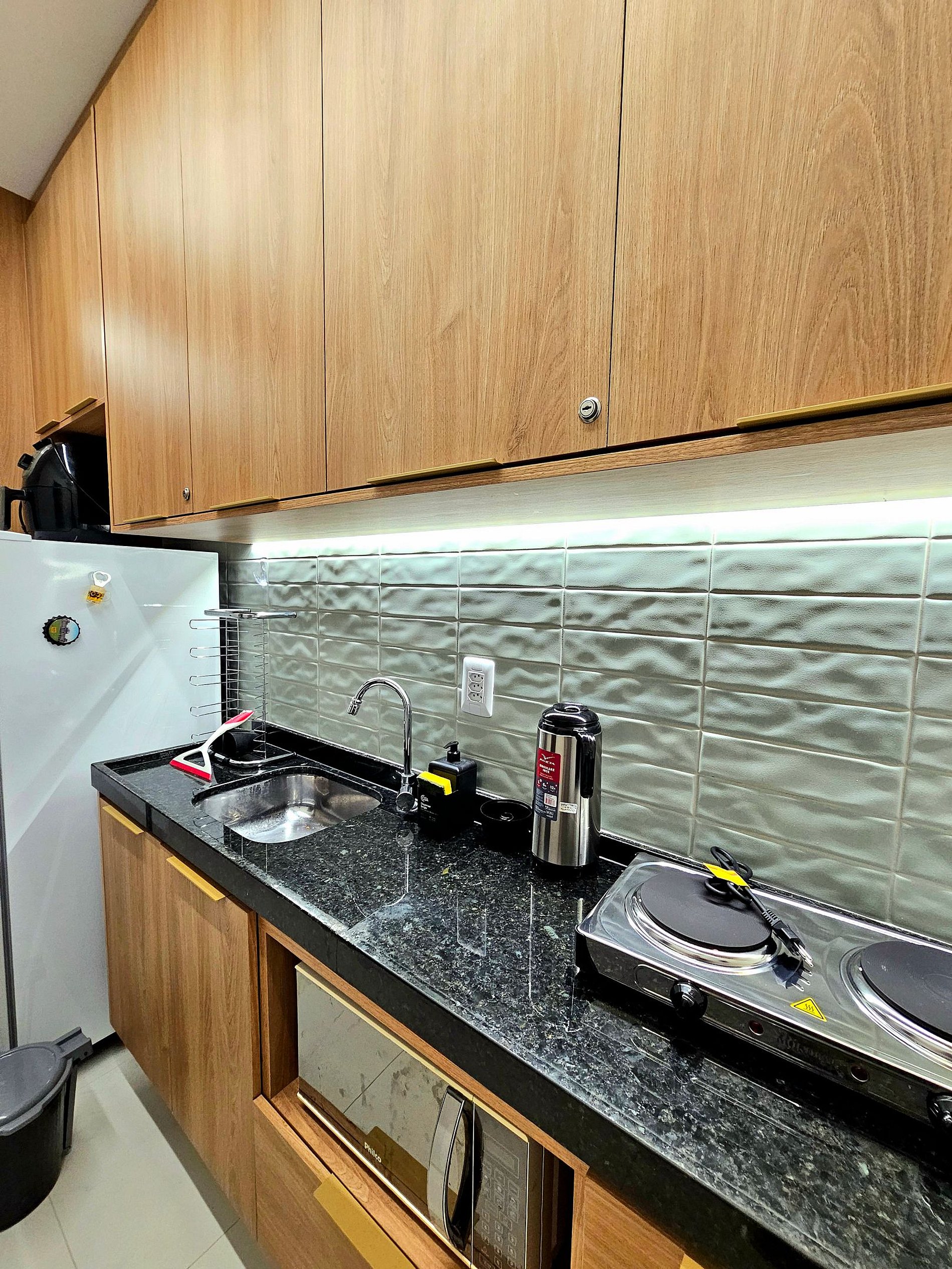 Cozinha Compacta: A cozinha do apartamento é equipada com um cooktop de duas bocas e os principais utensílios de cozinha, como panelas, pratos e talheres, além dos principais eletrodomésticos (Liquidificador, sanduicheira, microondas, etc.). Uma opção prática para preparar refeições e se sentir em casa