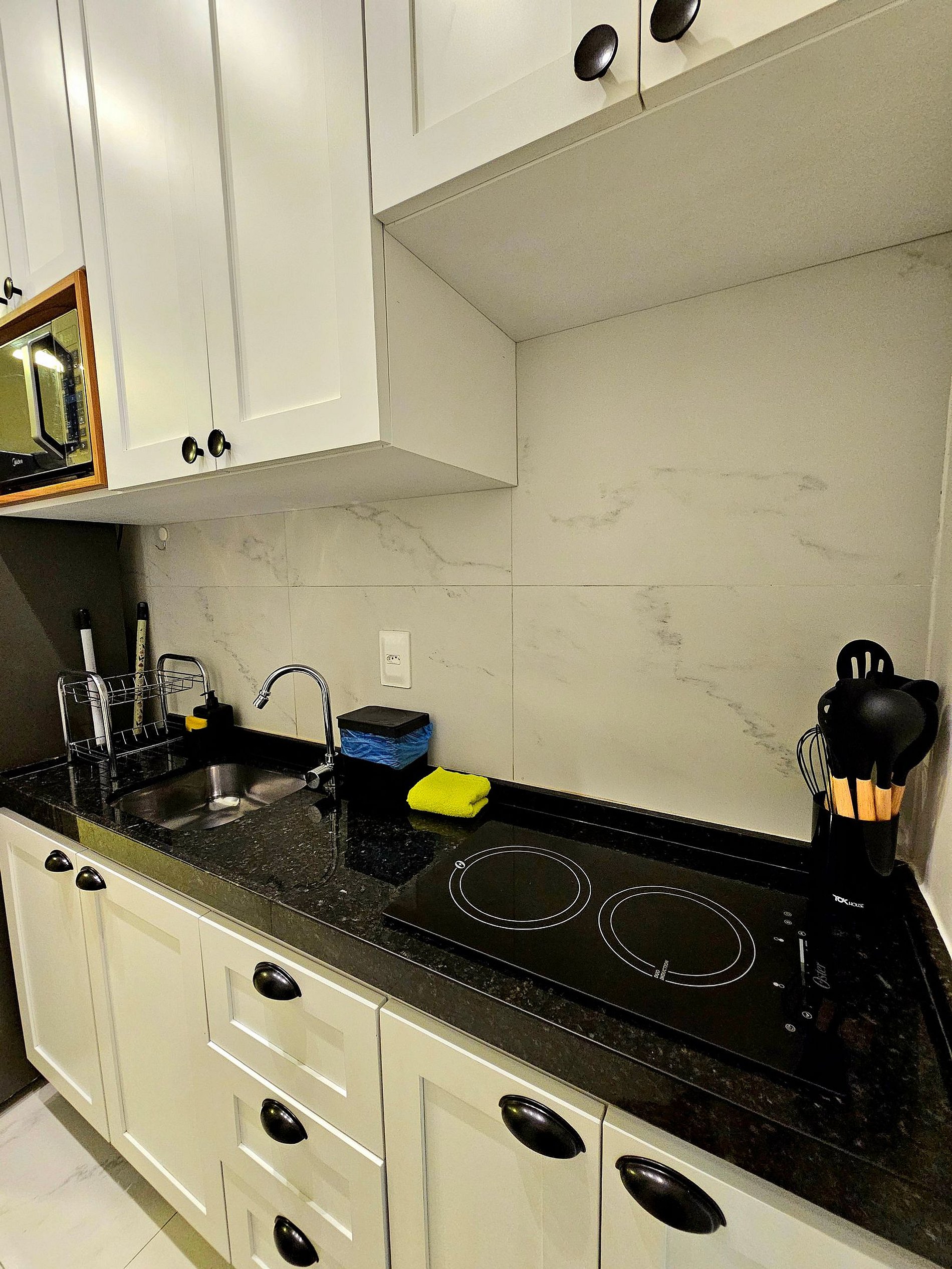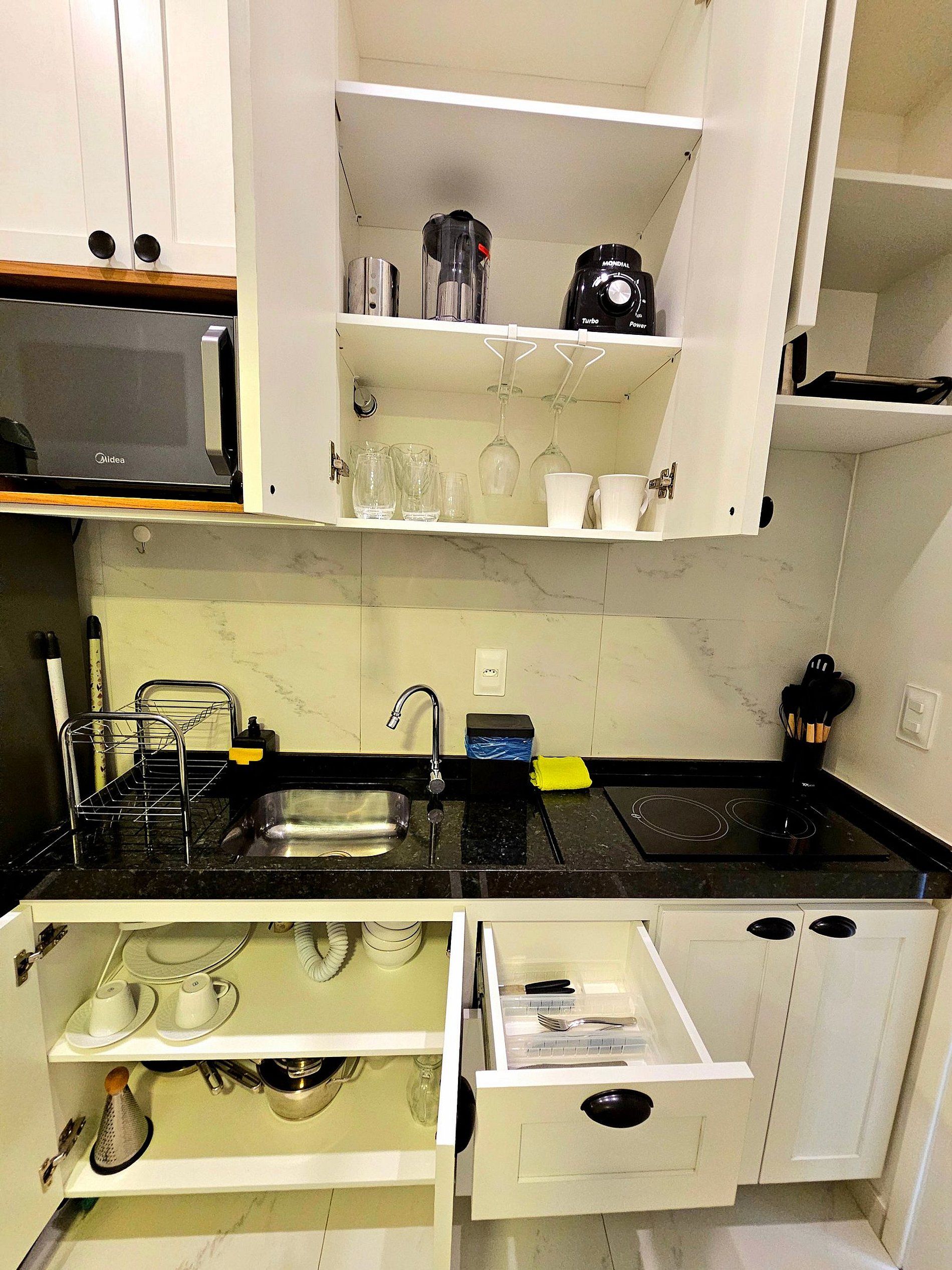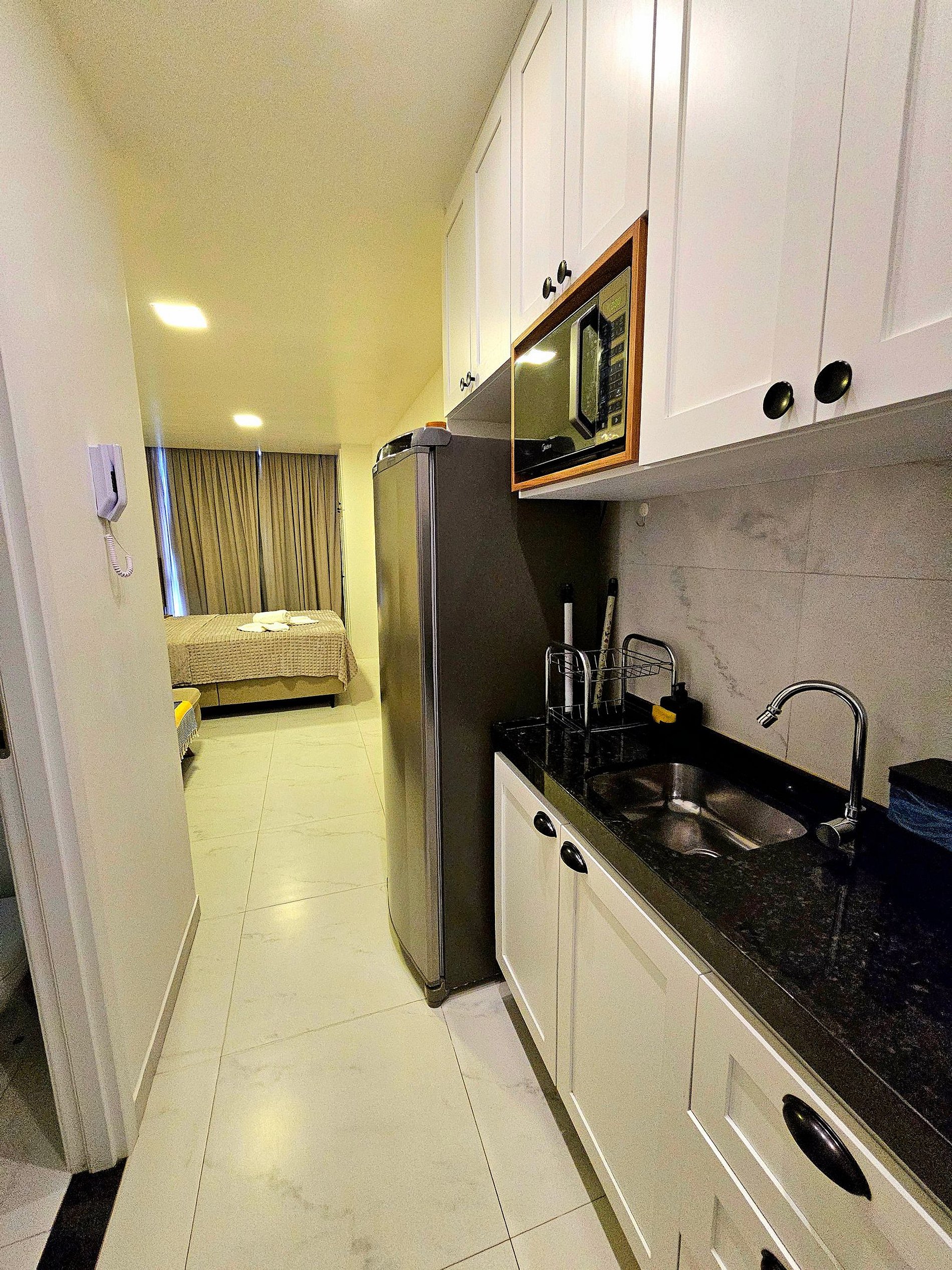 A cozinha é um dos destaques do apartamento, equipada com todos os eletrodomésticos essenciais para você preparar suas refeições com praticidade (Cafeteira elétrica, sanduicheira, liquidificador). Todos os utensílios de cozinha são de primeira linha, desde panelas a talheres, proporcionando uma experiência funcional e agradável para aqueles que gostam de cozinhar.