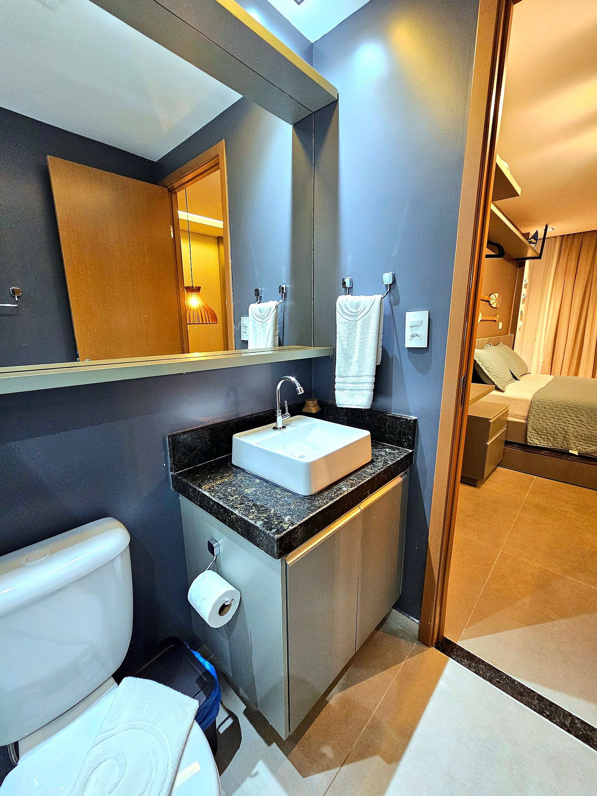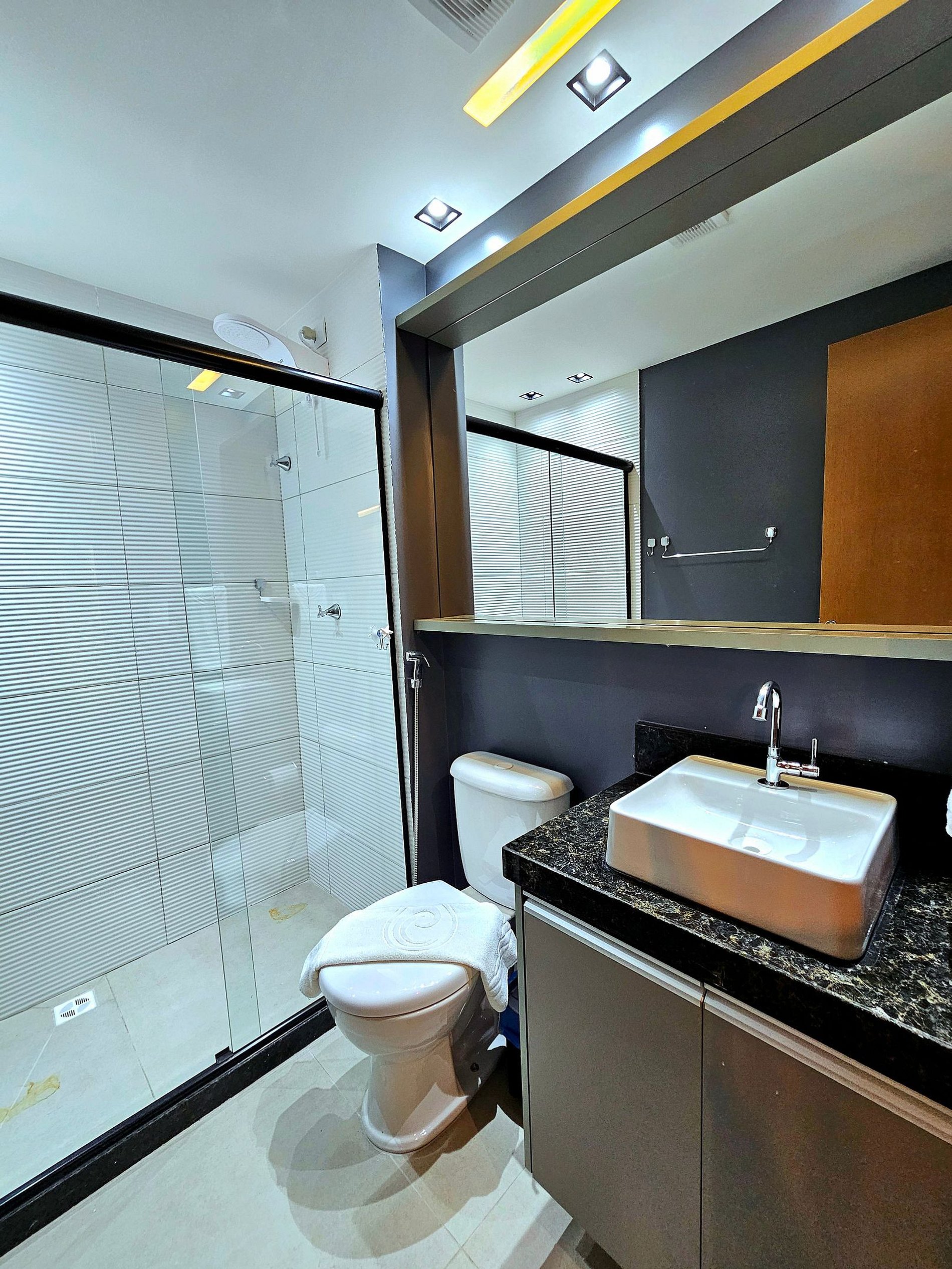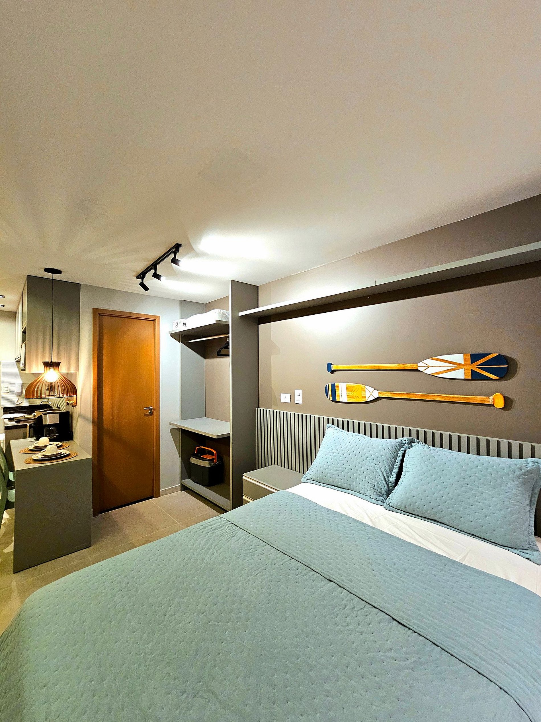 Decoração Moderna e Iluminação Planejada: A decoração do apartamento segue um estilo moderno e elegante, com detalhes em cores neutras e iluminação indireta que criam uma atmosfera aconchegante e sofisticada. As luzes estrategicamente posicionadas proporcionam um ambiente acolhedor, ideal tanto para momentos de relaxamento quanto para criar um clima especial durante suas noites no Reserva do Cupe