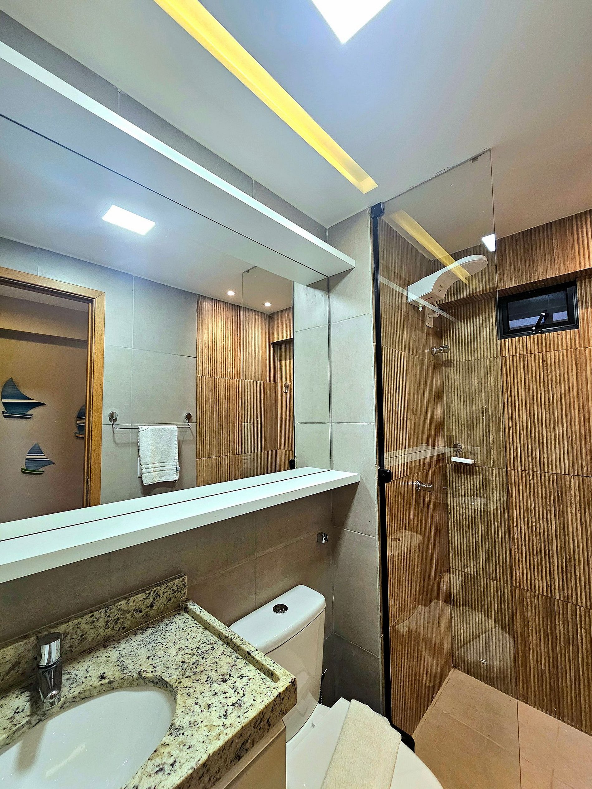 Decoração Moderna e Iluminação Planejada: A decoração do apartamento segue um estilo moderno e elegante, com detalhes em cores neutras e iluminação indireta que criam uma atmosfera aconchegante e sofisticada. As luzes estrategicamente posicionadas proporcionam um ambiente acolhedor, ideal tanto para momentos de relaxamento quanto para criar um clima especial durante suas noites no Cupe Exclusive.