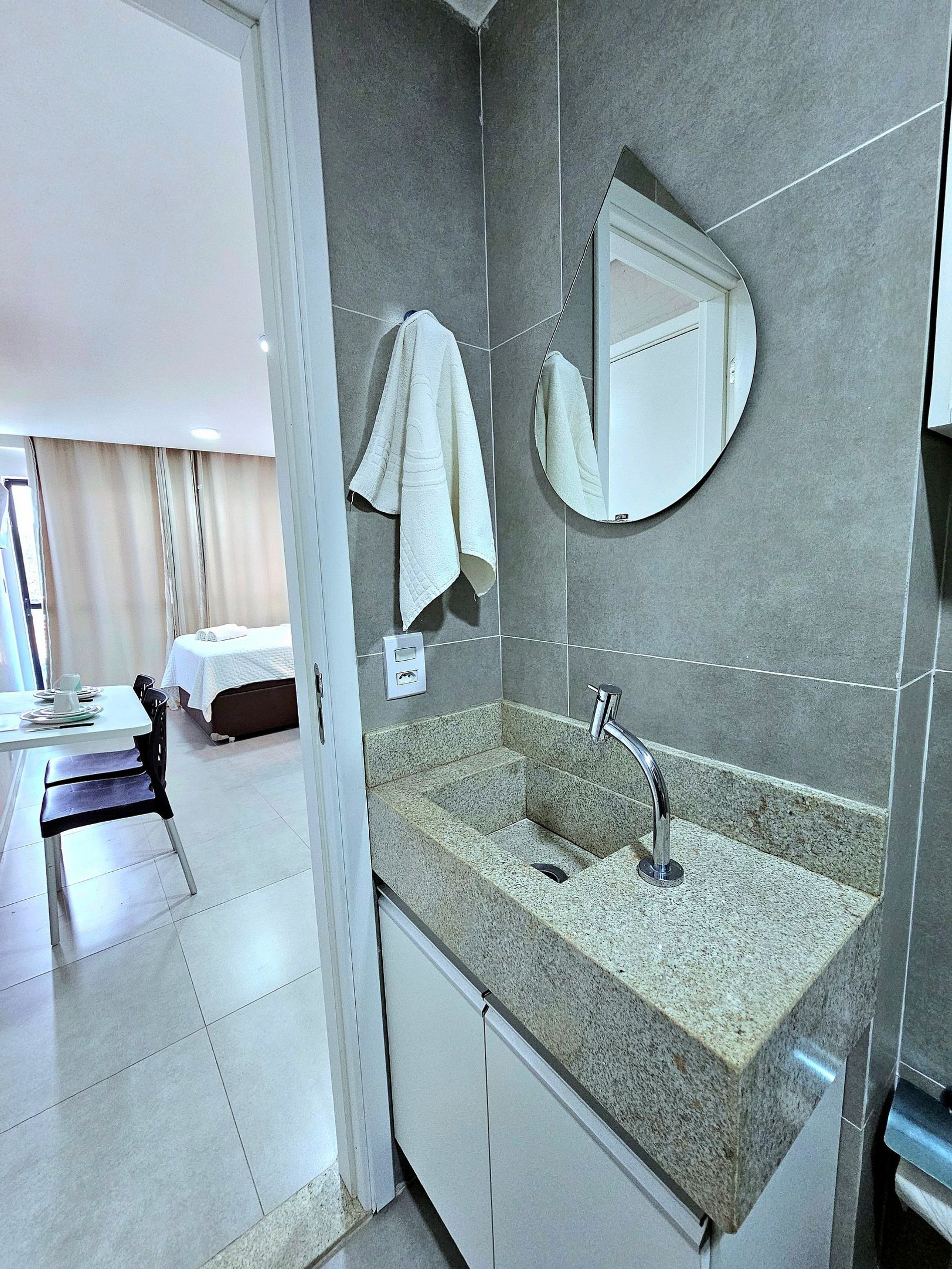 Ao entrar, você encontrará uma sala de estar moderna, equipada com um excelente sofá-cama, perfeito para acomodar um casal de forma confortável. A sala também dispõe de uma smart TV, garantindo momentos de lazer e entretenimento durante a sua estadia. O ambiente se estende até uma espaçosa varanda, onde há uma mesa para 4 pessoas, ideal para refeições ao ar livre ou para relaxar enquanto aprecia o clima tropical de Porto de Galinhas. A varanda é um dos pontos altos do apartamento, proporcionando um espaço perfeito para começar o dia com um café da manhã ou relaxar à noite.