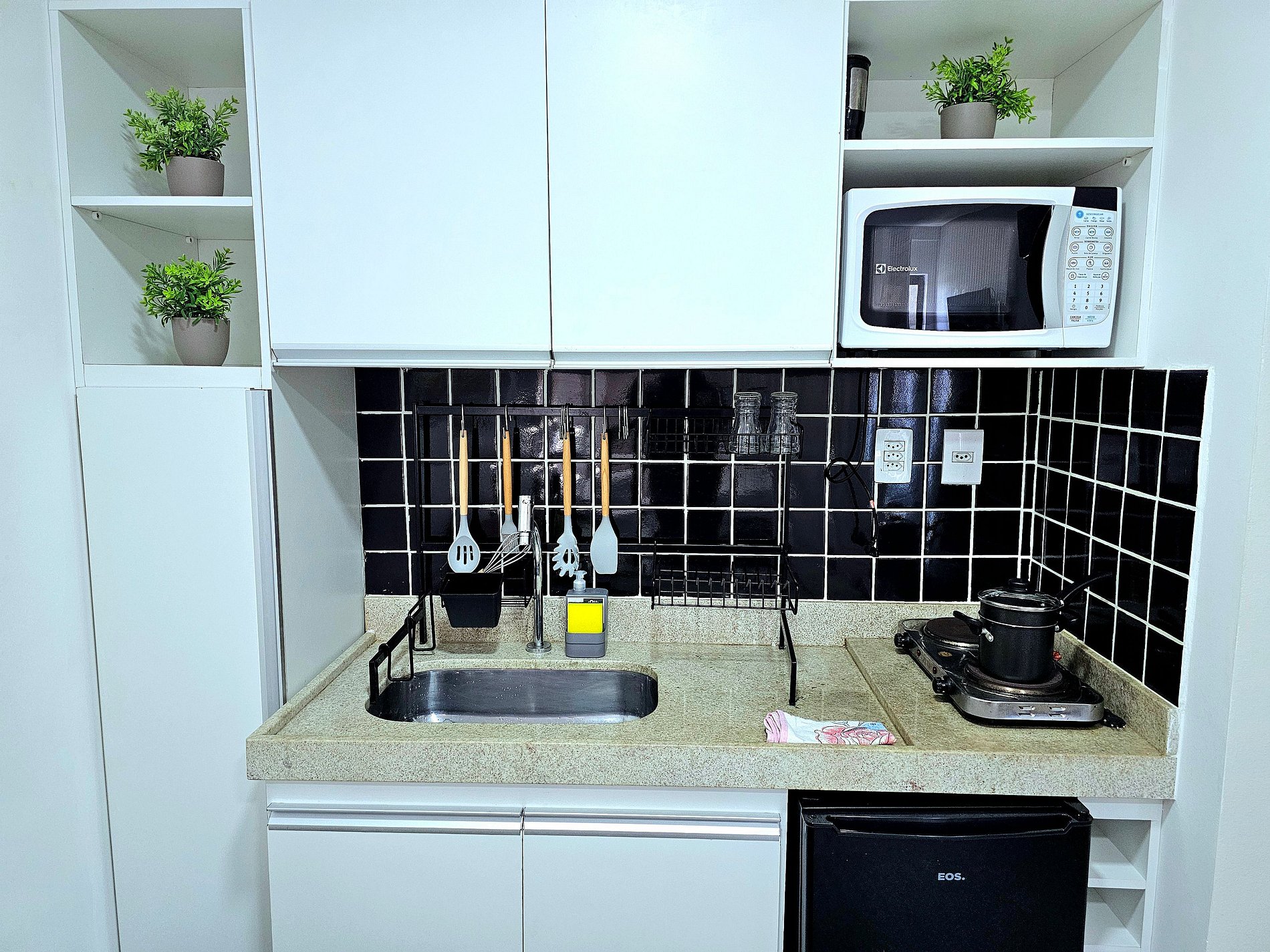 A cozinha totalmente equipada é um dos destaques deste apartamento. Nela, você encontrará Frigobar, cooktop, liquidificador, sanduicheira, cafeteira, panelas (incluindo cuscuzeira) e todos os utensílios necessários para preparar refeições com facilidade. Seja para preparar um café da manhã rápido ou um jantar completo, a cozinha foi pensada para garantir praticidade e conforto aos hóspedes.