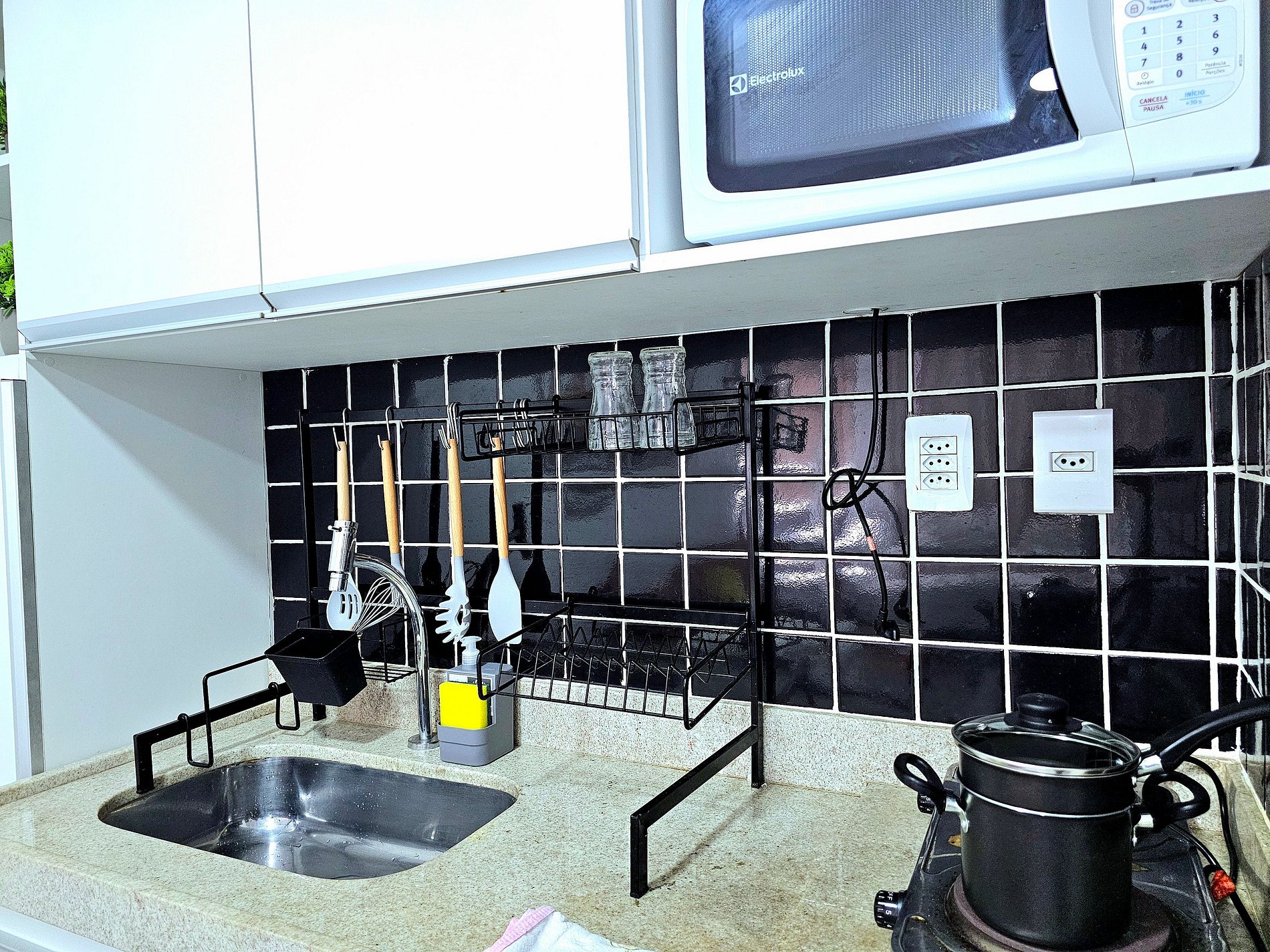 A cozinha totalmente equipada é um dos destaques deste apartamento. Nela, você encontrará Frigobar, cooktop, liquidificador, sanduicheira, cafeteira, panelas (incluindo cuscuzeira) e todos os utensílios necessários para preparar refeições com facilidade. Seja para preparar um café da manhã rápido ou um jantar completo, a cozinha foi pensada para garantir praticidade e conforto aos hóspedes.