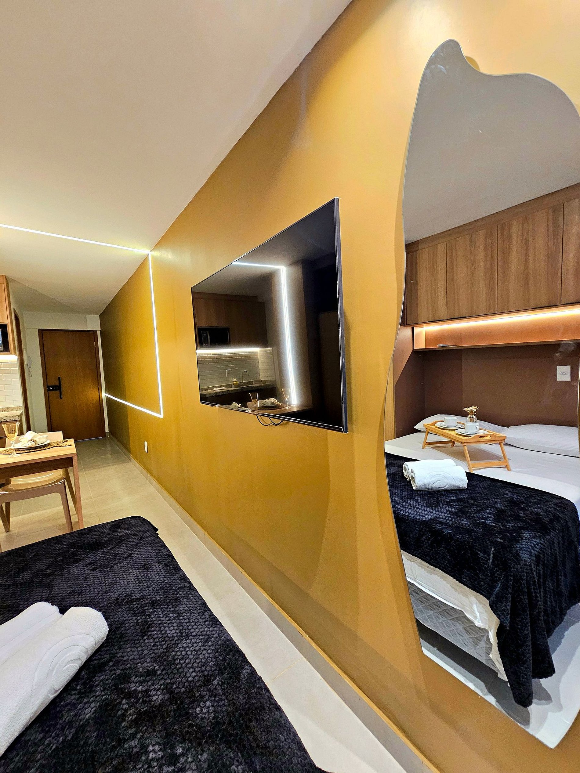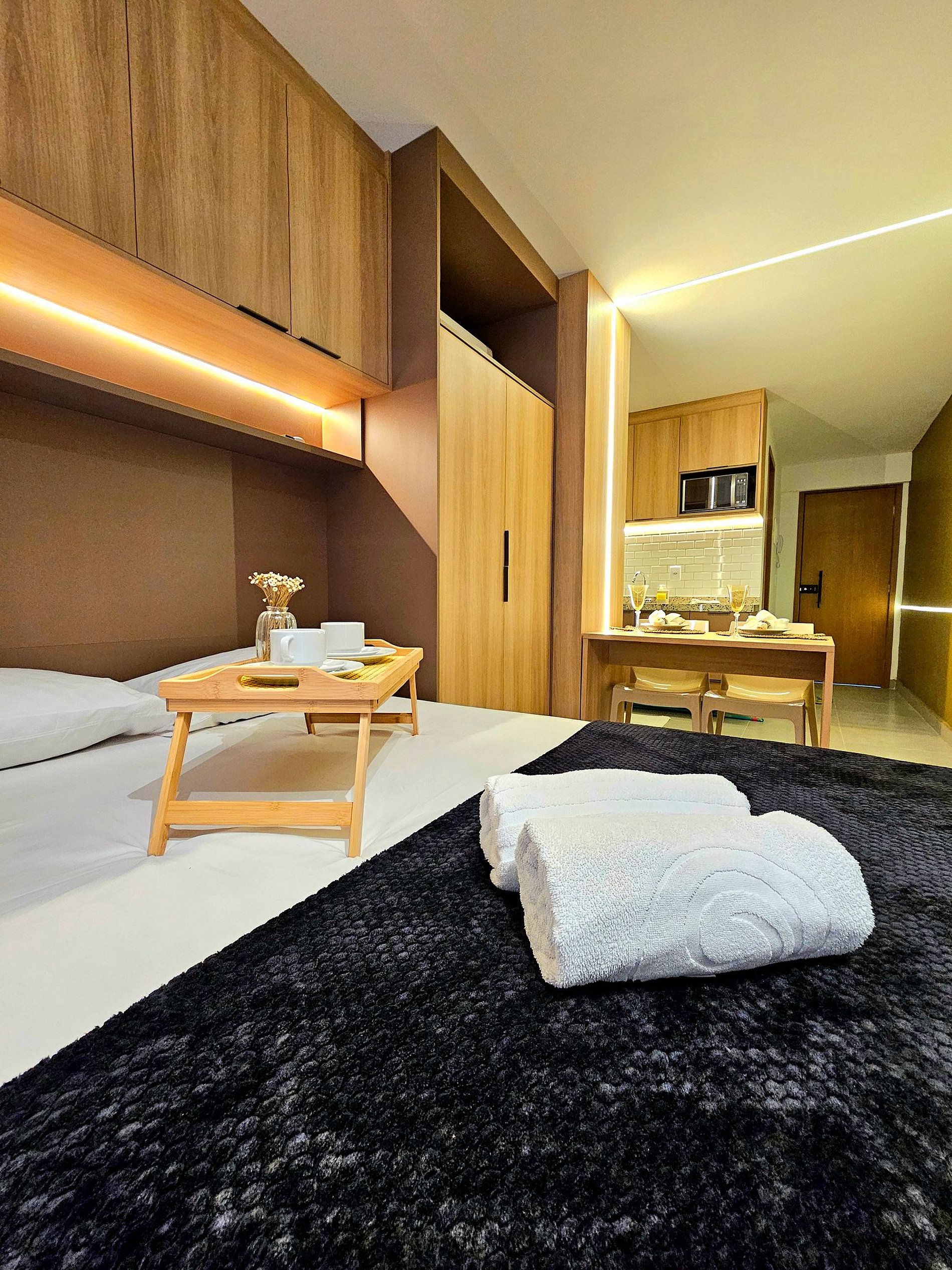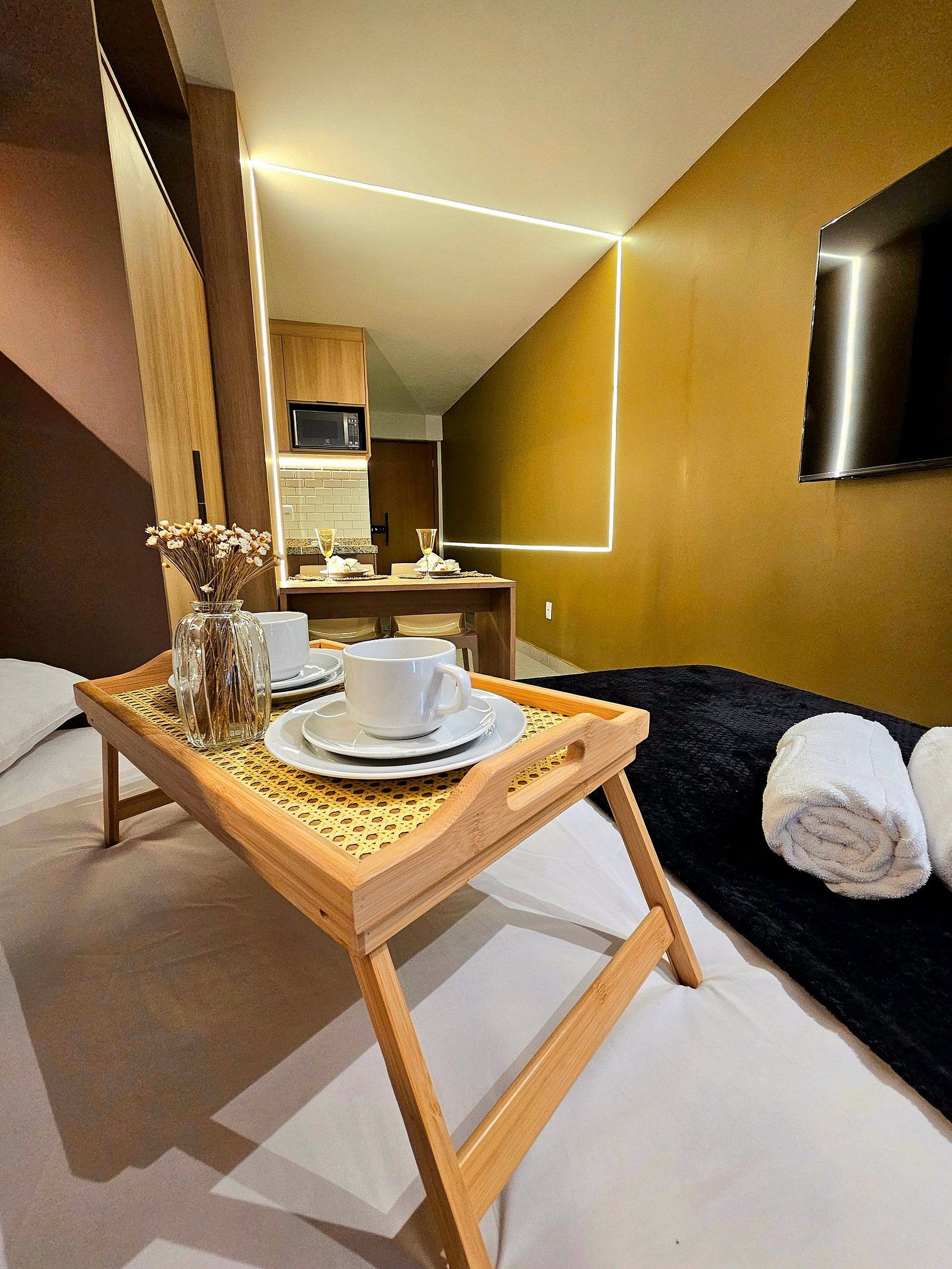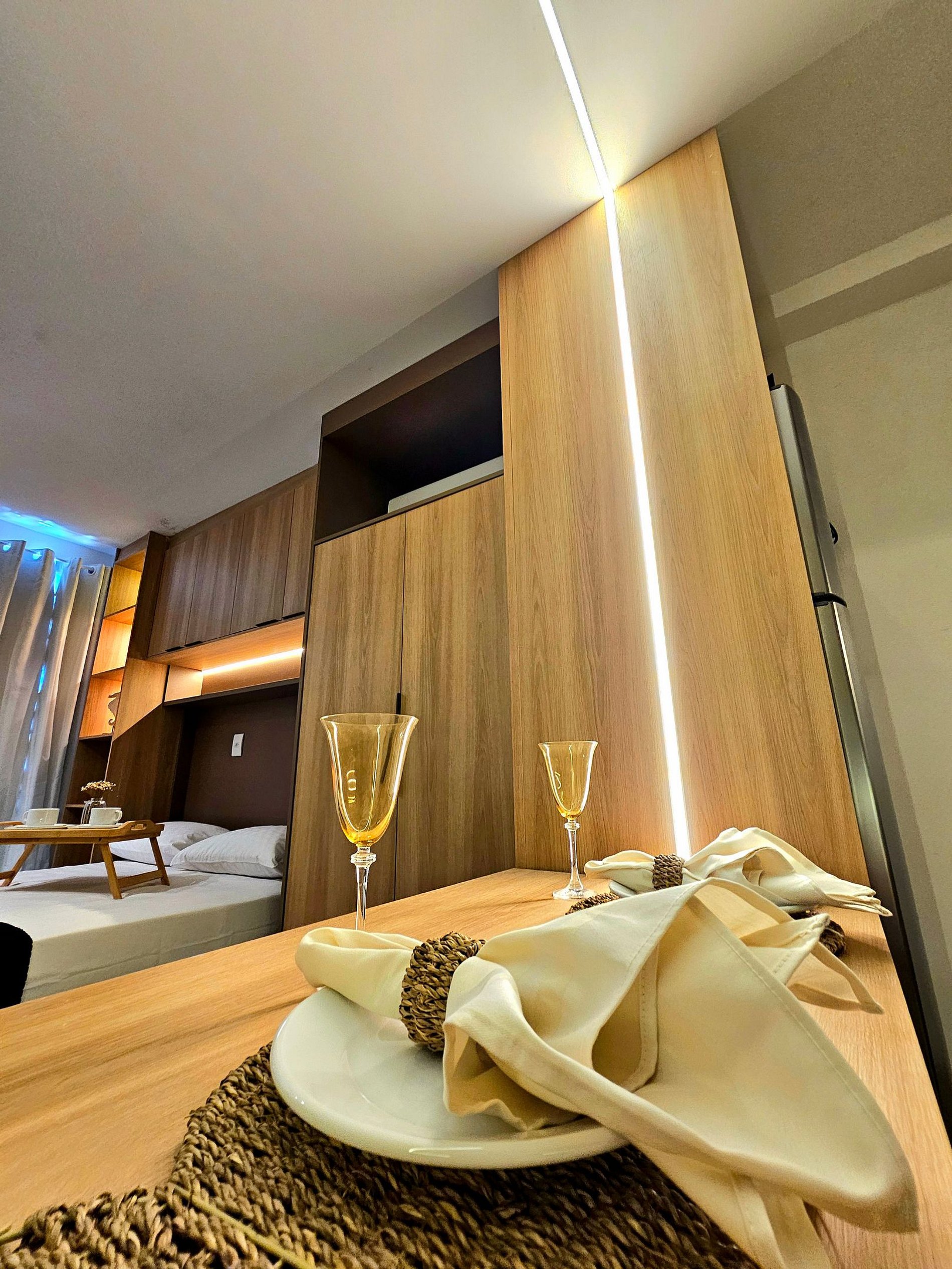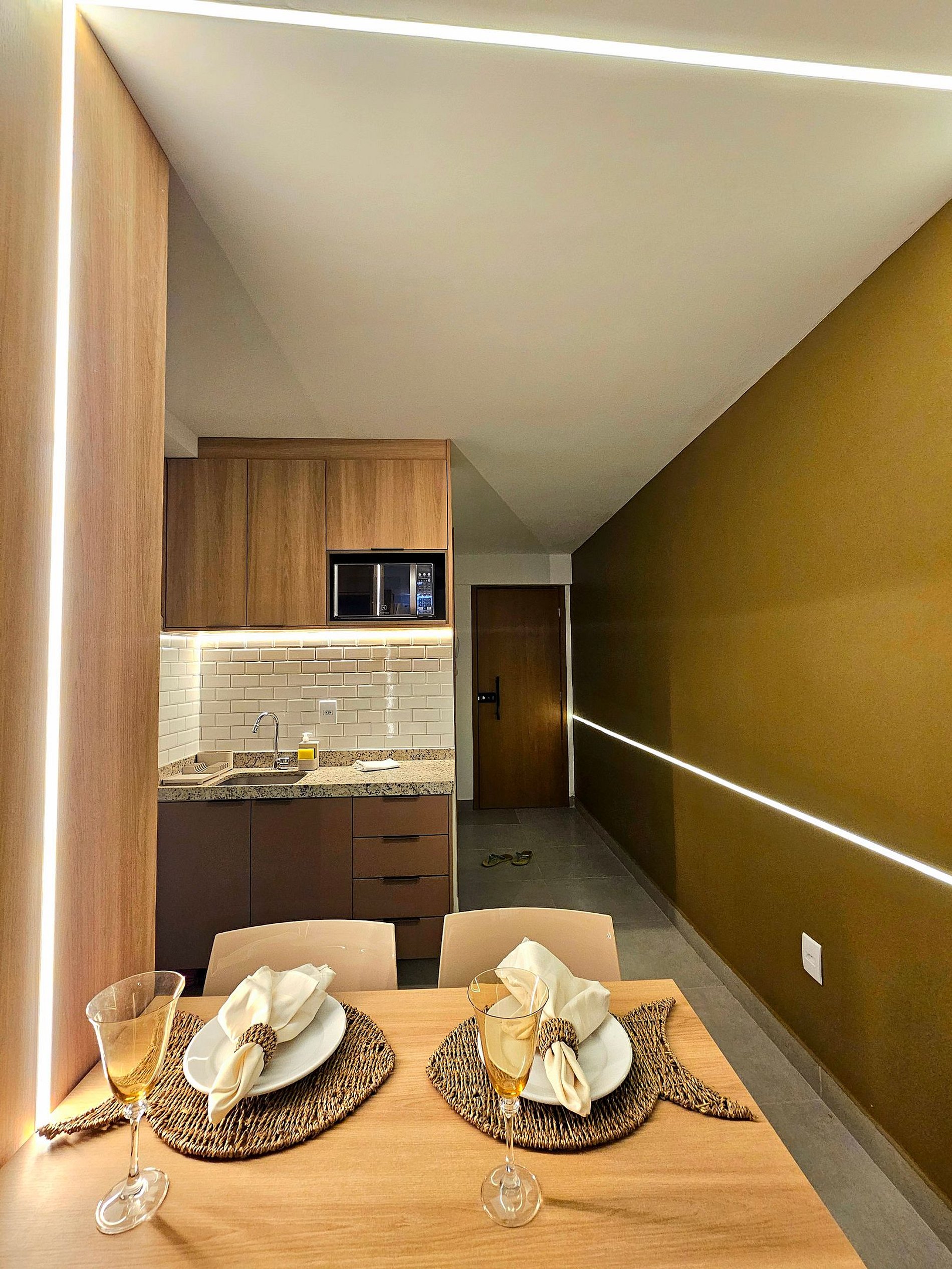 Decoração Moderna e Iluminação Planejada: A decoração do apartamento segue um estilo moderno e elegante, com detalhes em cores neutras e iluminação indireta que criam uma atmosfera aconchegante e sofisticada. As luzes estrategicamente posicionadas proporcionam um ambiente acolhedor, ideal tanto para momentos de relaxamento quanto para criar um clima especial durante suas noites no Cupe Exclusive.