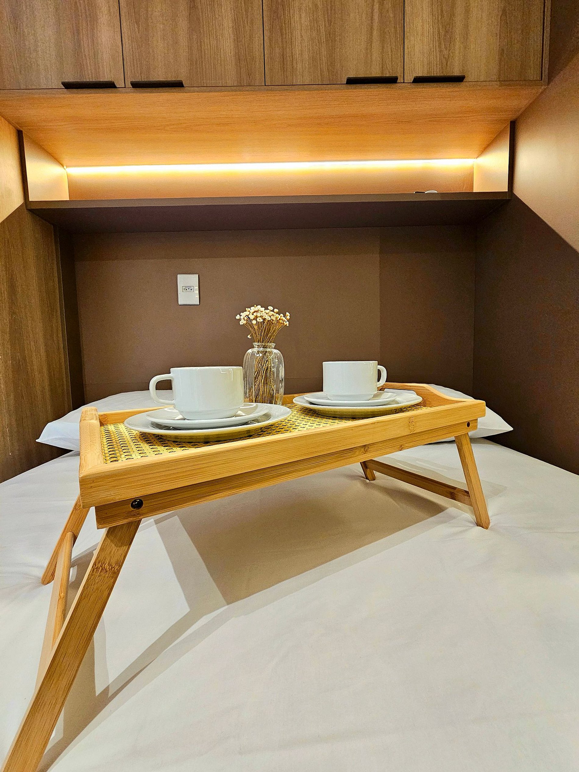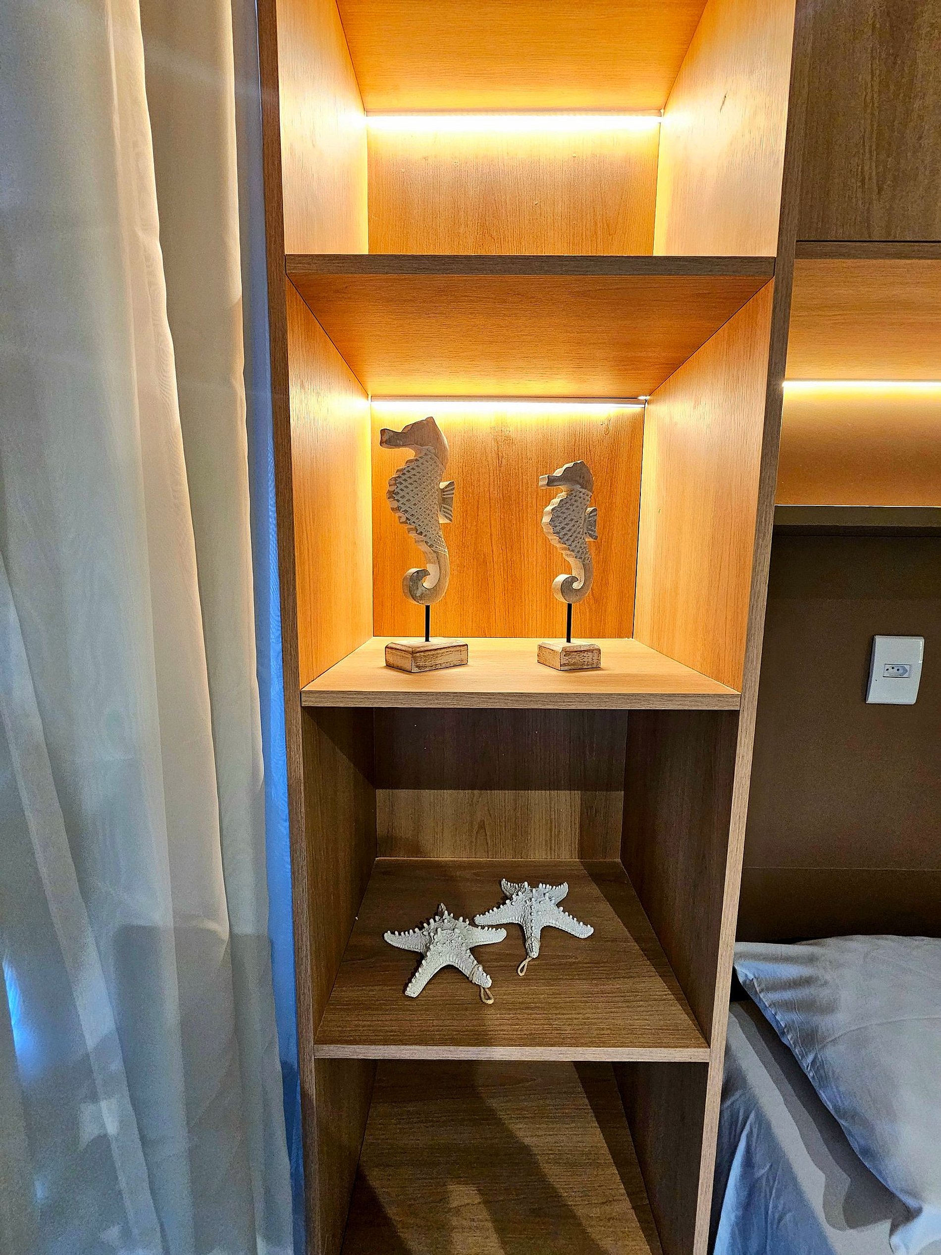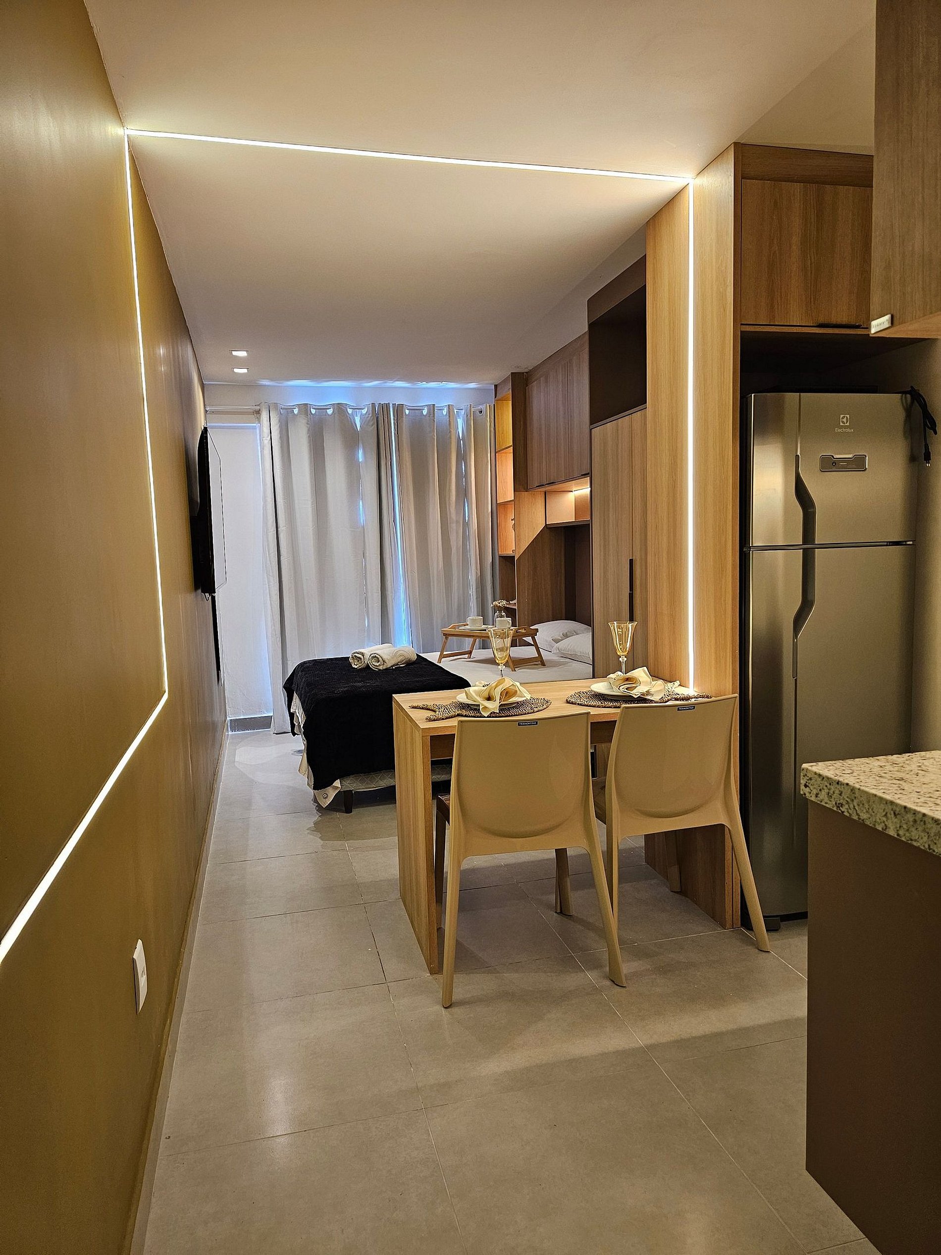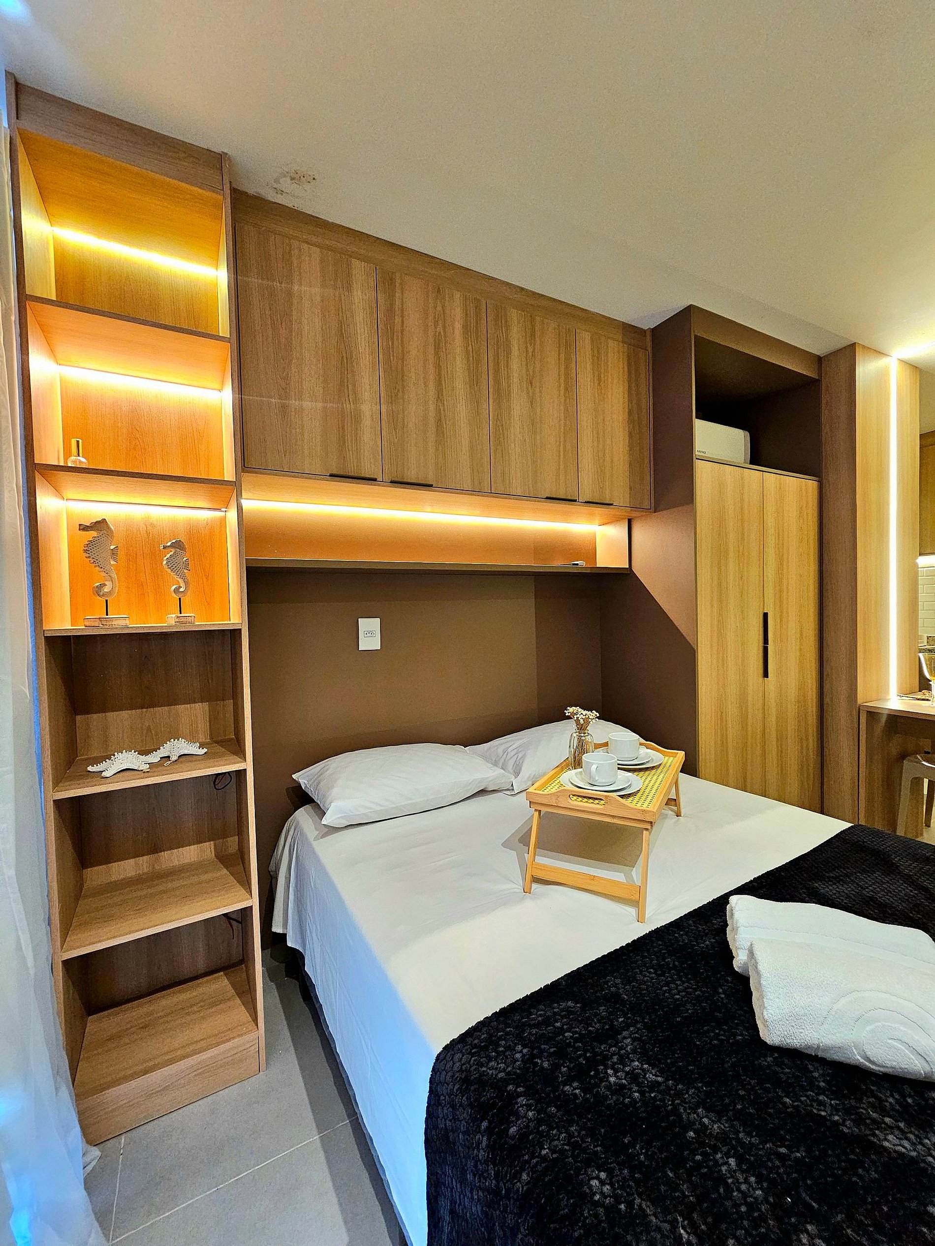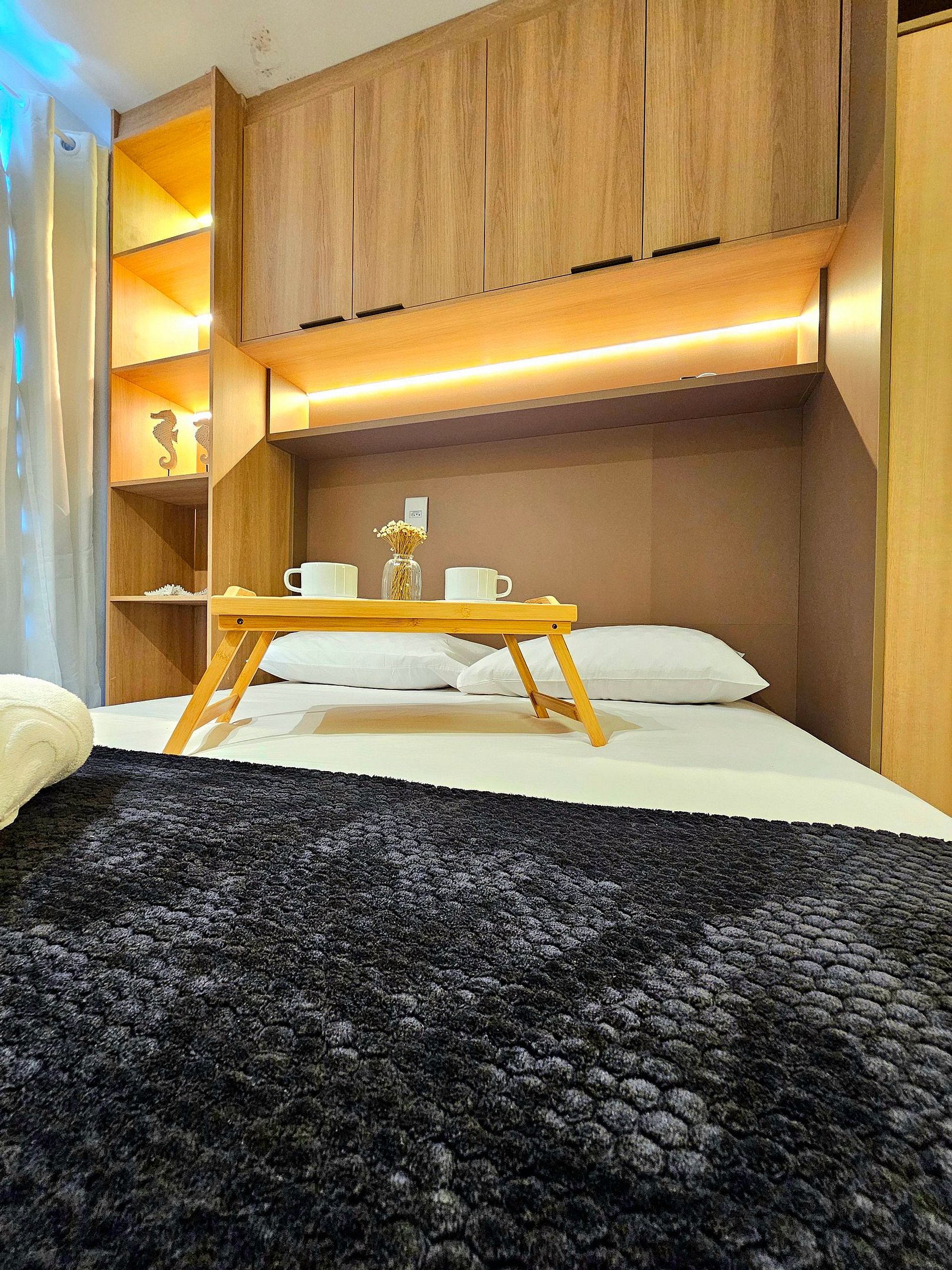 Decoração Moderna e Iluminação Planejada: A decoração do apartamento segue um estilo moderno e elegante, com detalhes em cores neutras e iluminação indireta que criam uma atmosfera aconchegante e sofisticada. As luzes estrategicamente posicionadas proporcionam um ambiente acolhedor, ideal tanto para momentos de relaxamento quanto para criar um clima especial durante suas noites no Cupe Exclusive.