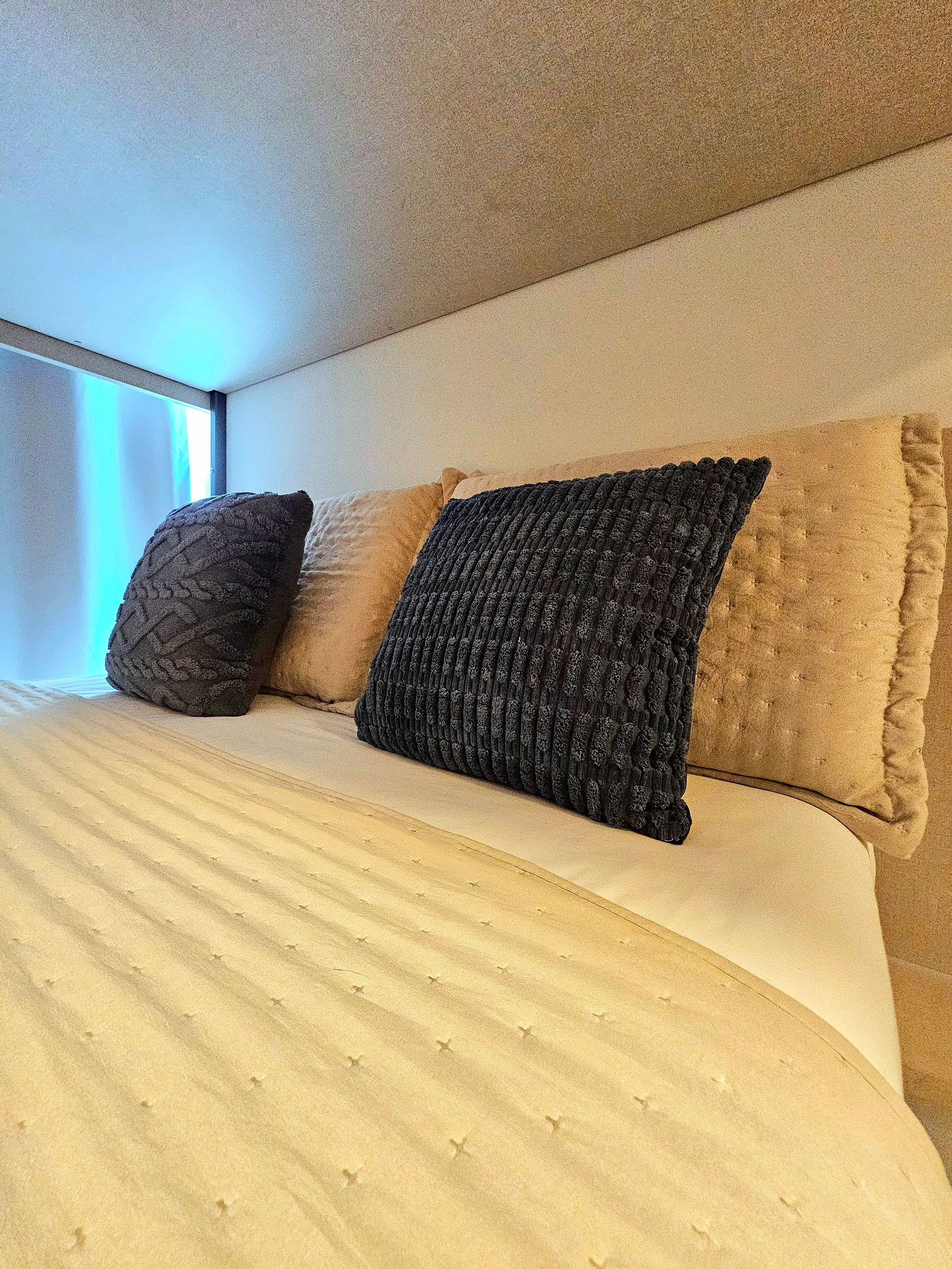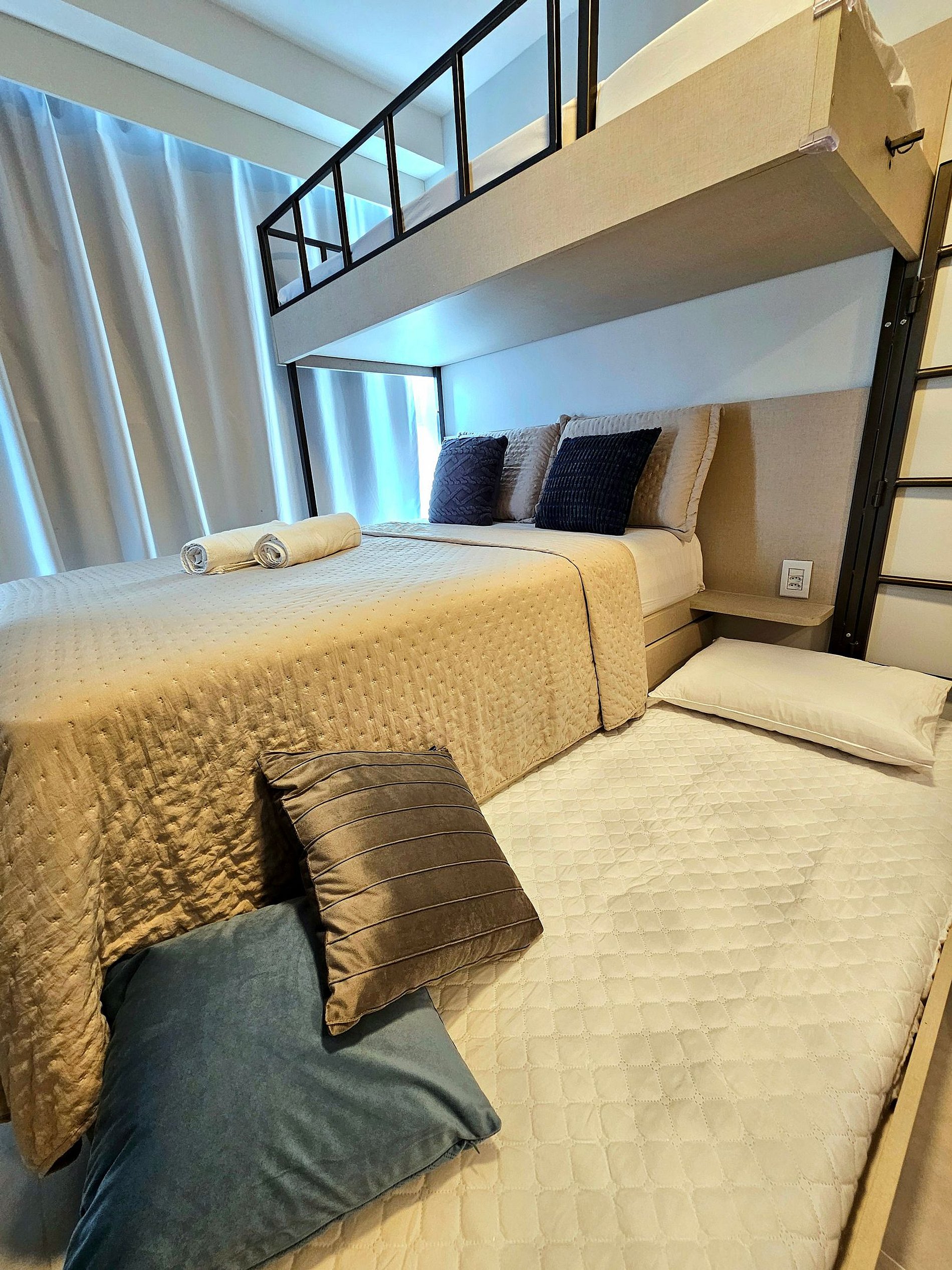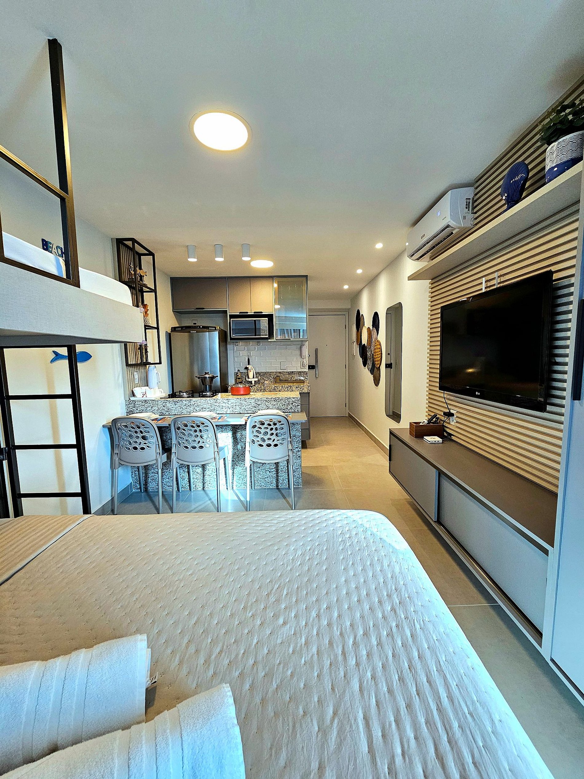 Conforto e Praticidade O studio acomoda confortavelmente até quatro hóspedes, dispondo de uma cama de casal uma cama auxiliar e uma cama elevada (para Adultos de até 85kg). Cada elemento foi pensado para proporcionar o máximo de conforto e uma excelente noite de sono.