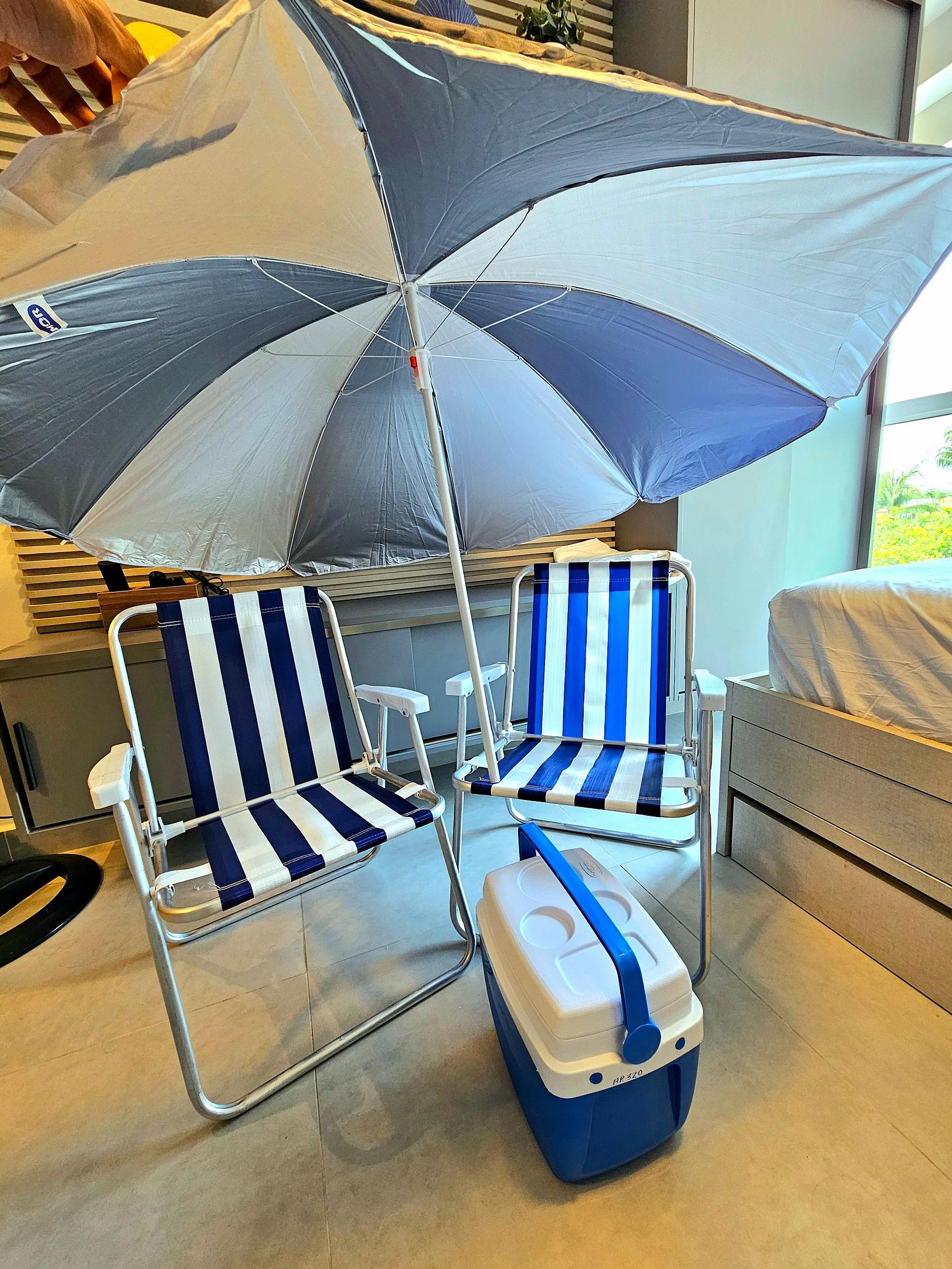 Dispomos também de kit praia com 2 cadeiras, guarda-sol e cooler.