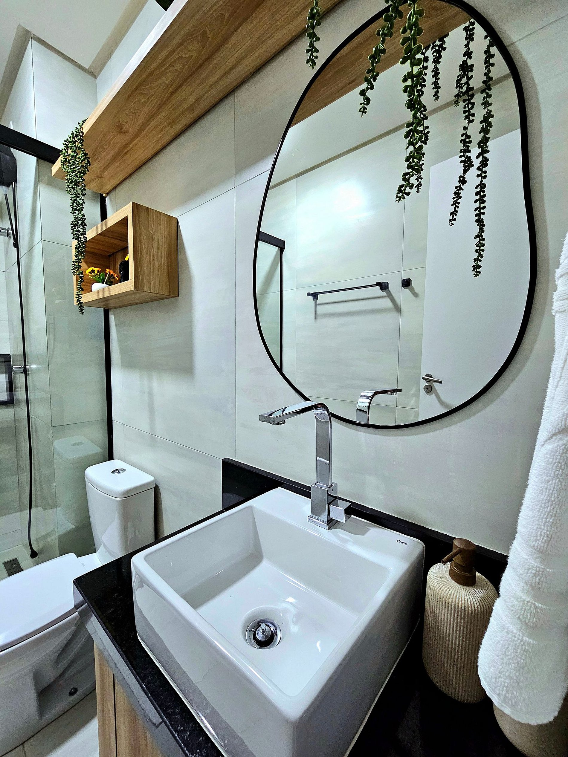 A cozinha completa é equipada com os principais eletrodomésticos, como geladeira, cooktop, airfryer, liquidificador, sanduicheira e cafeteira, além de todos os utensílios necessários para que você possa preparar suas refeições de maneira prática e confortável. O espaço foi projetado para que você tenha tudo o que precisa ao seu alcance, garantindo uma estadia funcional e aconchegante.