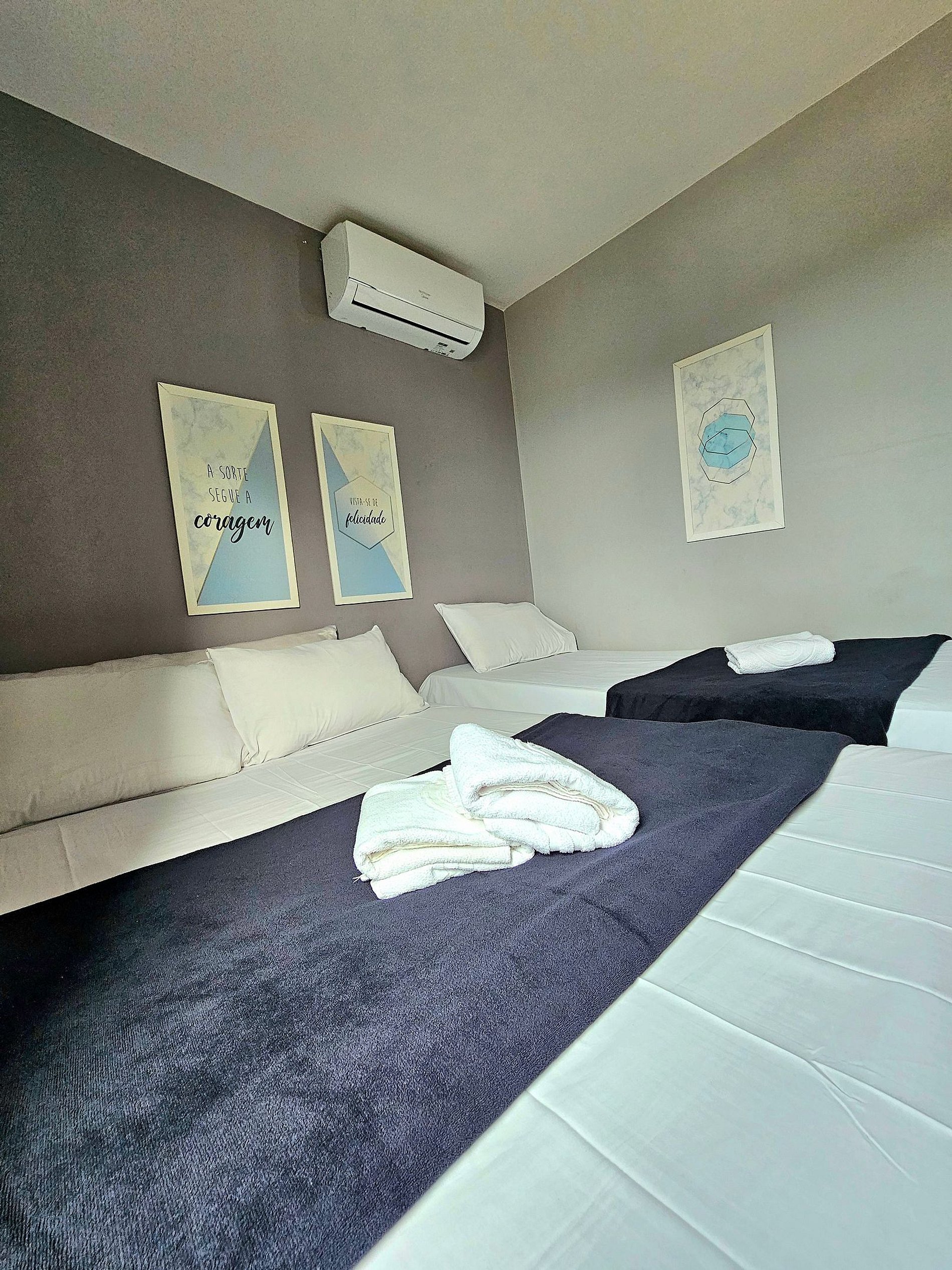Os três quartos oferecem bastante flexibilidade, com uma suíte equipada com uma cama de casal, um dos quartos social com uma cama de casal e outra de solteiro e o terceiro quarto com 2 camas de solteiro, Essa configuração permite acomodar até 7 hóspedes de forma prática e confortável. Todos os quartos são climatizados, proporcionando conforto em qualquer época do ano.