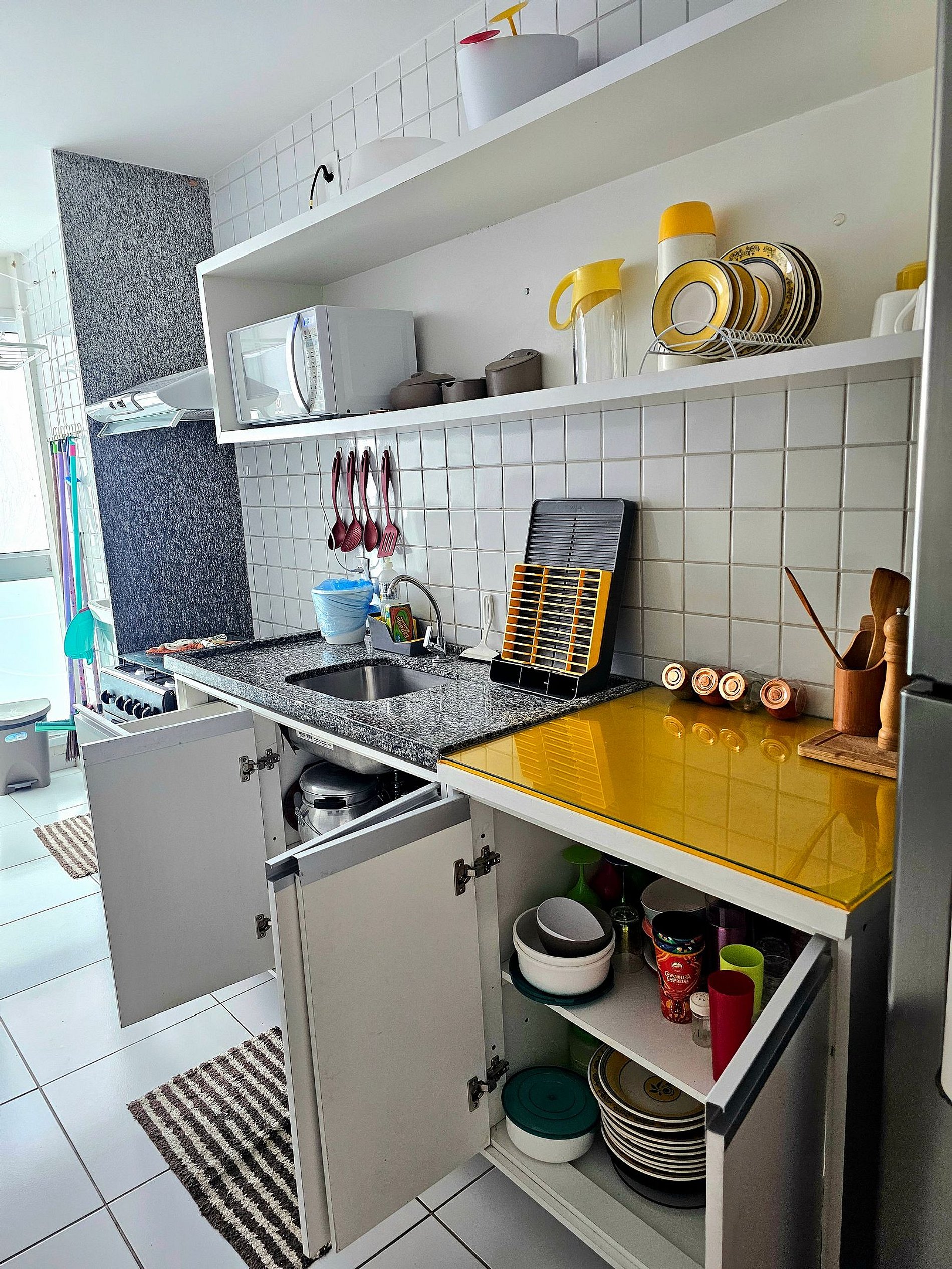 A cozinha completa inclui fogão, panelas e os principais eletrodomésticos, como geladeira, micro-ondas, cafeteira, liquidificador e airfryer, garantindo que você possa preparar suas refeições com facilidade durante a estadia. A área de jantar é integrada à sala, proporcionando um ambiente espaçoso para refeições e momentos de convivência.