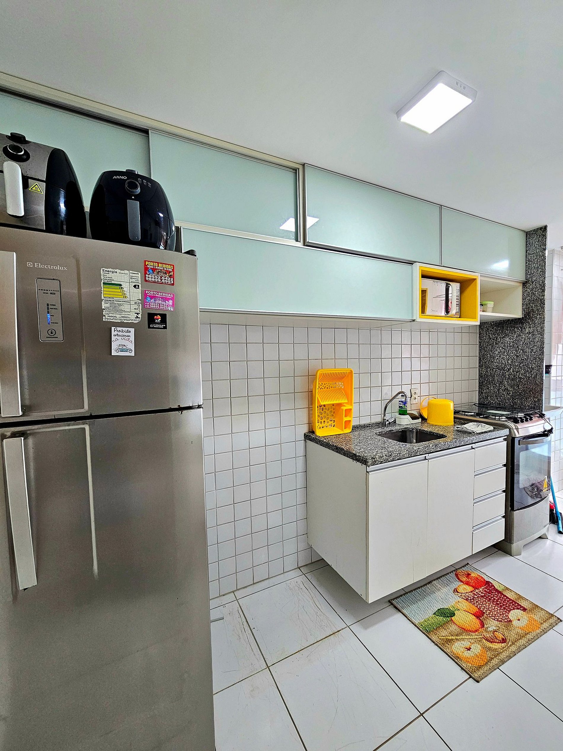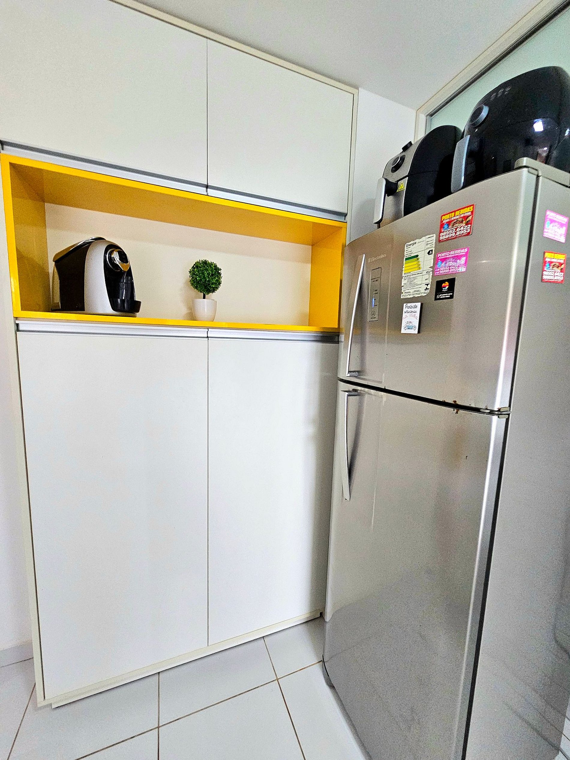 A cozinha completa inclui fogão, panelas e os principais eletrodomésticos, como geladeira, micro-ondas e cafeteira, airfryer, etc.. garantindo que você possa preparar suas refeições com facilidade durante a estadia. A área de jantar é integrada à sala, proporcionando um ambiente espaçoso para refeições e momentos de convivência.