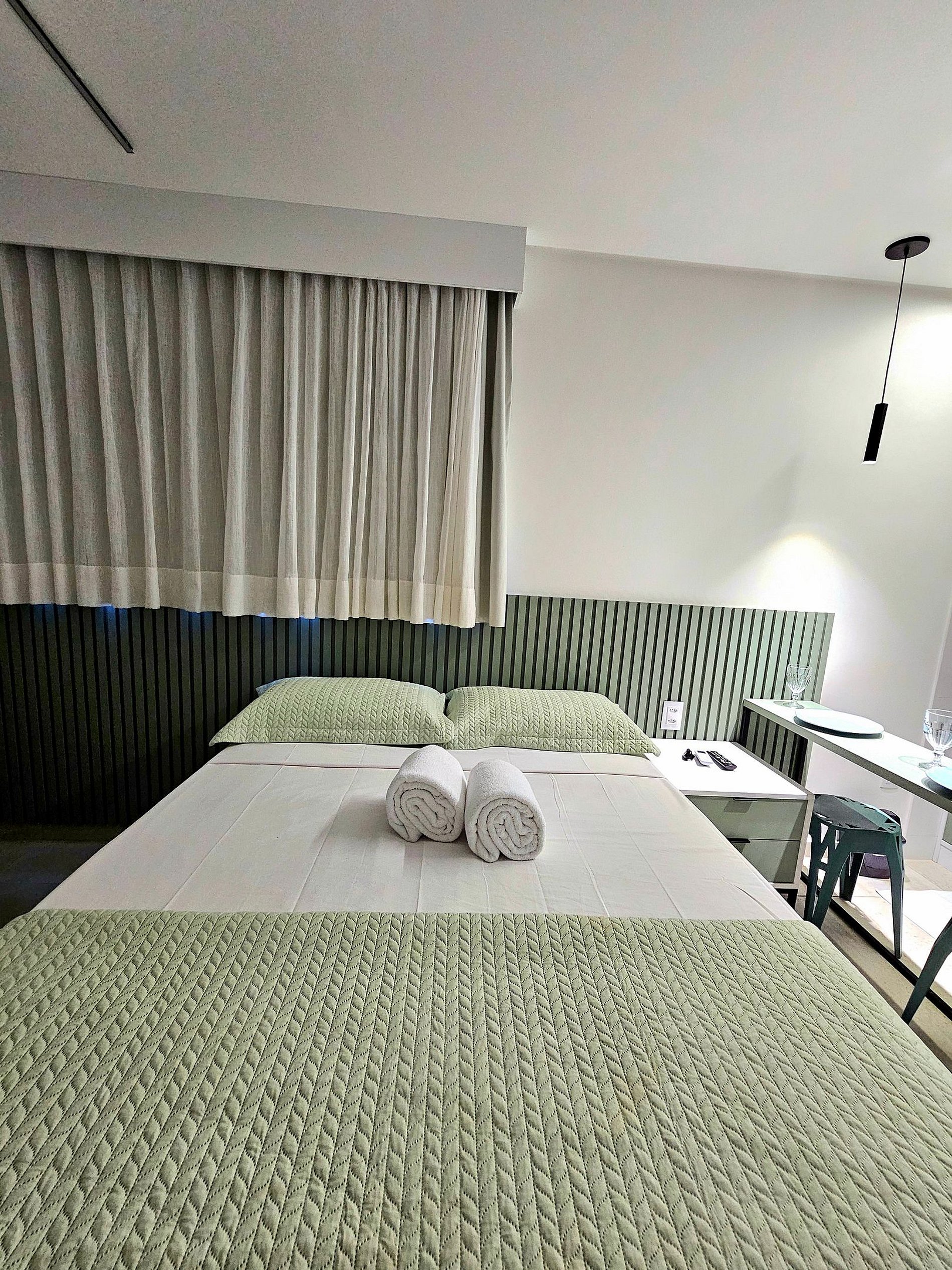 Conforto e Praticidade: O studio acomoda confortavelmente até quatro hóspedes, dispondo de uma cama de casal, uma cama de solteiro e 1 cama auxiliar de solteiro (embaixo da cama de solteiro). Cada elemento foi pensado para proporcionar o máximo de conforto e uma boa noite de sono.