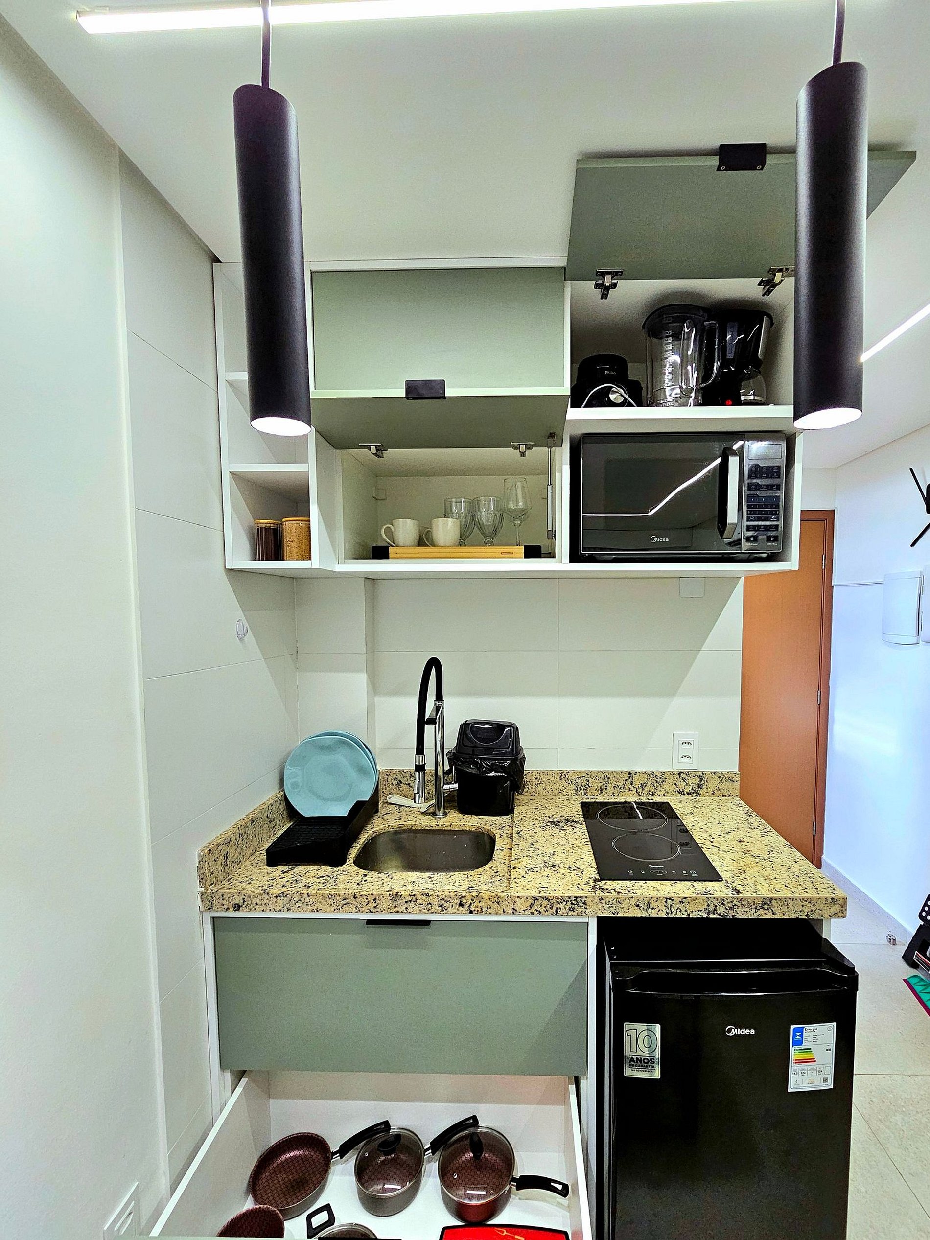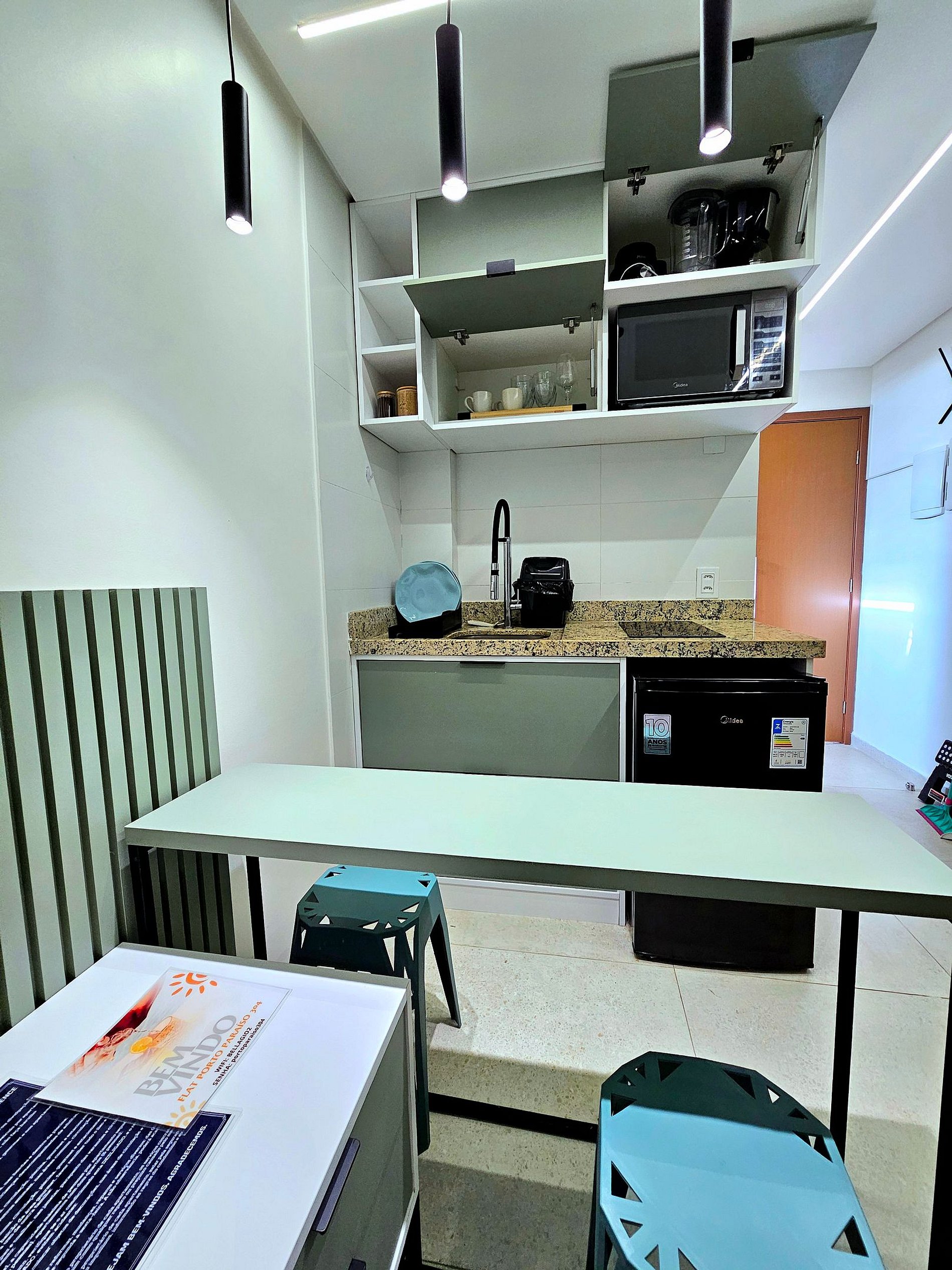 Cozinha Equipada Prepare suas refeições com facilidade na cozinha bem equipada, que inclui os principais eletrodomésticos modernos (Liquidificador, cafeteira, microondas, sanduicheira). Seja para um café da manhã rápido antes de explorar a cidade ou para um jantar especial, você encontrará tudo o que precisa para cozinhar com praticidade e eficiência.