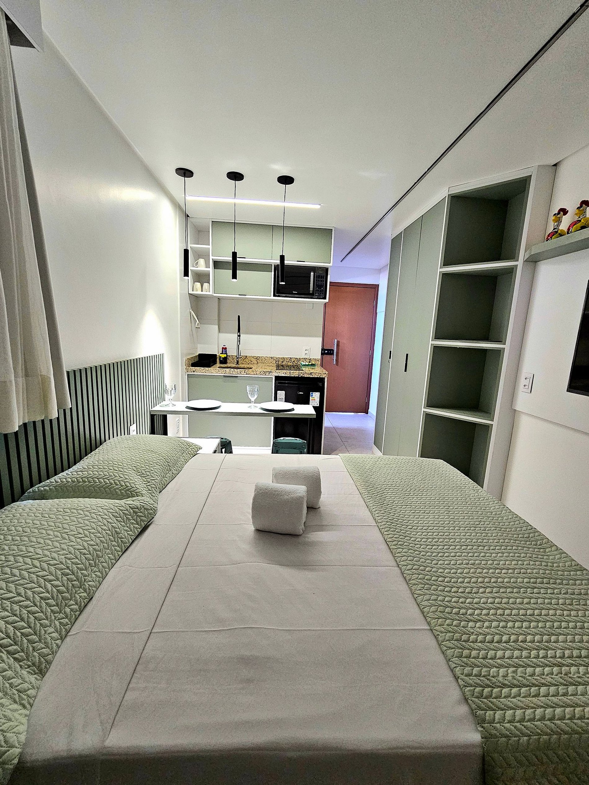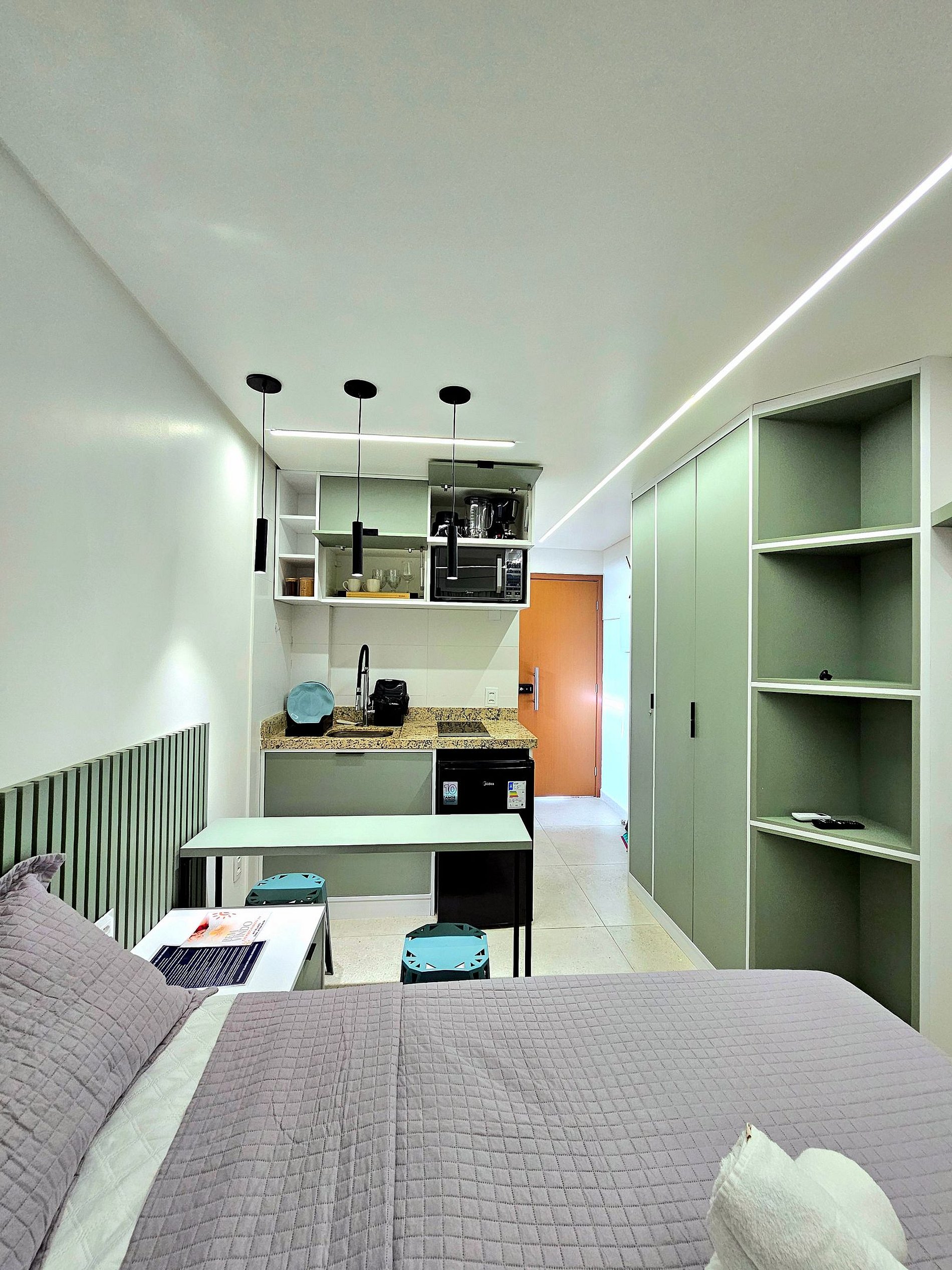 Conforto e Praticidade: O studio acomoda confortavelmente até quatro hóspedes, dispondo de uma cama de casal, uma cama de solteiro e 1 cama auxiliar de solteiro (embaixo da cama de solteiro). Cada elemento foi pensado para proporcionar o máximo de conforto e uma boa noite de sono.