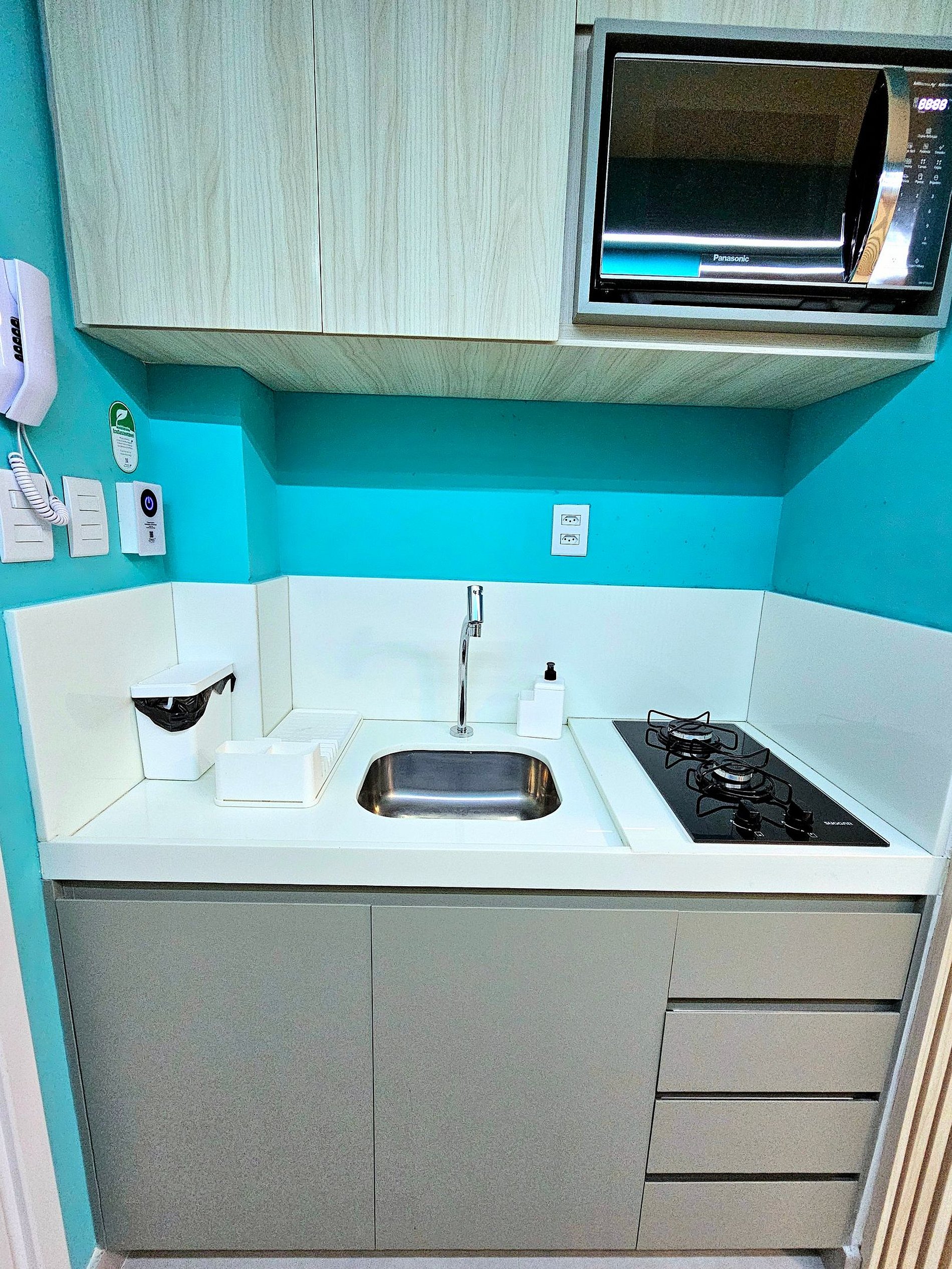Cozinha Equipada: Prepare suas refeições com facilidade na cozinha bem equipada, que inclui os principais eletrodomésticos modernos (Liquidificador, Air fryer, cafeteira, microondas, sanduicheira). Seja para um café da manhã rápido antes de explorar a cidade ou para um jantar especial, você encontrará tudo o que precisa para cozinhar com praticidade e eficiência.