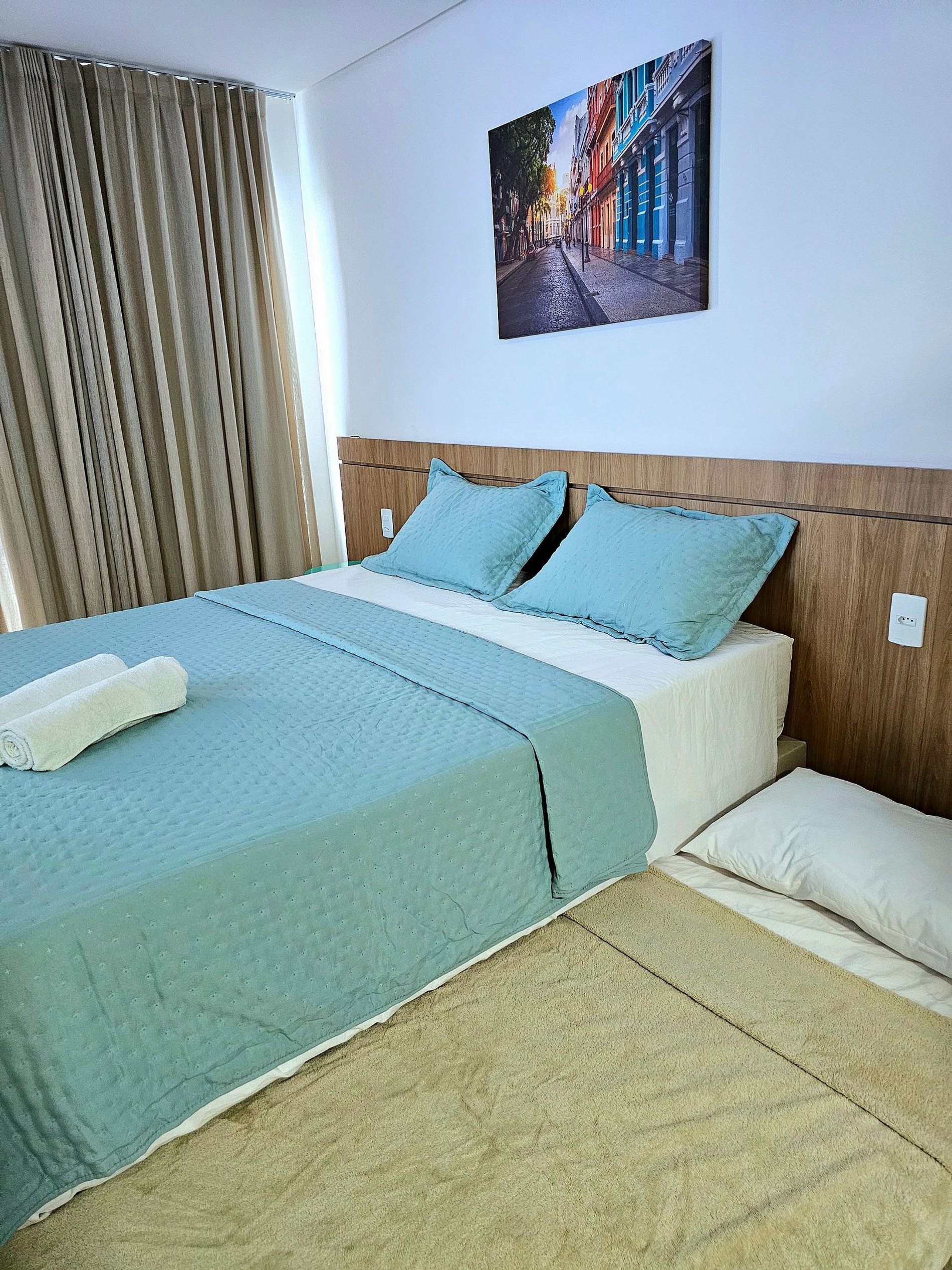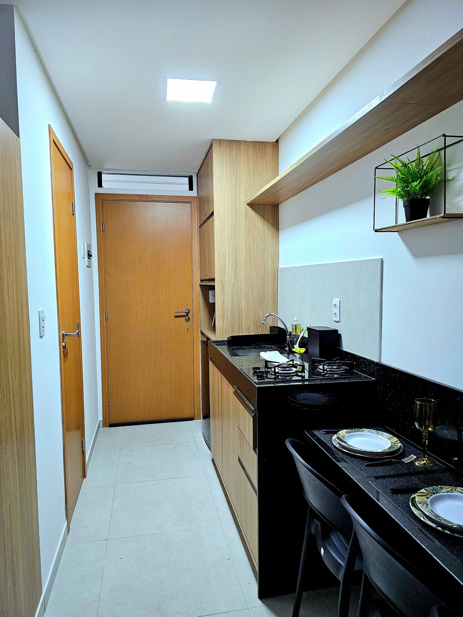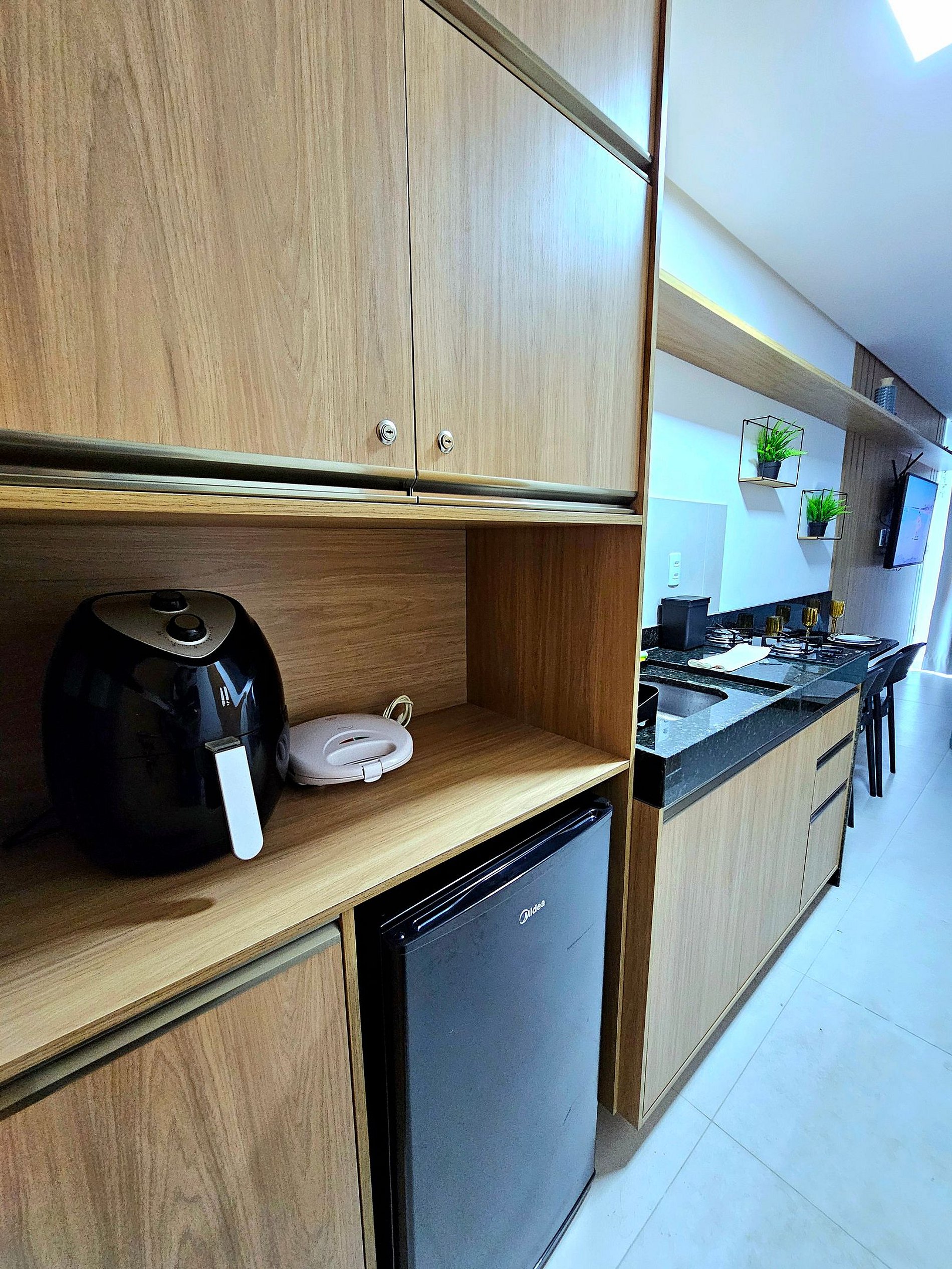 Nossa unidade possui 1 cama de casal e 1 Auxiliar de solteiro, a cozinha possui os principais eletrodomésticos (cooktop 2 bocas, airfryer, microondas, sanduicheira, liquidificador, frigobar, conjunto de panelas, travessas, etc...), possuímos na nossa unidade uma área externa com a exclusiva piscina privativa que é perfeita para um fim de tarde!