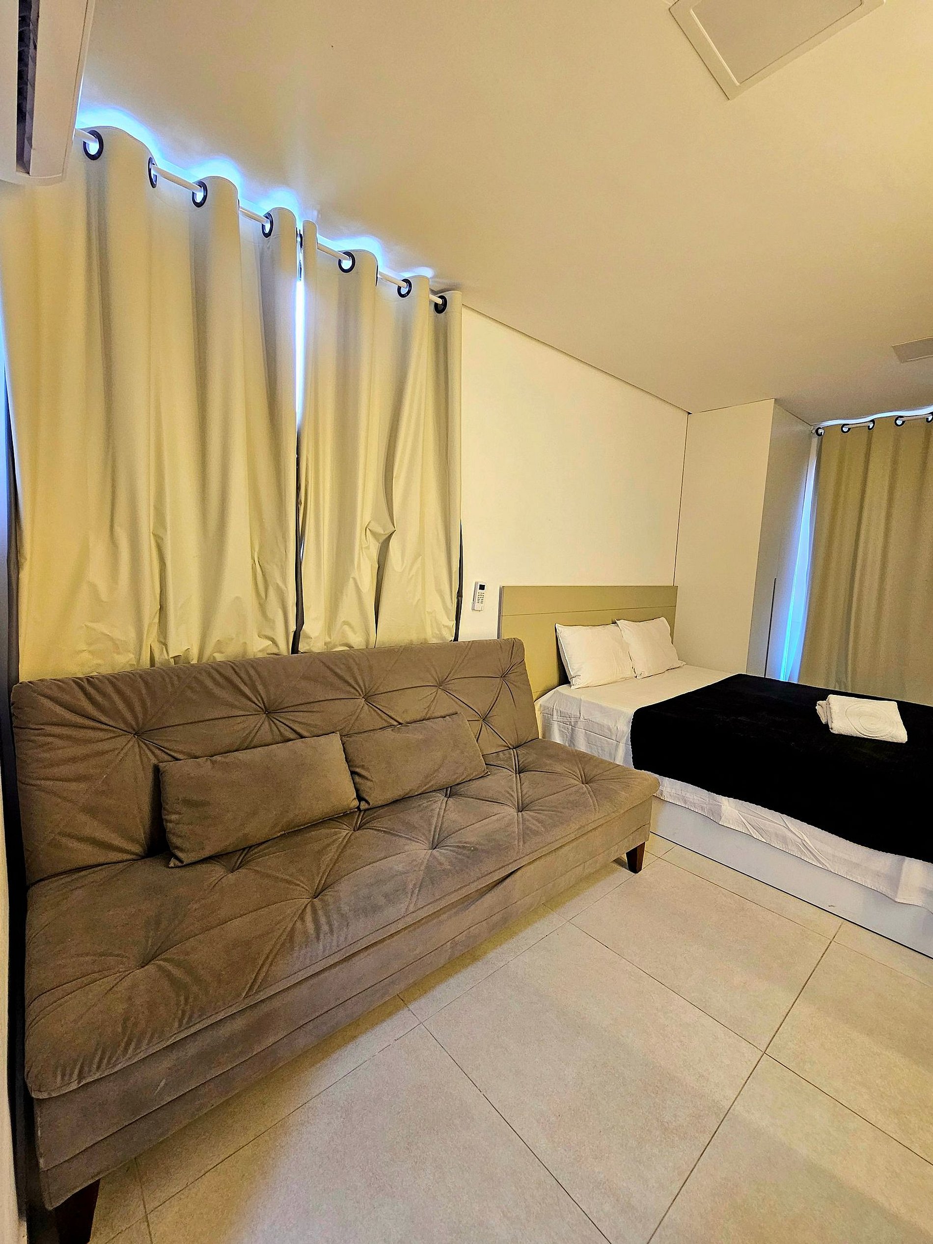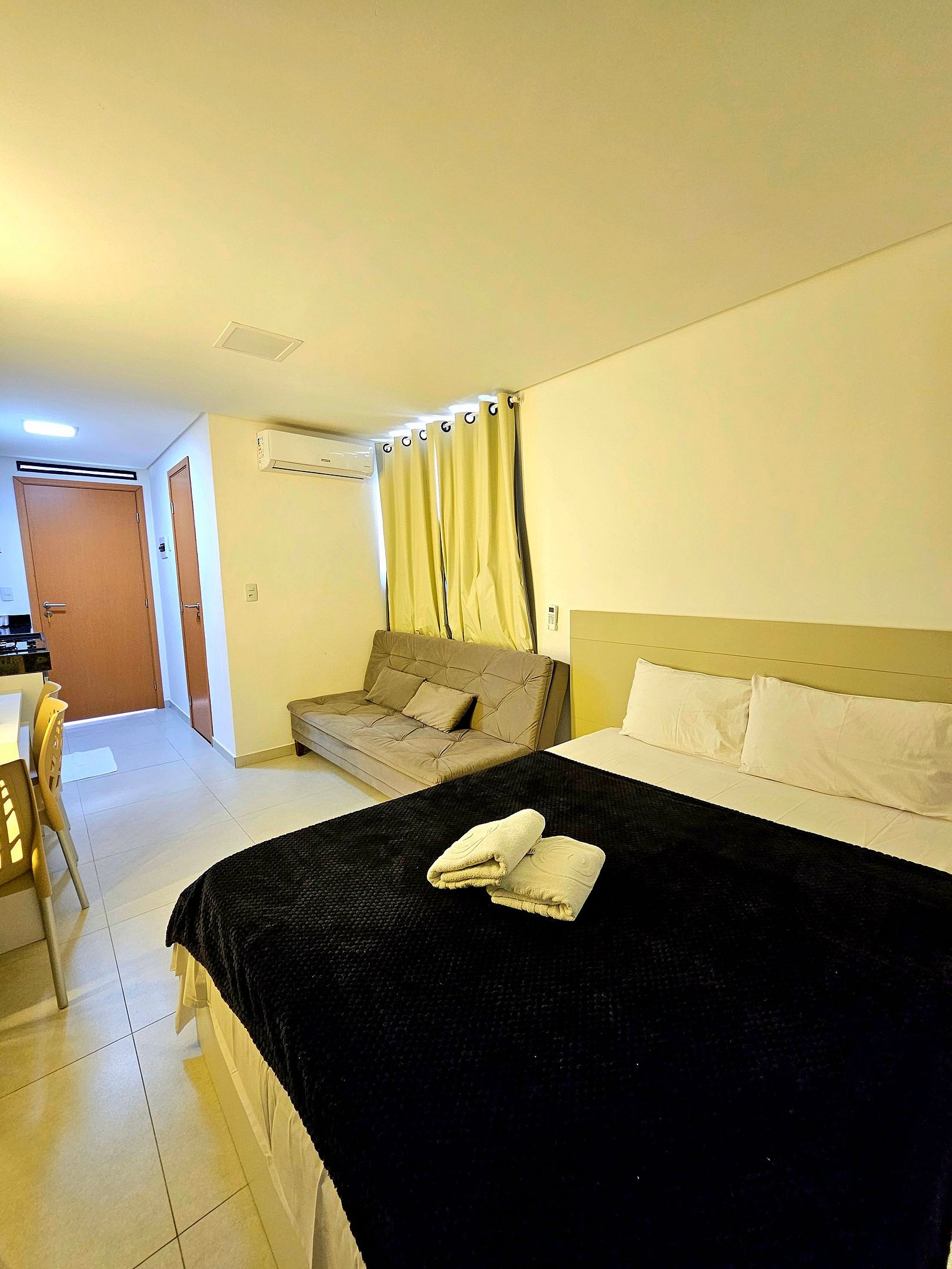 Nossa unidade possui 1 cama de casal e 1 sofá-cama casal, a cozinha possui os principais eletrodomésticos (cooktop 2 bocas, microondas, sanduicheira, liquidificador, cafeteira, frigobar, conjunto de panelas, travessas, etc...), ou seja, tudo o que é necessário para uma estadia com muito conforto e comodidade.