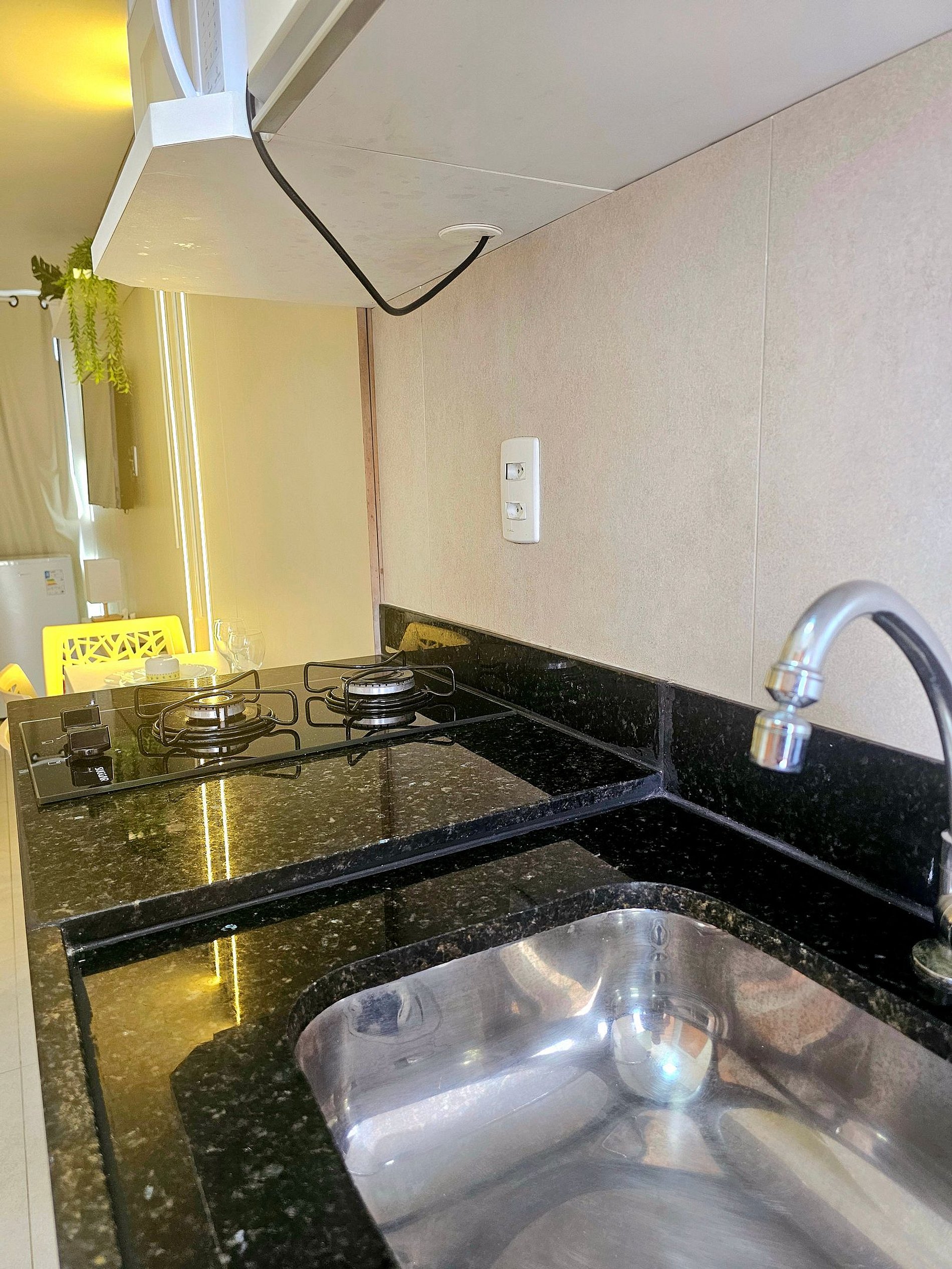 Nossa unidade possui 1 cama de casal e 1 sofá-cama casal, a cozinha possui os principais eletrodomésticos (cooktop 2 bocas, microondas, sanduicheira, liquidificador, cafeteira, frigobar, conjunto de panelas, travessas, etc...), ou seja, tudo o que é necessário para uma estadia com muito conforto e comodidade.