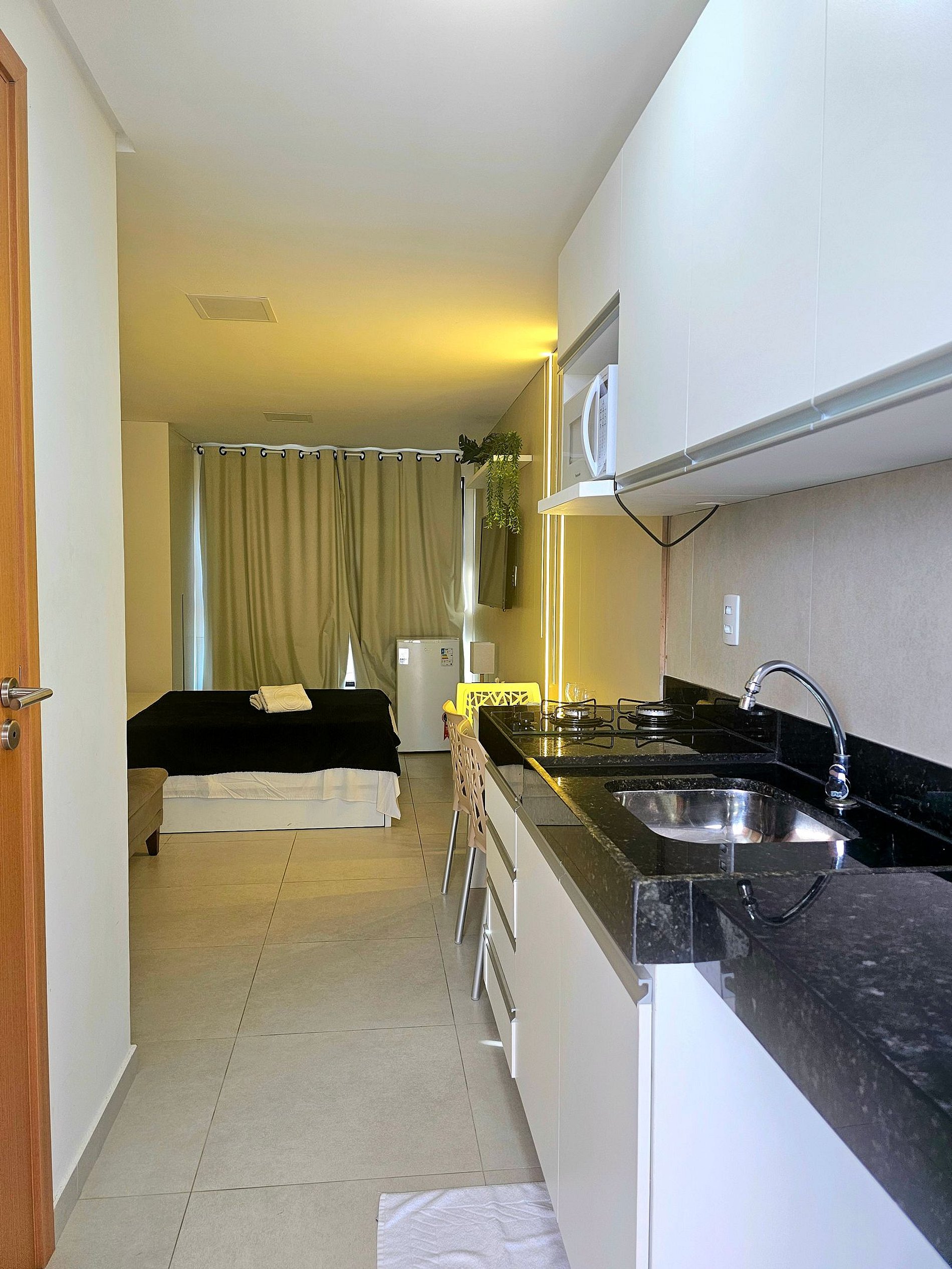 Lindo Flat Studio finamente decorado no centro de Porto de Galinhas. Cozinha completa e equipada, acomoda bem até 4 pessoas, possui ar-condicionado, projeto de mobilias e decoração diferenciados para proporcionar o máximo de conforto. Ideal para aproveitar Porto sem depender de carro!