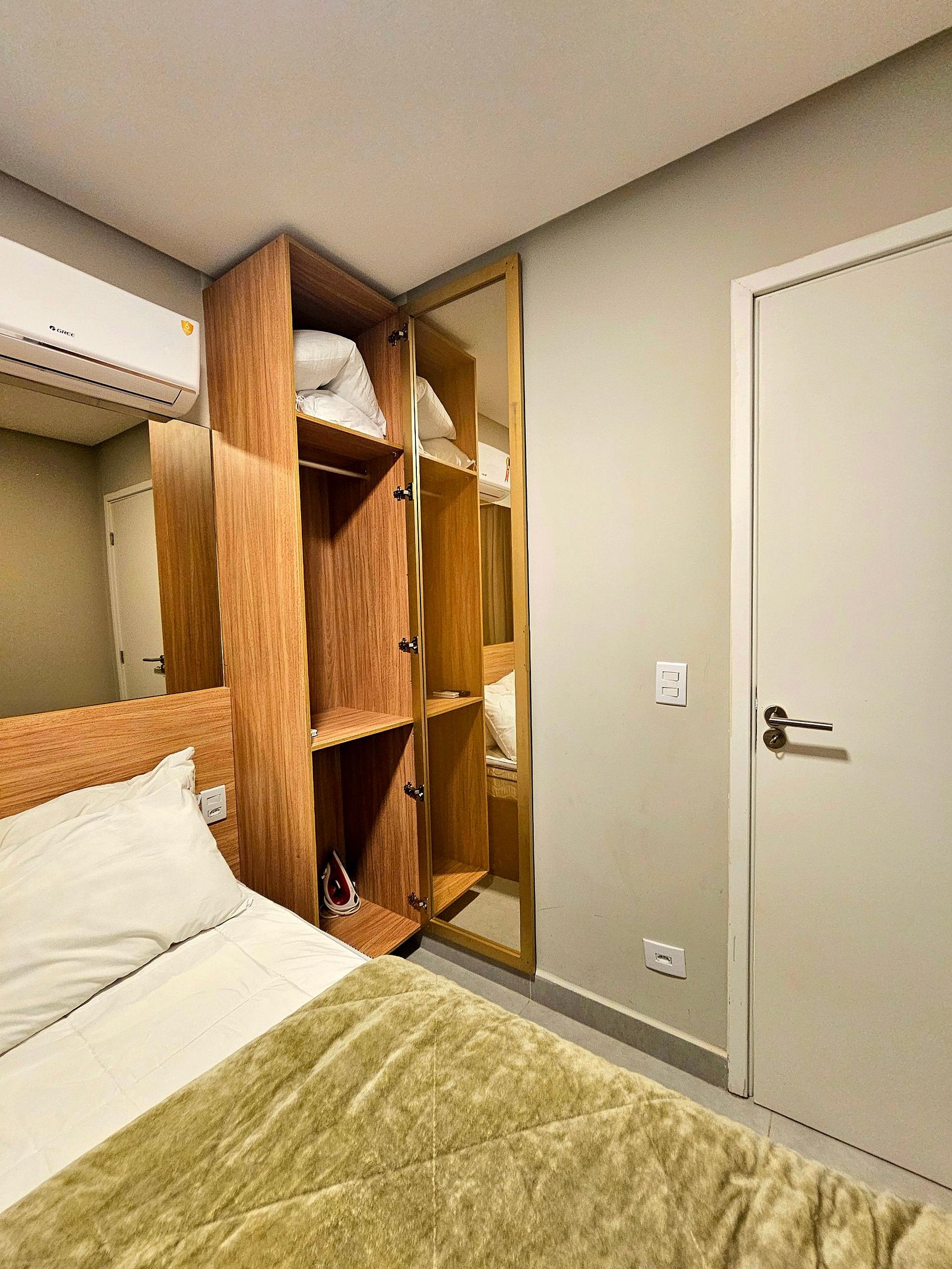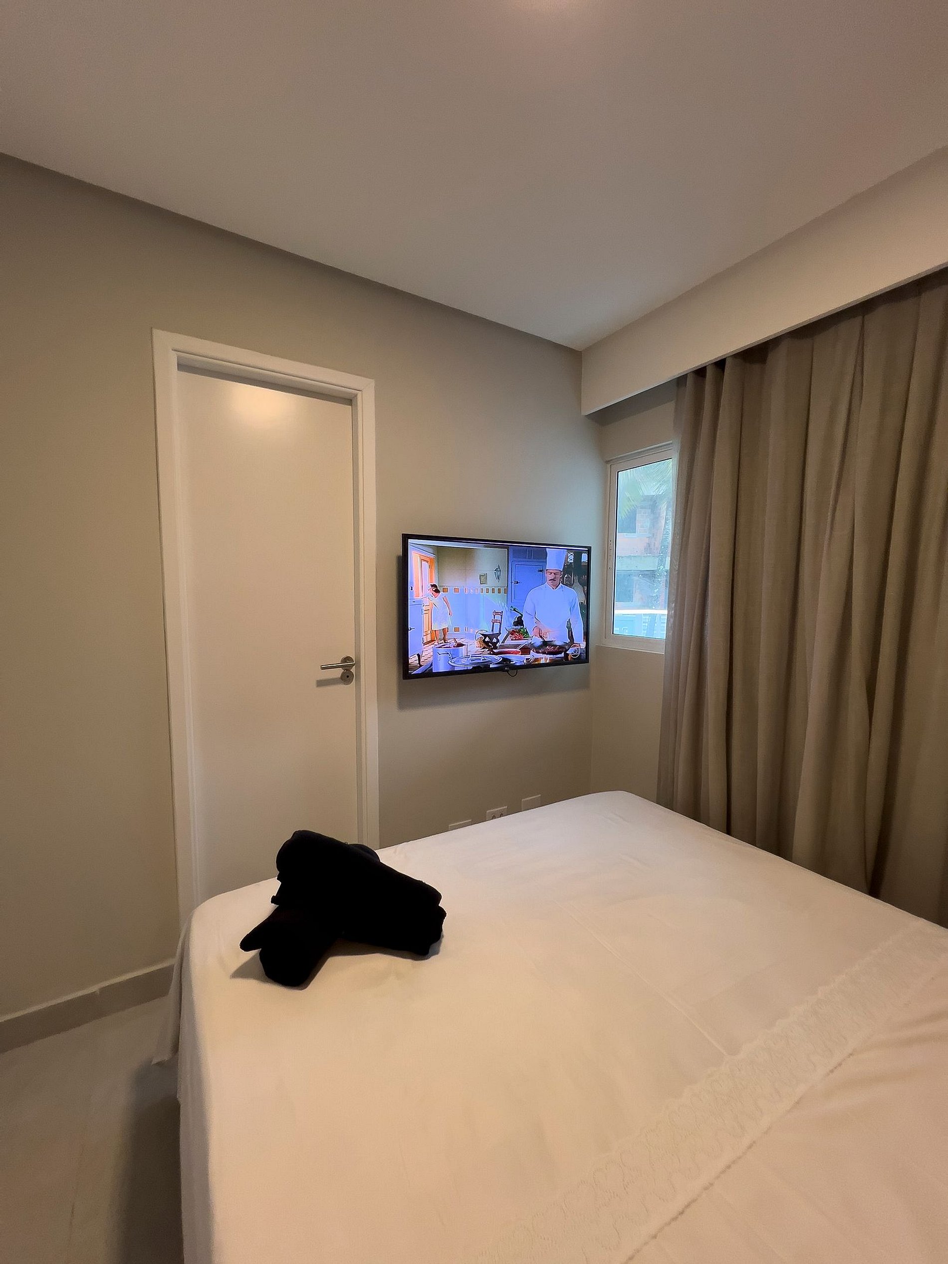 Conforto e Praticidade, o apartamento acomoda confortavelmente até quatro hóspedes, dispondo de uma cama de casal na suíte e um sofá-cama de extrema qualidade na sala (os 2 ambientes climatizados), temos apenas 1 banheiro na unidade que fica na suíte.