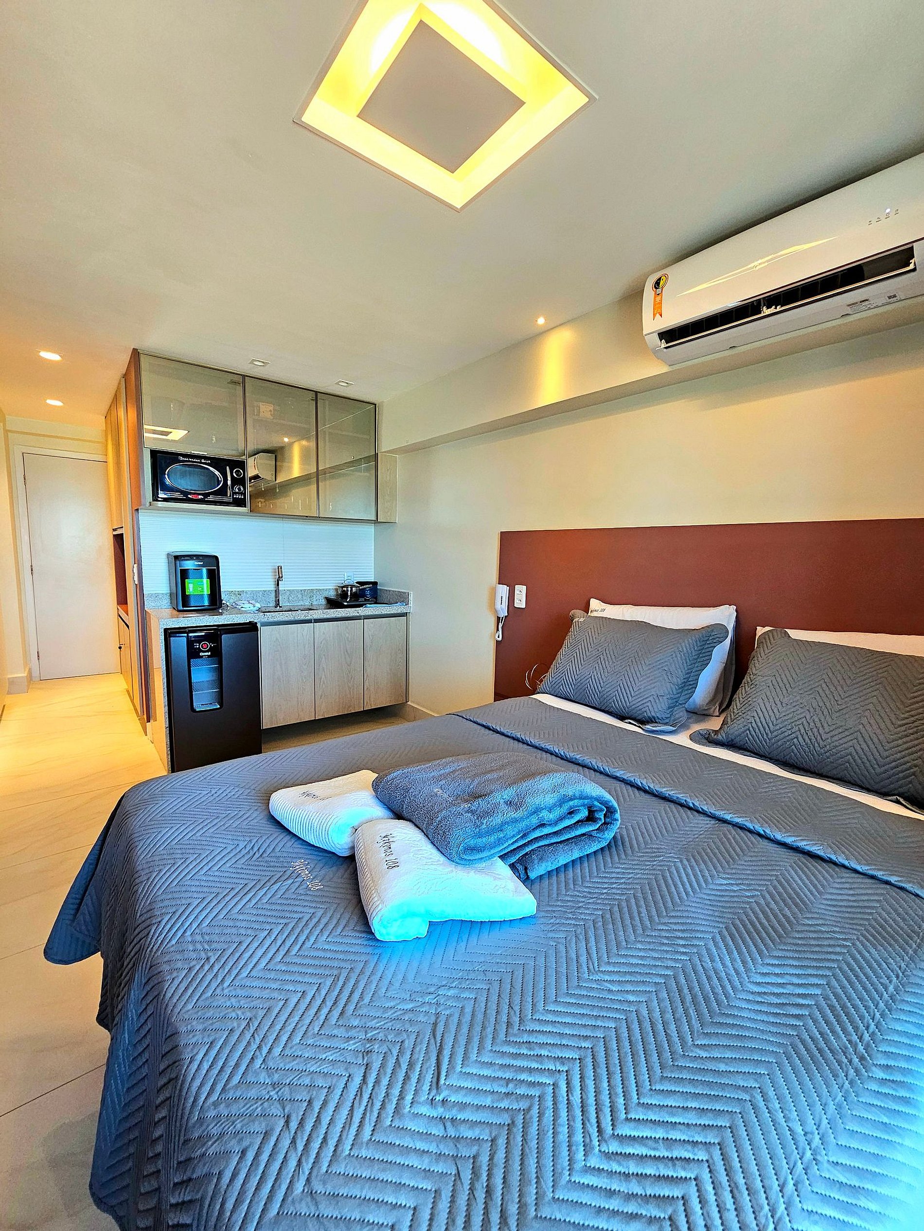 Perfeito para até 3 hóspedes, o studio foi cuidadosamente projetado para oferecer o máximo conforto. Com uma cama de casal aconchegante e uma cama auxiliar, o espaço combina sofisticação e funcionalidade.