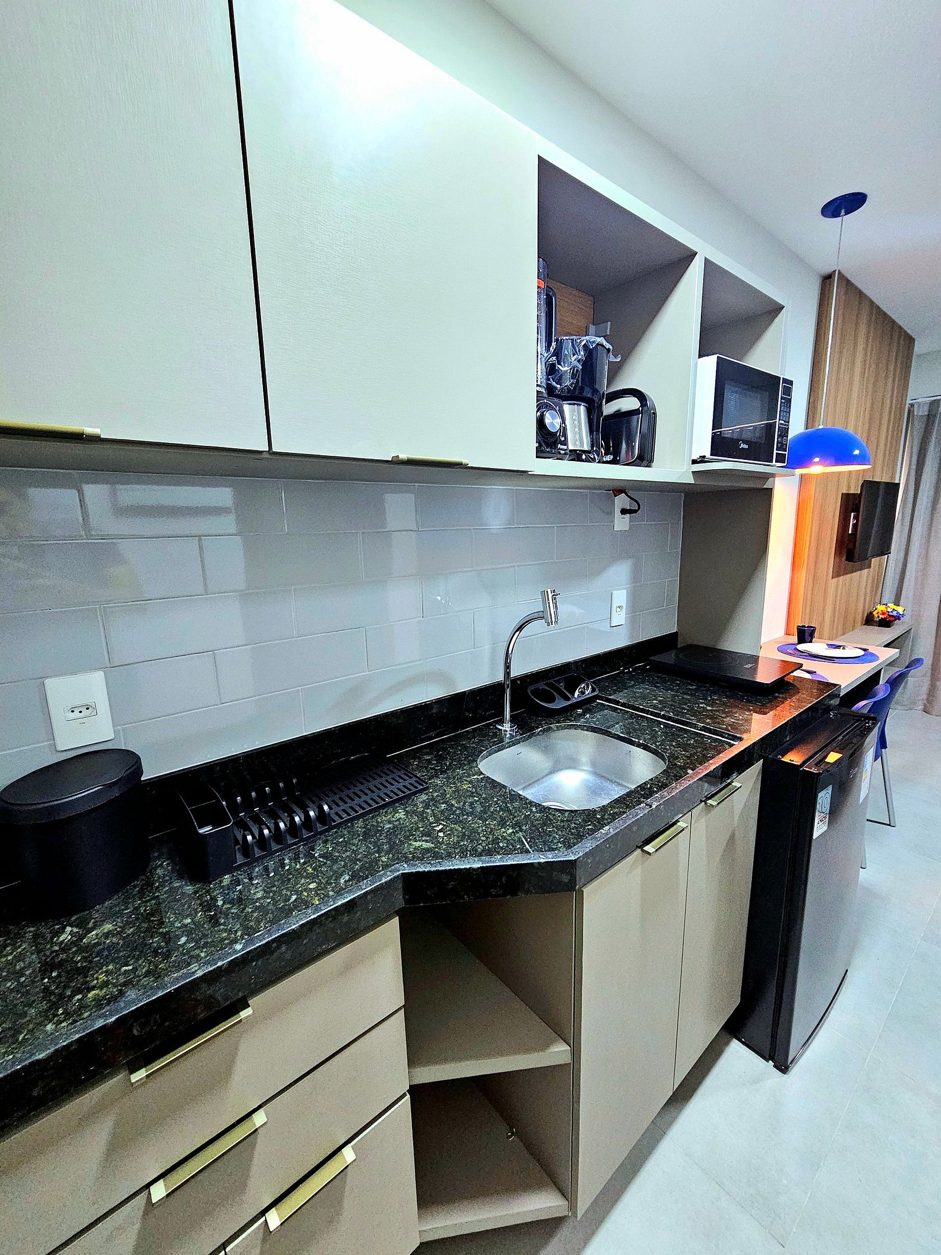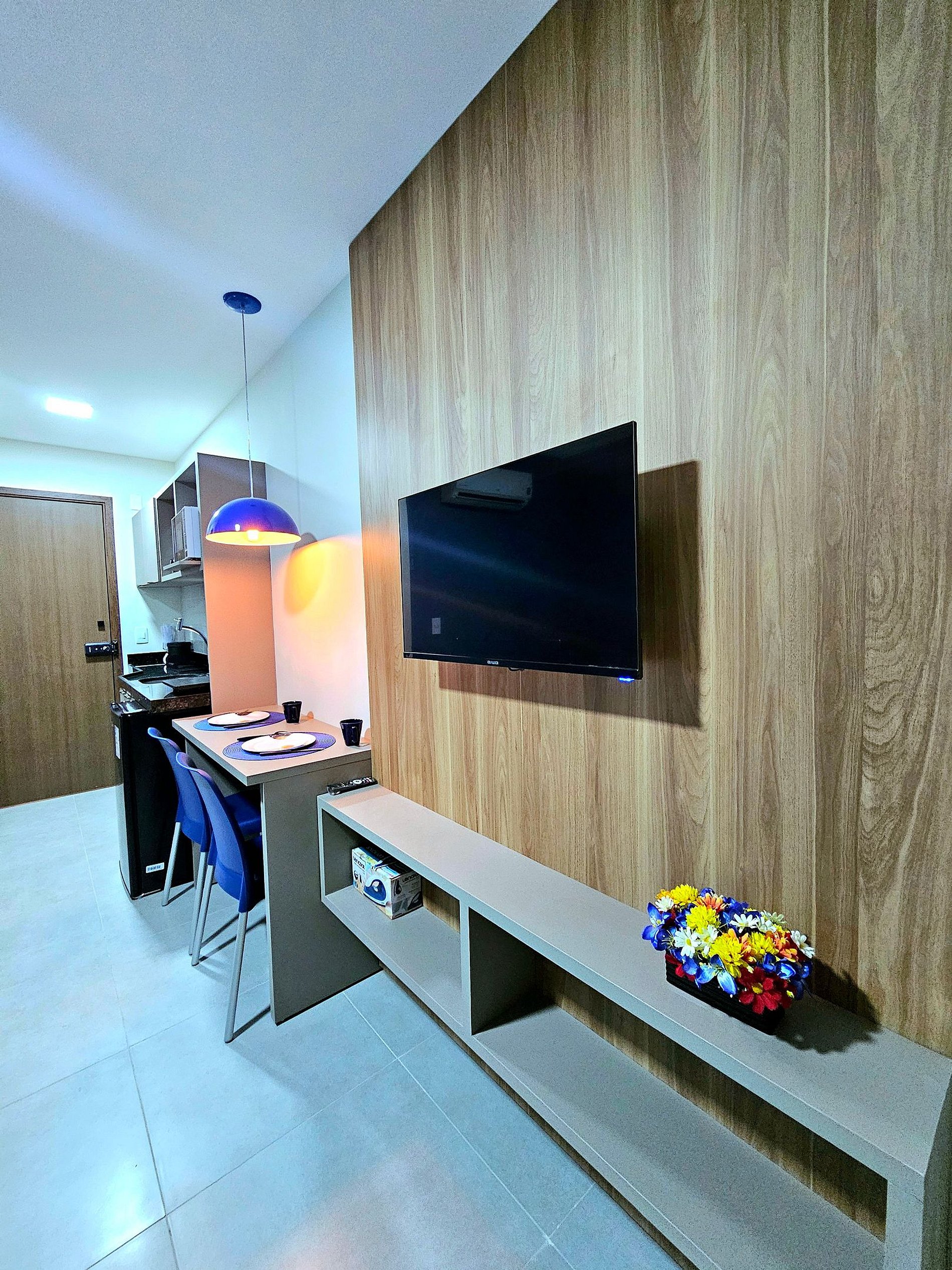 Decoração Moderna e Iluminação Planejada: A decoração do apartamento segue um estilo moderno e elegante, com detalhes em cores neutras e iluminação indireta que criam uma atmosfera aconchegante e sofisticada. As luzes estrategicamente posicionadas proporcionam um ambiente acolhedor, ideal tanto para momentos de relaxamento quanto para criar um clima especial durante suas noites no Ora Beach Residence.