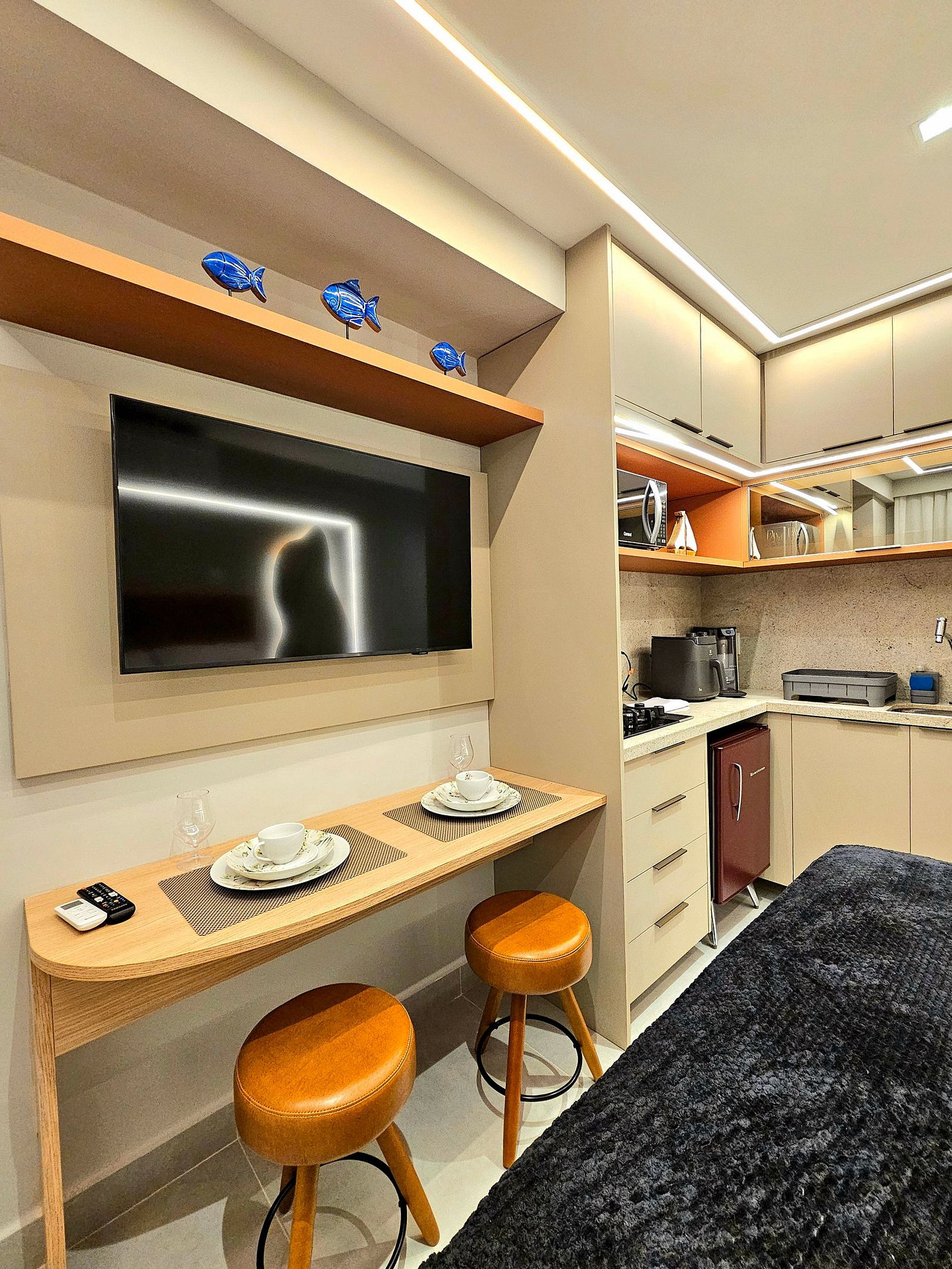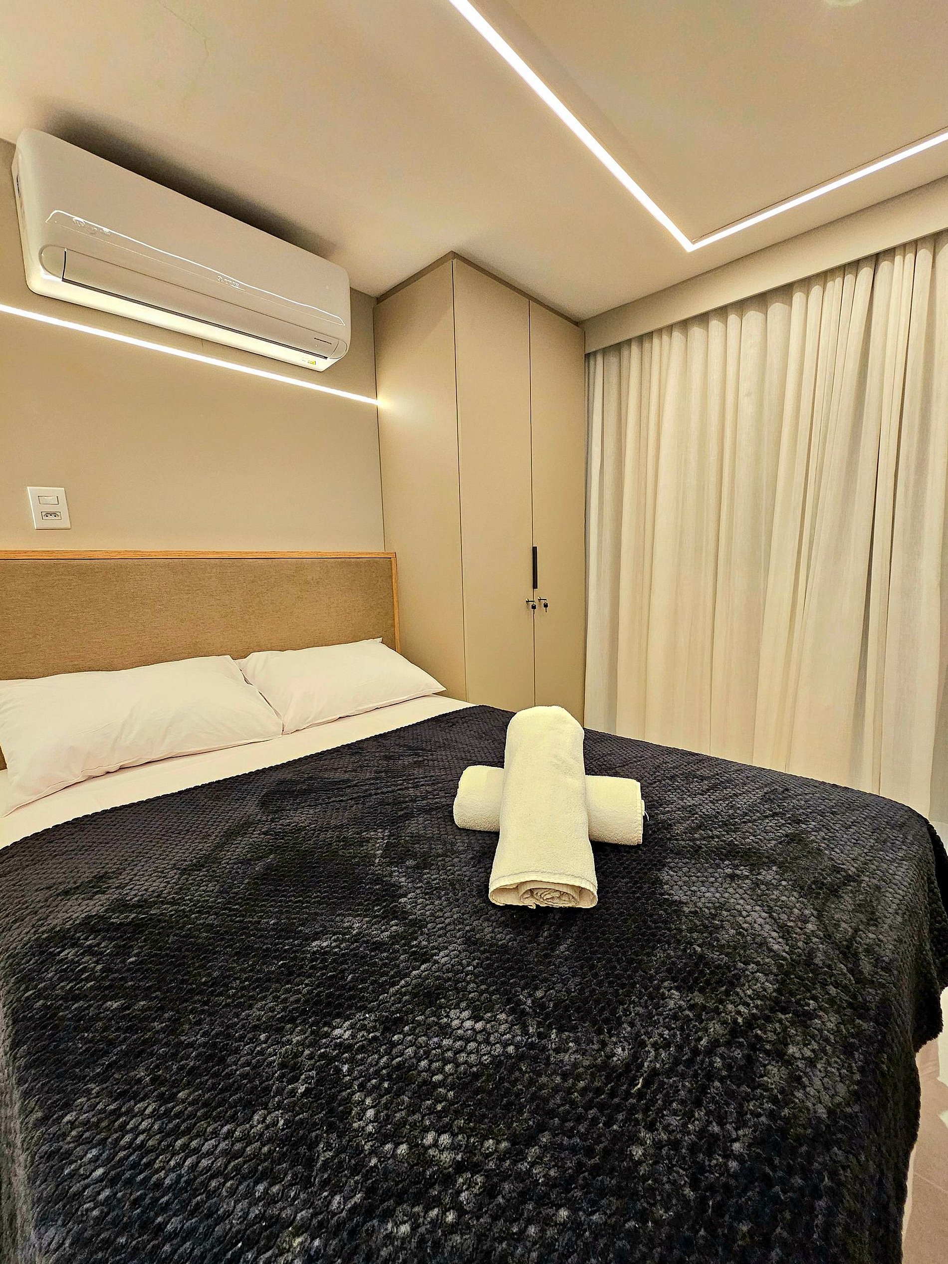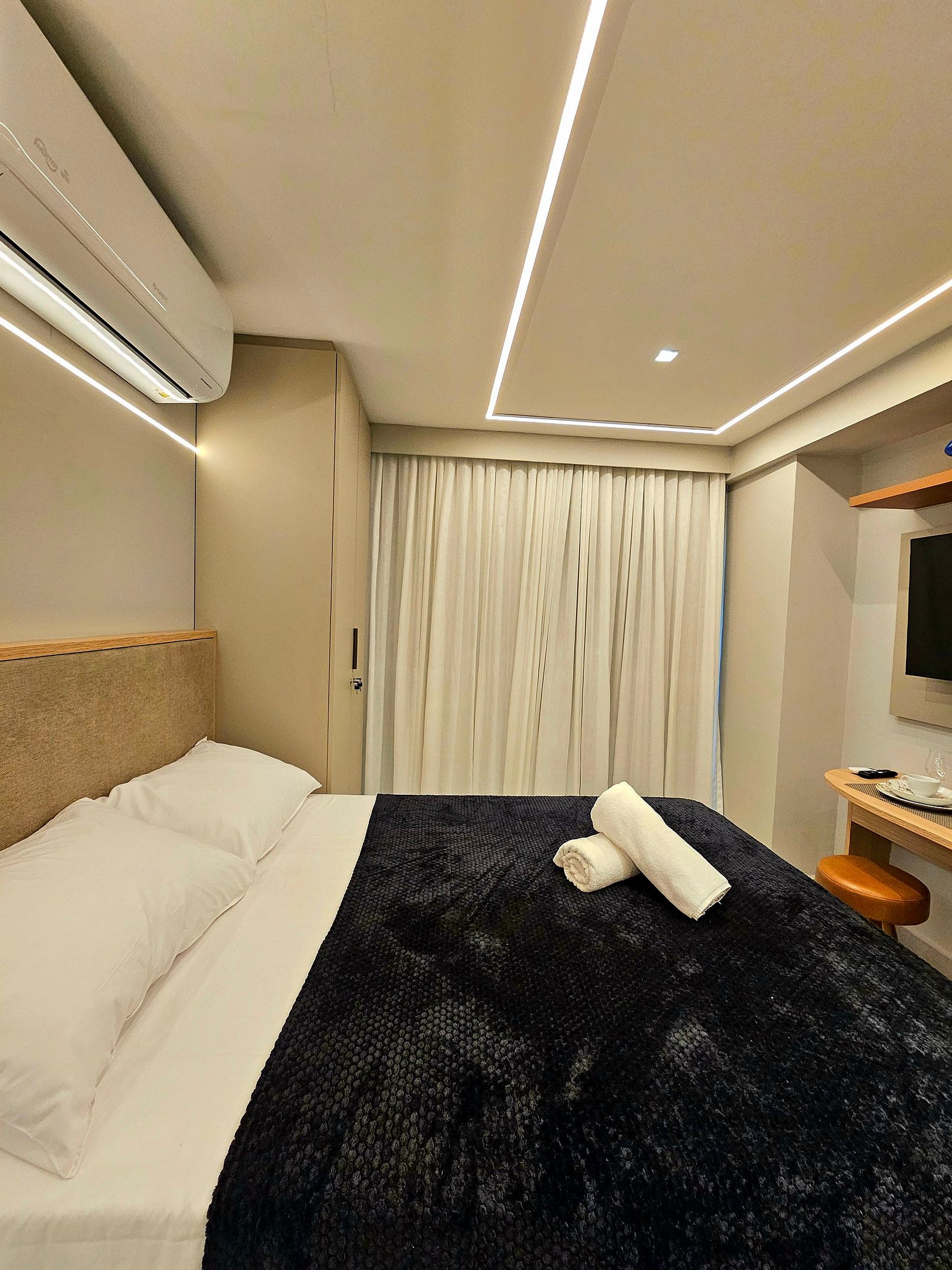 Conforto e Praticidade O studio acomoda confortavelmente até 3 hóspedes, dispondo de uma cama de casal e uma cama auxiliar. Cada elemento foi pensado para proporcionar o máximo de conforto e uma boa noite de sono.
