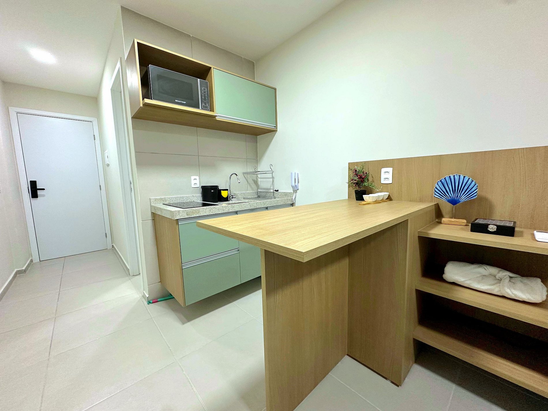 Nosso flat acomoda bem 2 pessoas com uma cama de casal extremamente confortável. O apartamento é novo, moderno e decorado proporcionando mais conforto e relaxamento na sua estadia. A cozinha é equipada com cooktop, micro-ondas, frigobar, panelas, copos, taças, pratos, talheres e todos os utensílios necessários para você fazer sua refeição.