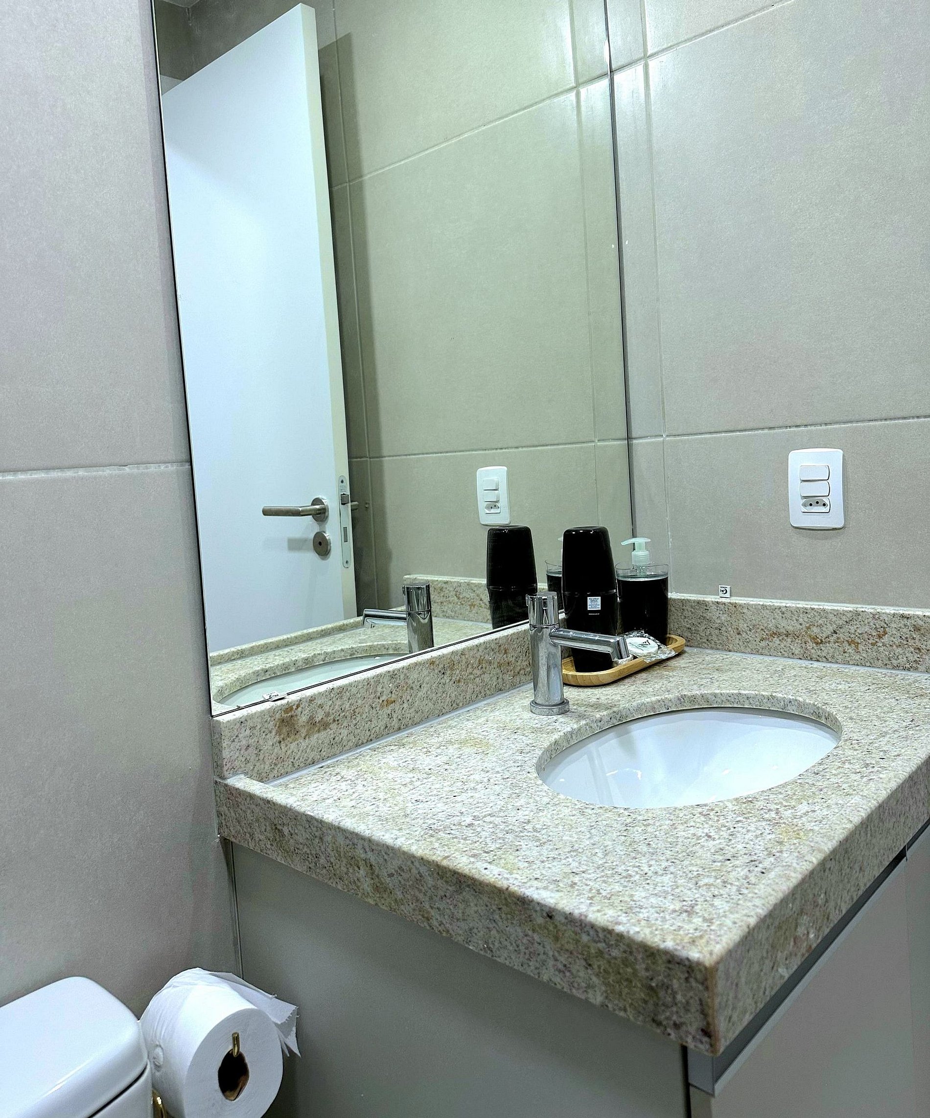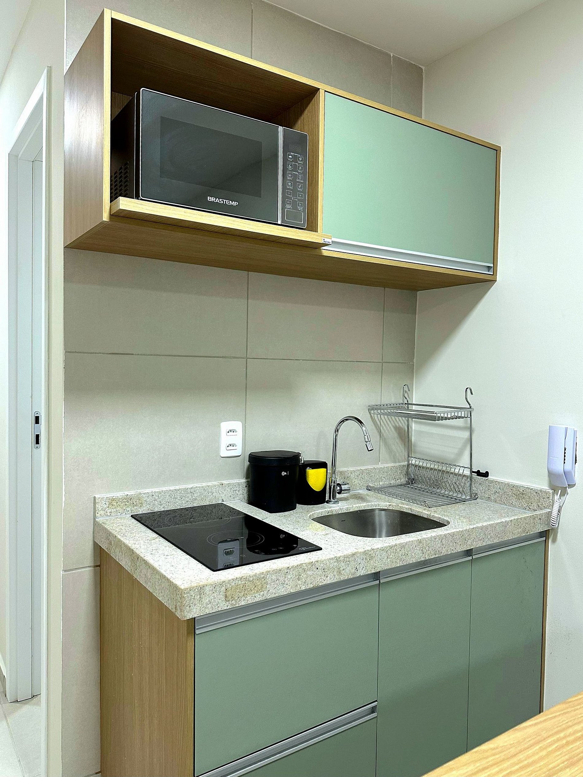 Nosso flat acomoda bem 2 pessoas com uma cama de casal extremamente confortável. O apartamento é novo, moderno e decorado proporcionando mais conforto e relaxamento na sua estadia. A cozinha é equipada com cooktop, micro-ondas, frigobar, panelas, copos, taças, pratos, talheres e todos os utensílios necessários para você fazer sua refeição.