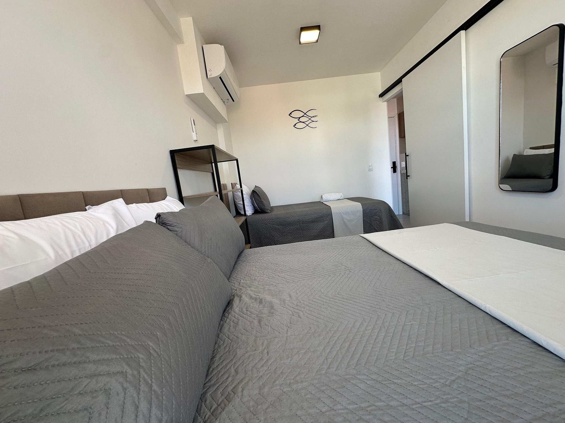 Nosso flat conta com apartamentos bem equipados, projetados para proporcionar a você o máximo de conforto. Cada unidade possui ar-condicionado, Wi-Fi gratuito, TV de tela plana e uma cozinha compacta, facilitando sua estadia. Descanse em camas confortáveis e aproveite os detalhes que tornam seu refúgio ainda mais especial.