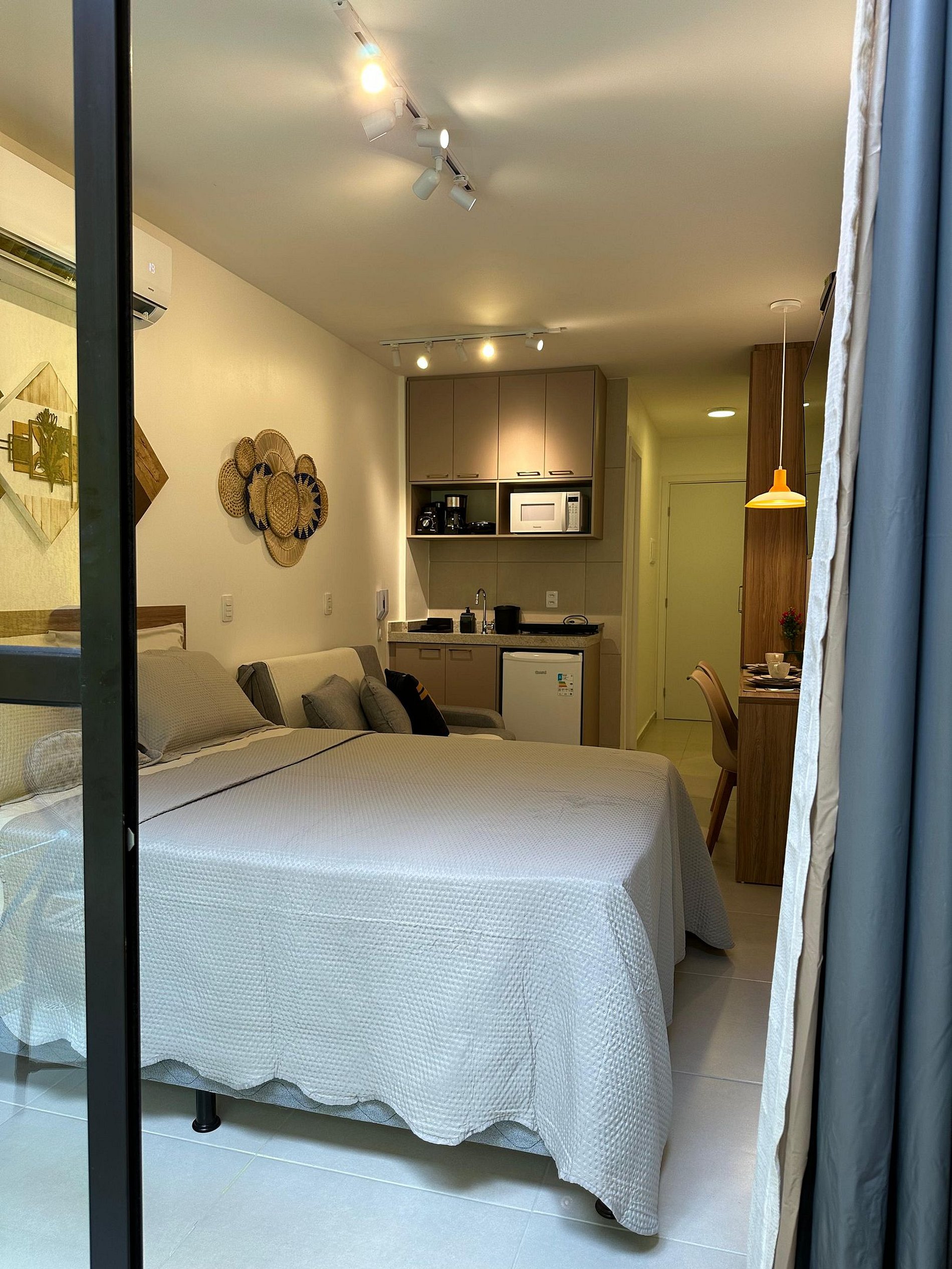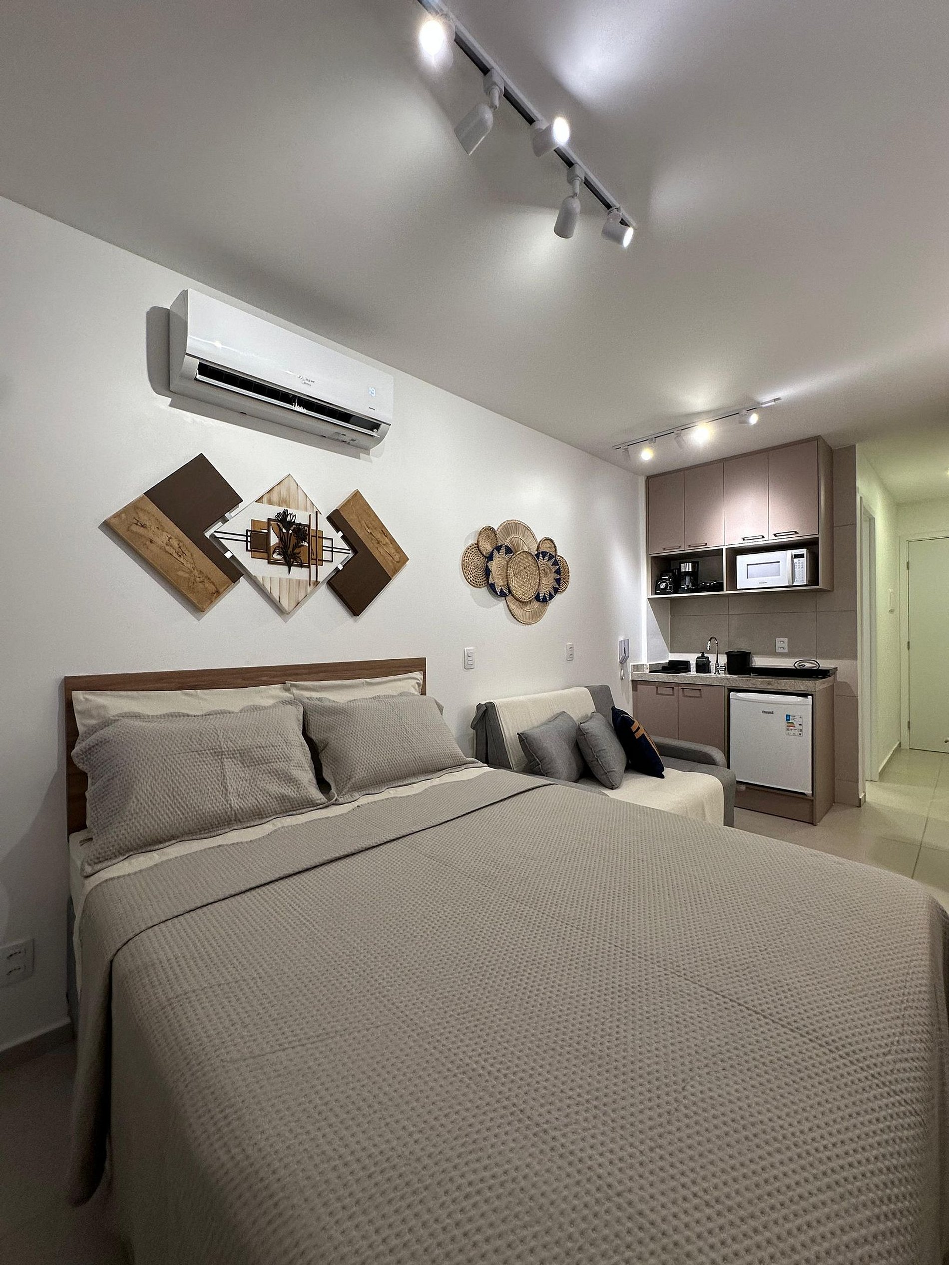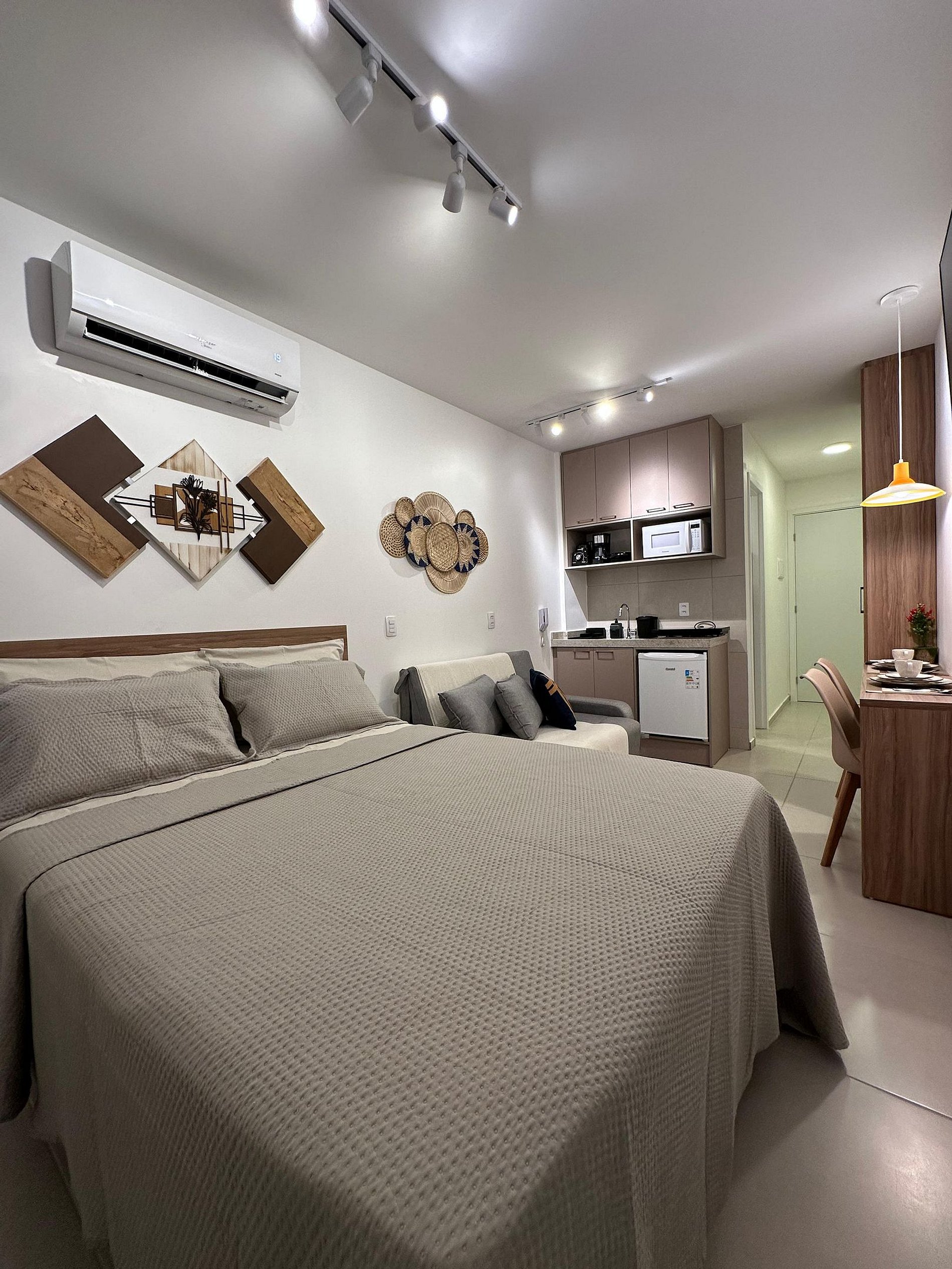 Nosso flat conta com apartamentos bem equipados, projetados para proporcionar a você o máximo de conforto. Cada unidade possui ar-condicionado, Wi-Fi gratuito, TV de tela plana e uma cozinha compacta, facilitando sua estadia. Descanse em camas confortáveis e aproveite os detalhes que tornam seu refúgio ainda mais especial.