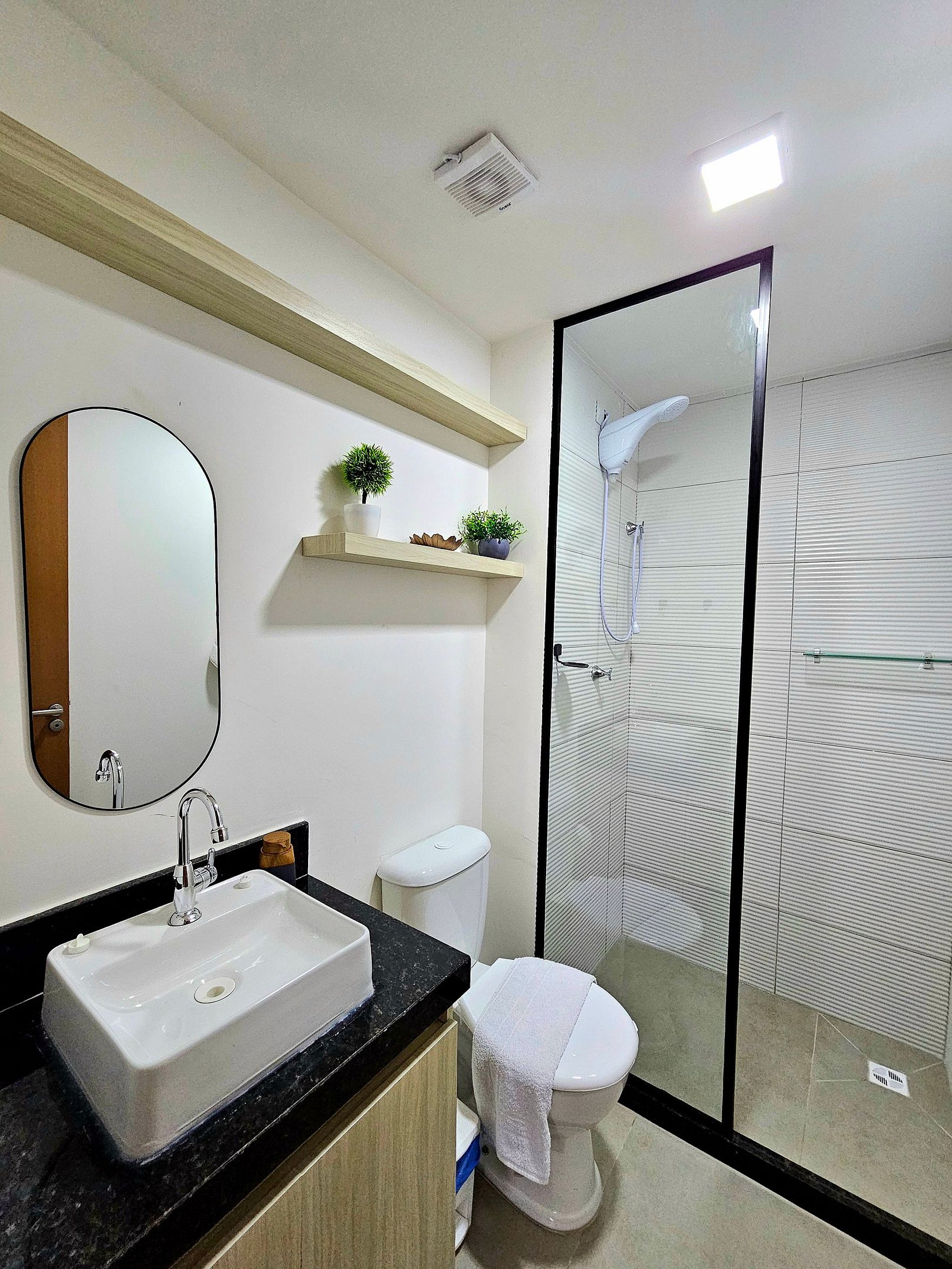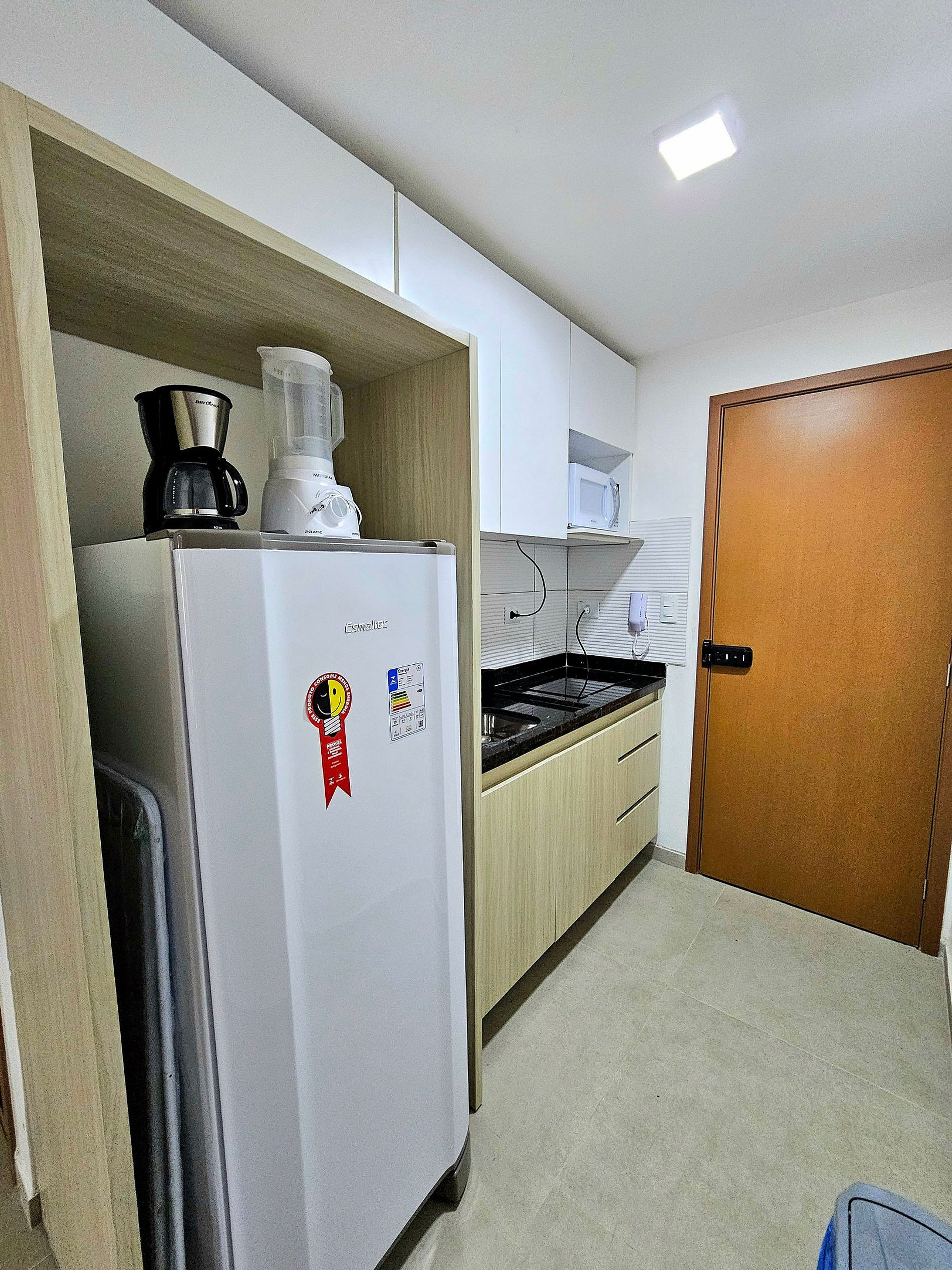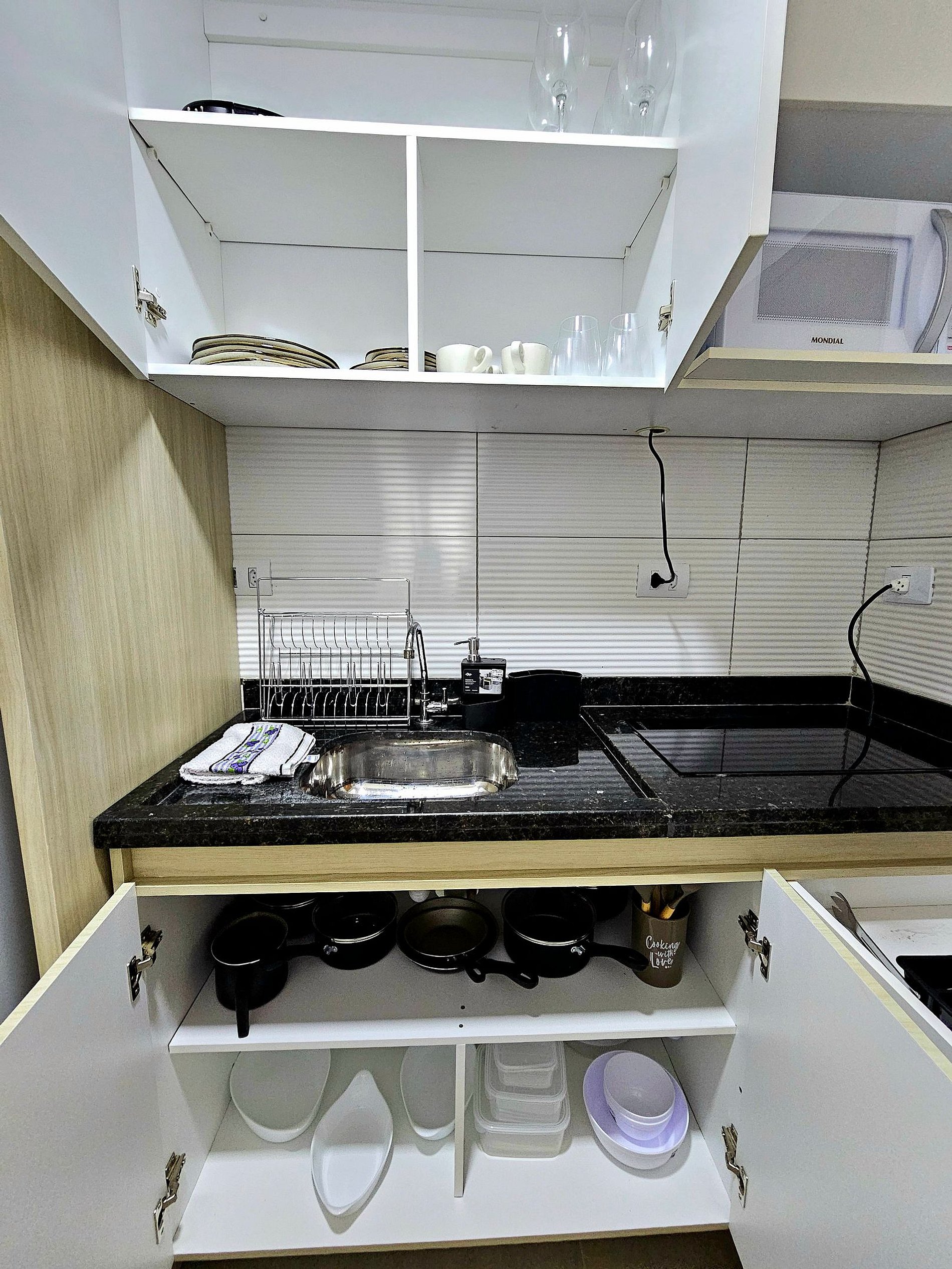 Nosso apartamento completo, muito bem montado com cozinha completamente equipada incluindo Cooktop, sanduicheira, cafeteira e liquidificador, garantindo que você tenha tudo o que precisa para preparar suas refeições com praticidade.